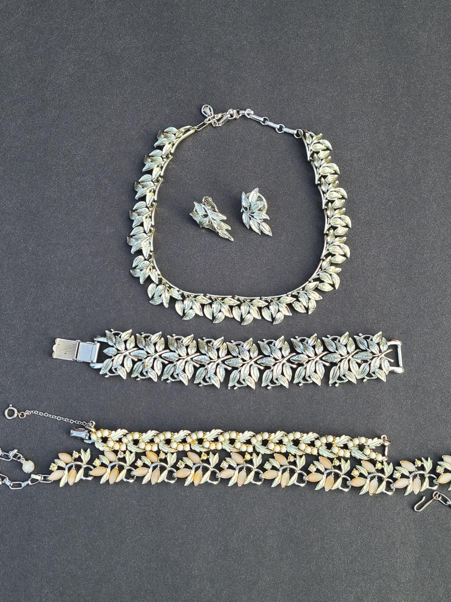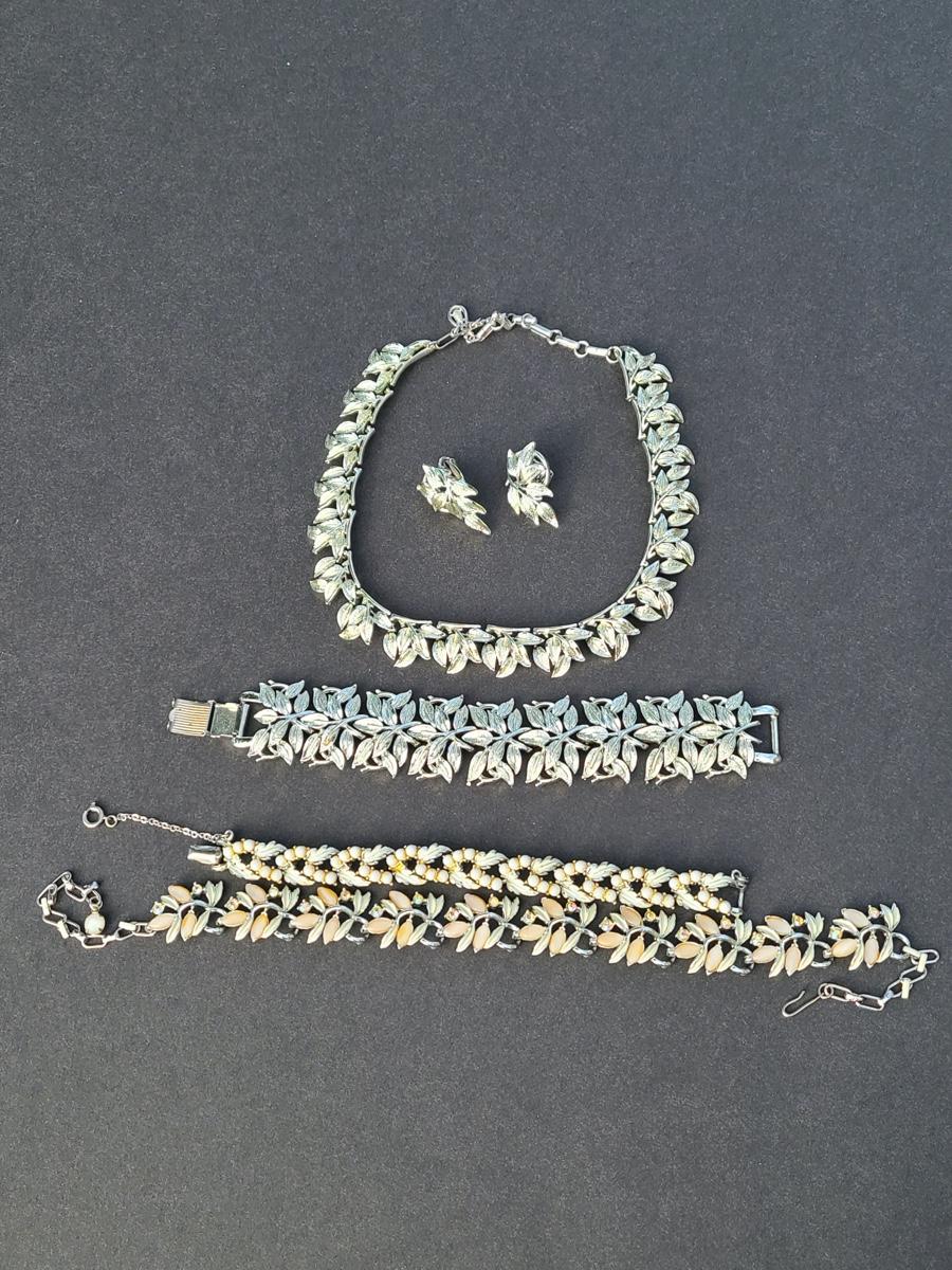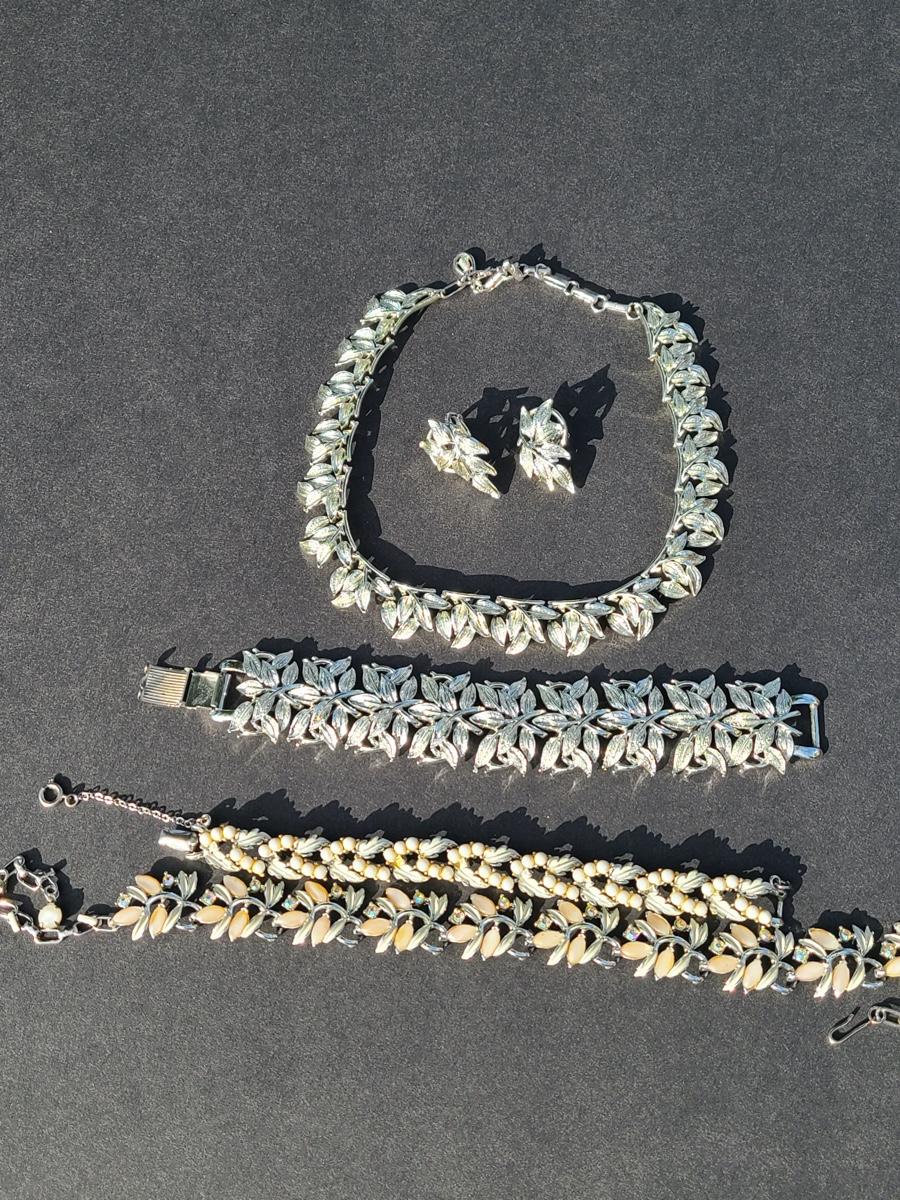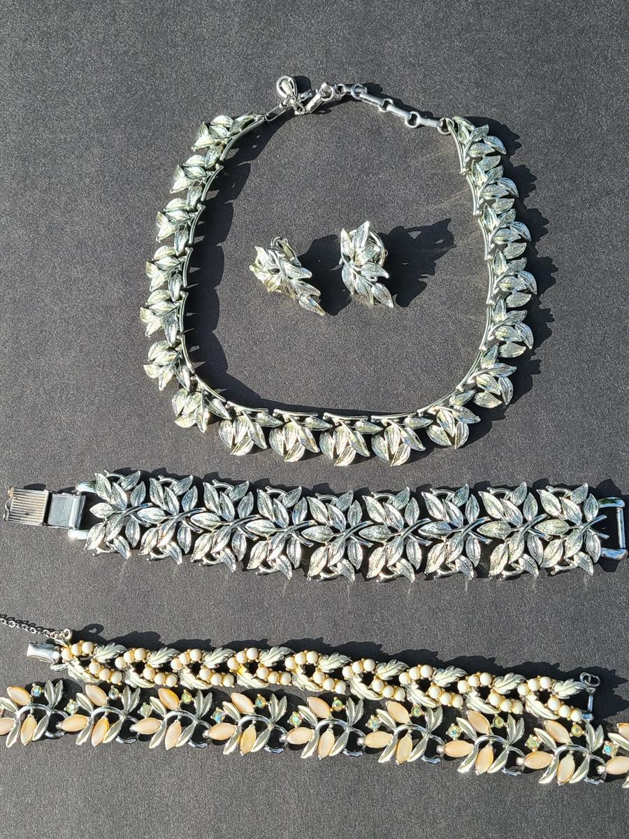 Gorgeous "chunky" Coro matching necklace, earrings, and bracelet set. These are marked. Also included are two unmarked vintage bracelets, one is a leaf motif pattern with faux pearl drops, and the other rhinestones and peachy pink accents. Please see all pictures as they are the best representation of the items. The pictures show condition, measurements if taken, and what is included in the lot. Due to the large amount that we photograph and the time frame, we are not always able to take measurements. All items unless noted, are pre-owned and have been used. If you purchased furniture, you must bring help. We do not allow one person to carry large furniture out on their own. Bring help, tools and a truck for the safety of our client’s homes, and your personal safety. Company policy. Thank you..