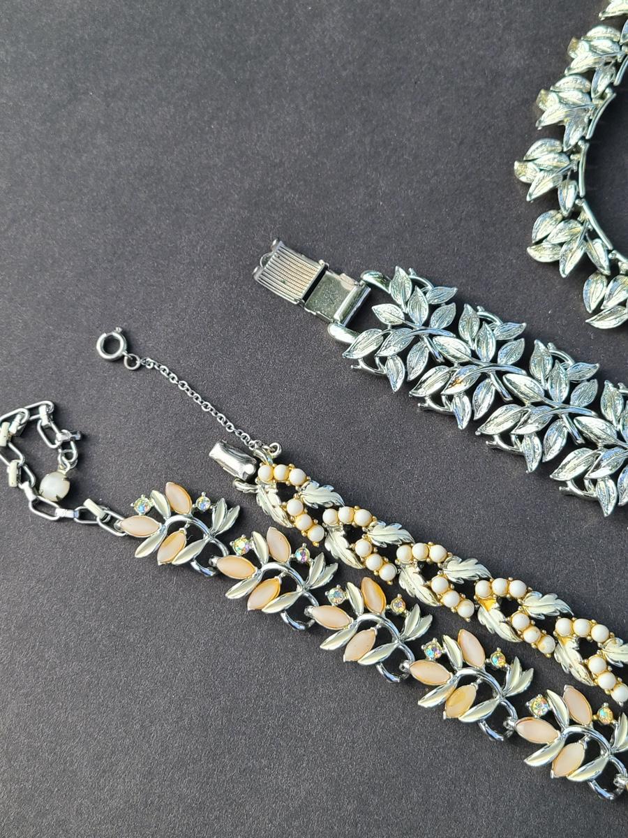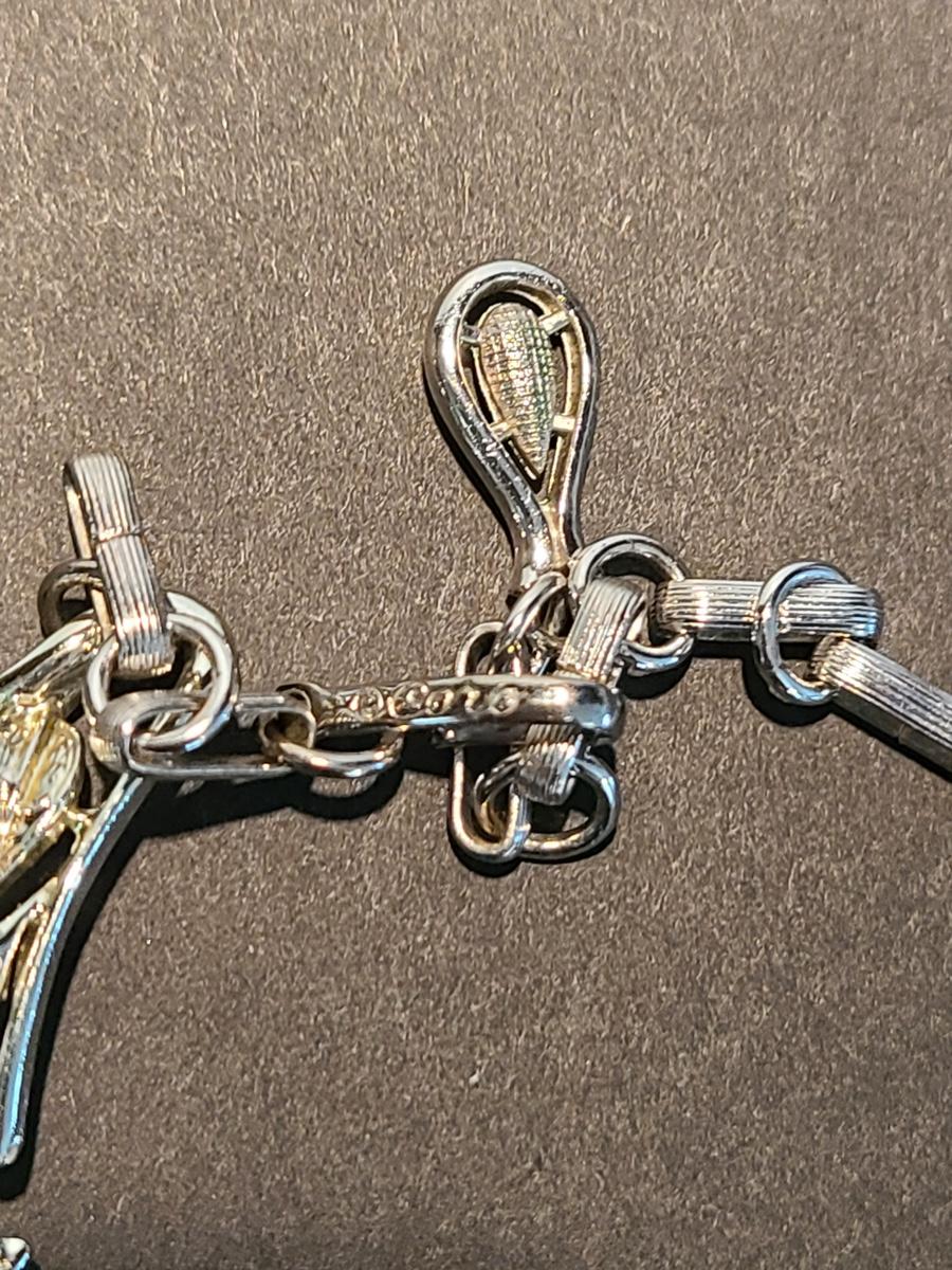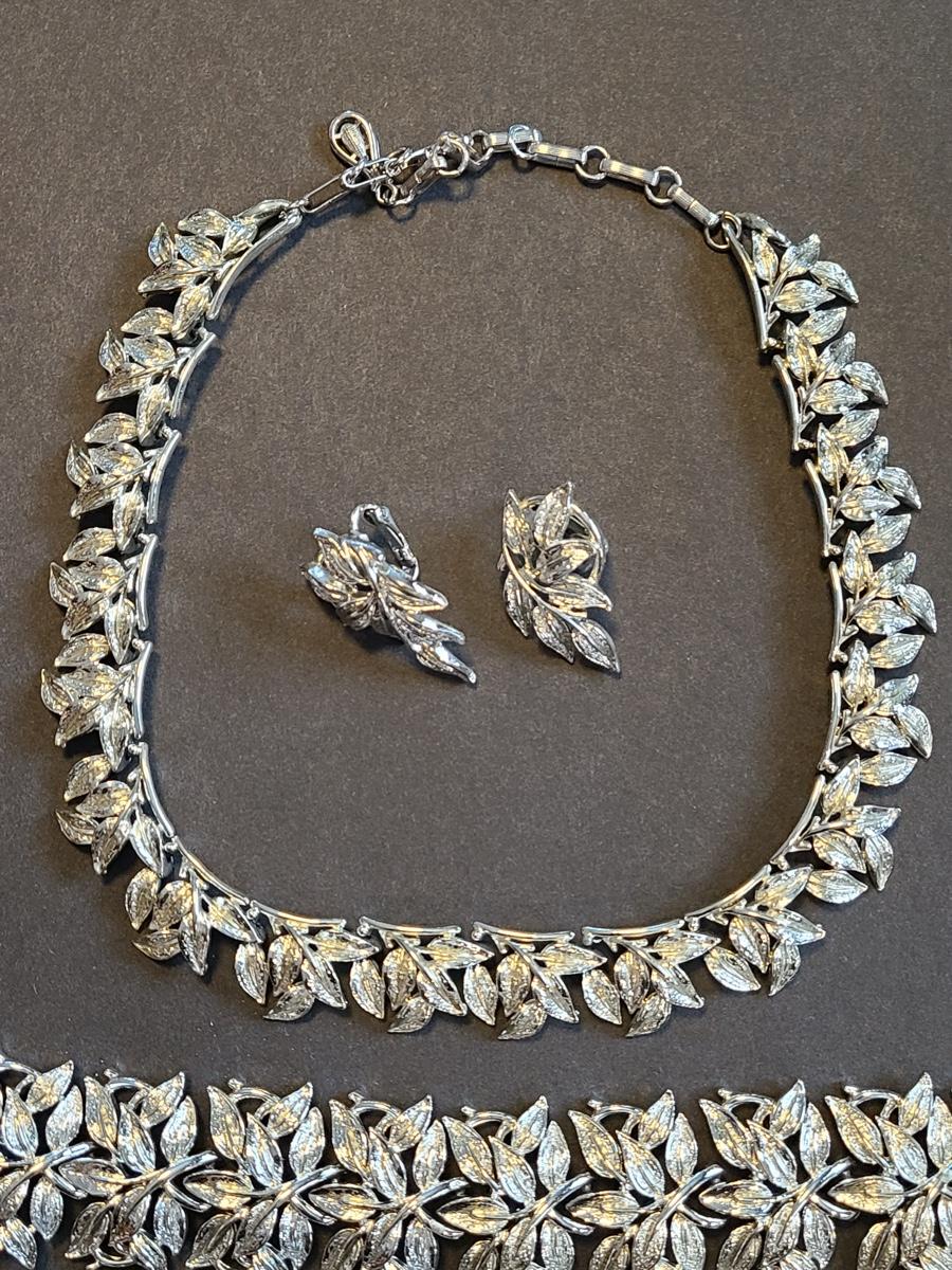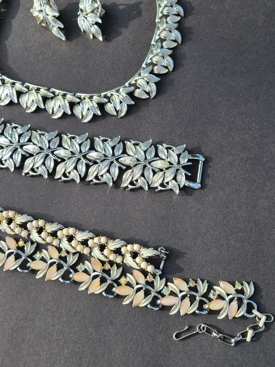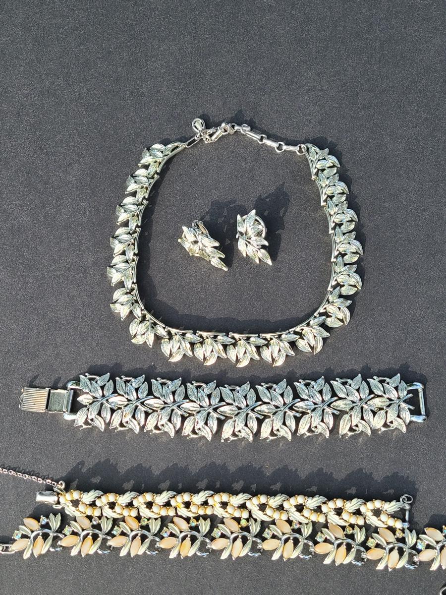 Gorgeous "chunky" Coro matching necklace, earrings, and bracelet set. These are marked. Also included are two unmarked vintage bracelets, one is a leaf motif pattern with faux pearl drops, and the other rhinestones and peachy pink accents. Please see all pictures as they are the best representation of the items. The pictures show condition, measurements if taken, and what is included in the lot. Due to the large amount that we photograph and the time frame, we are not always able to take measurements. All items unless noted, are pre-owned and have been used. If you purchased furniture, you must bring help. We do not allow one person to carry large furniture out on their own. Bring help, tools and a truck for the safety of our client’s homes, and your personal safety. Company policy. Thank you..