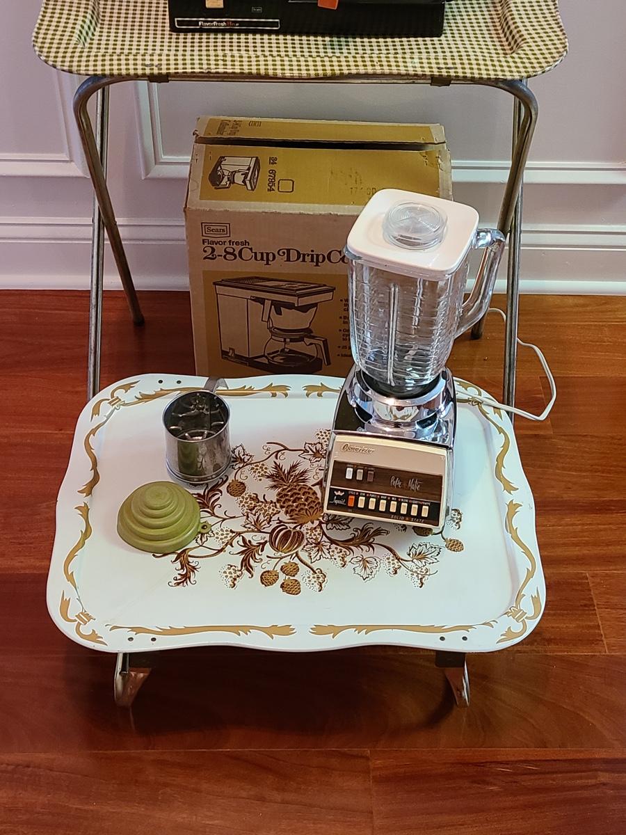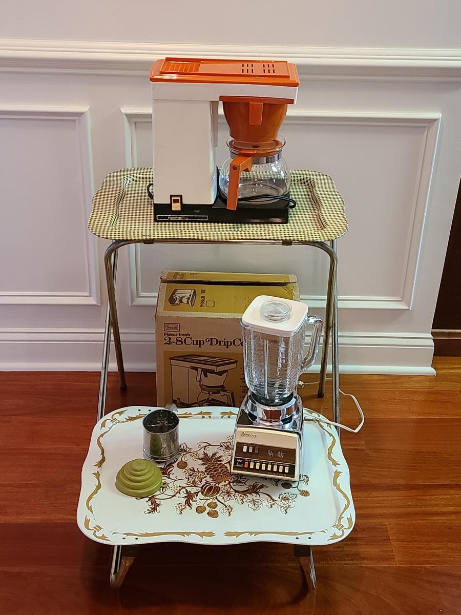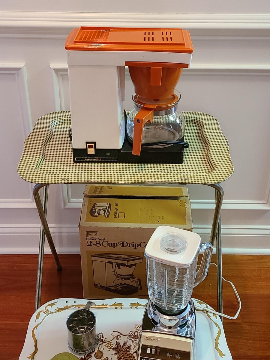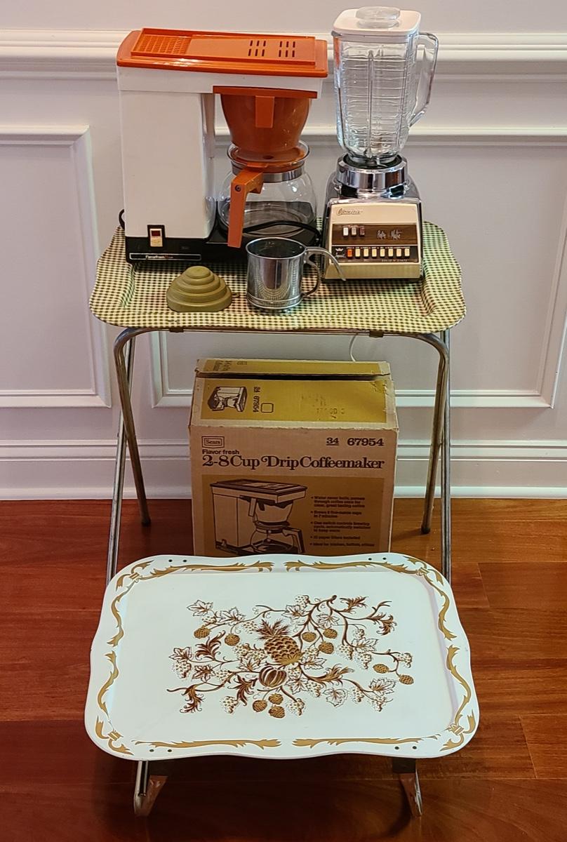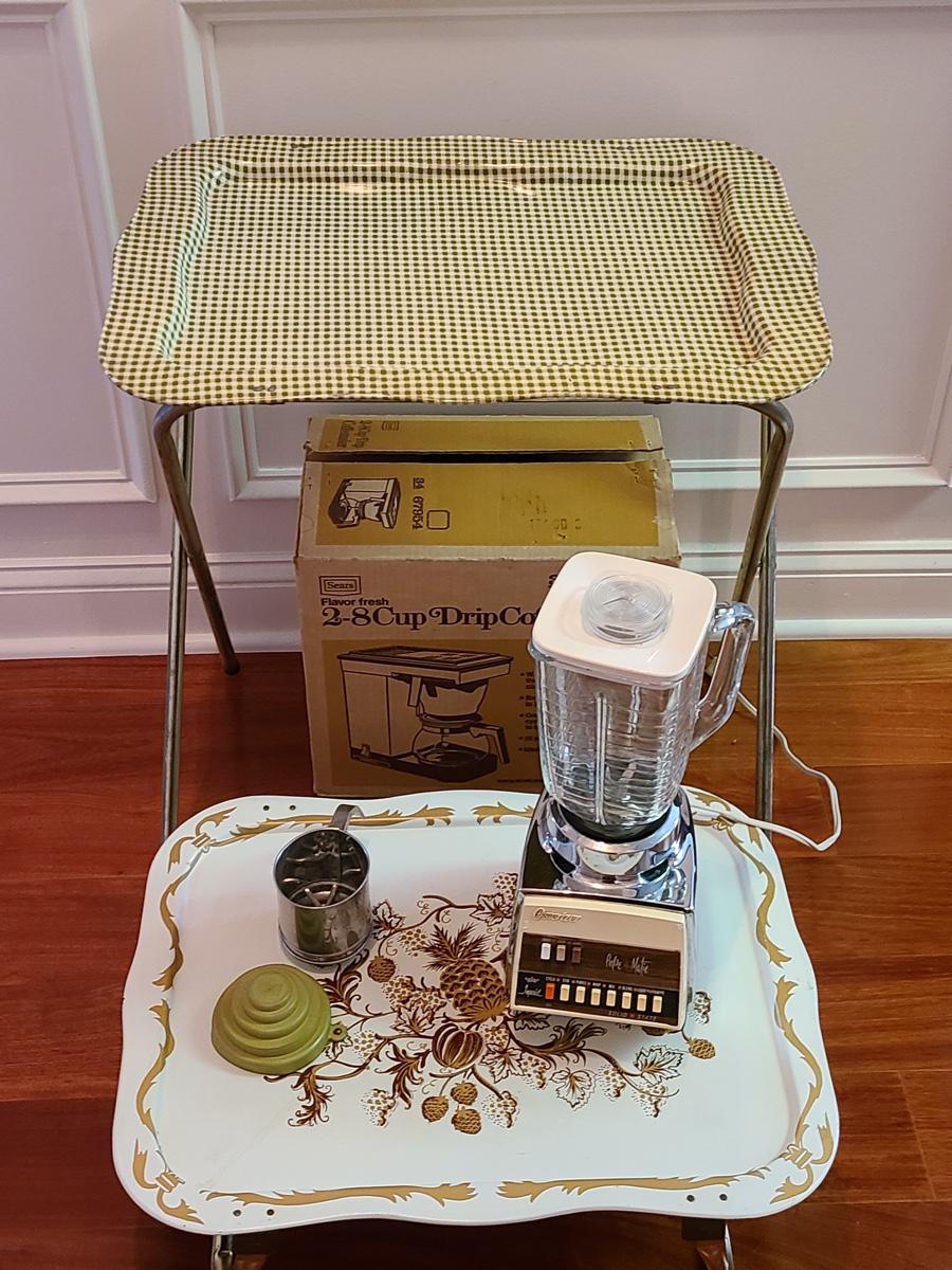 Lot 505: Vintage MCM Kitchen Lot: Metal Serving Trays, Coffee Maker, Chrome Blender and More