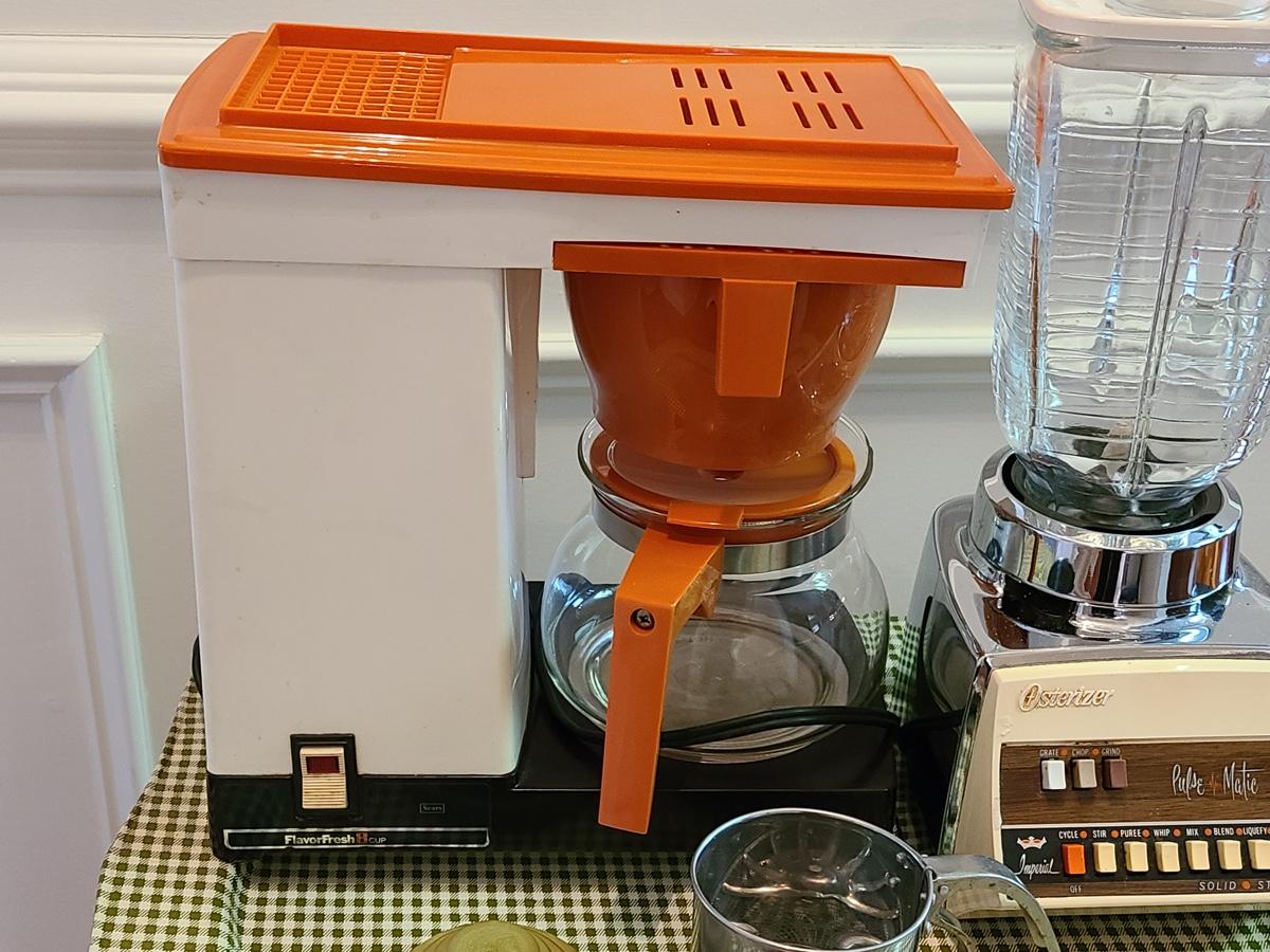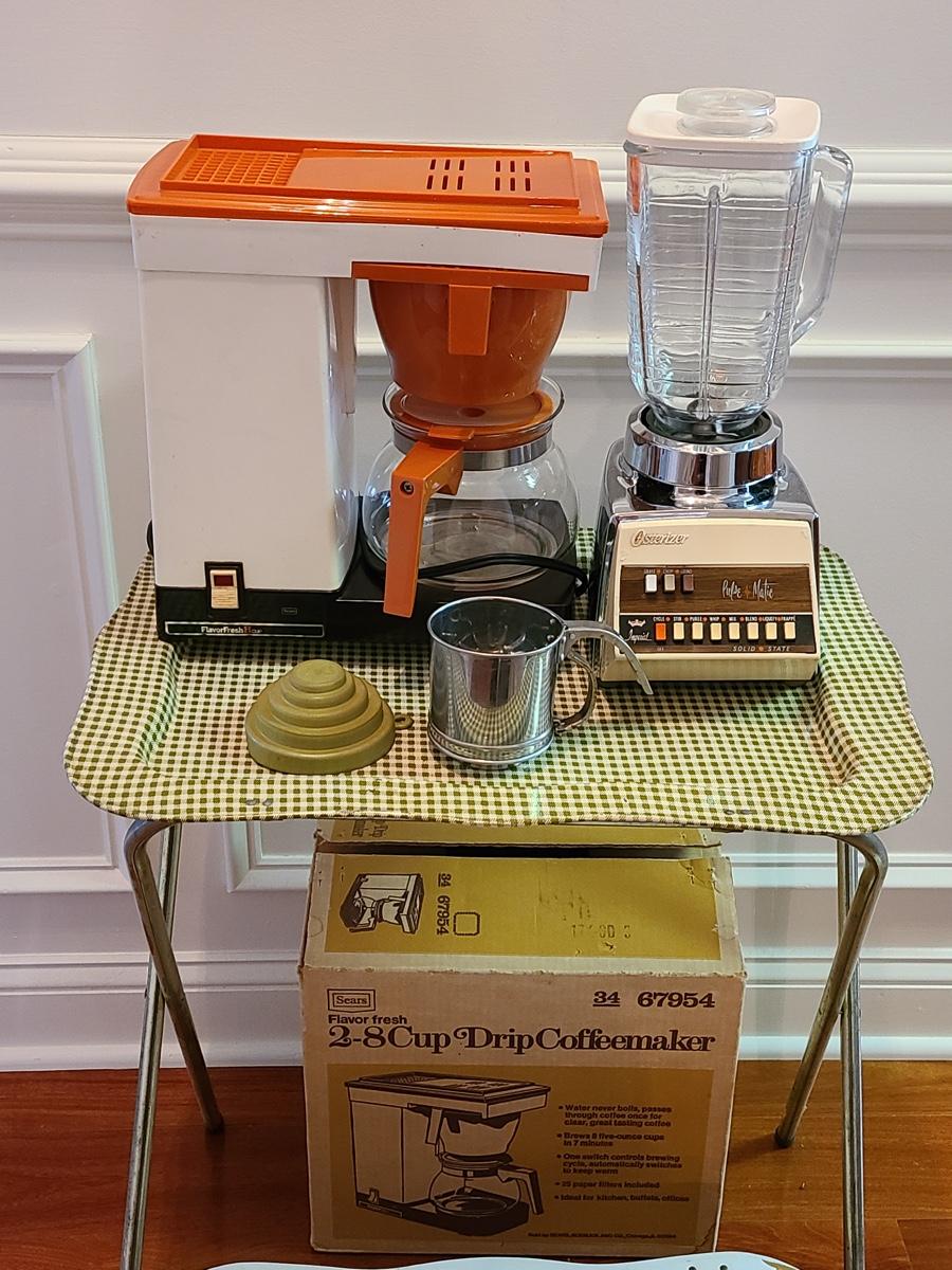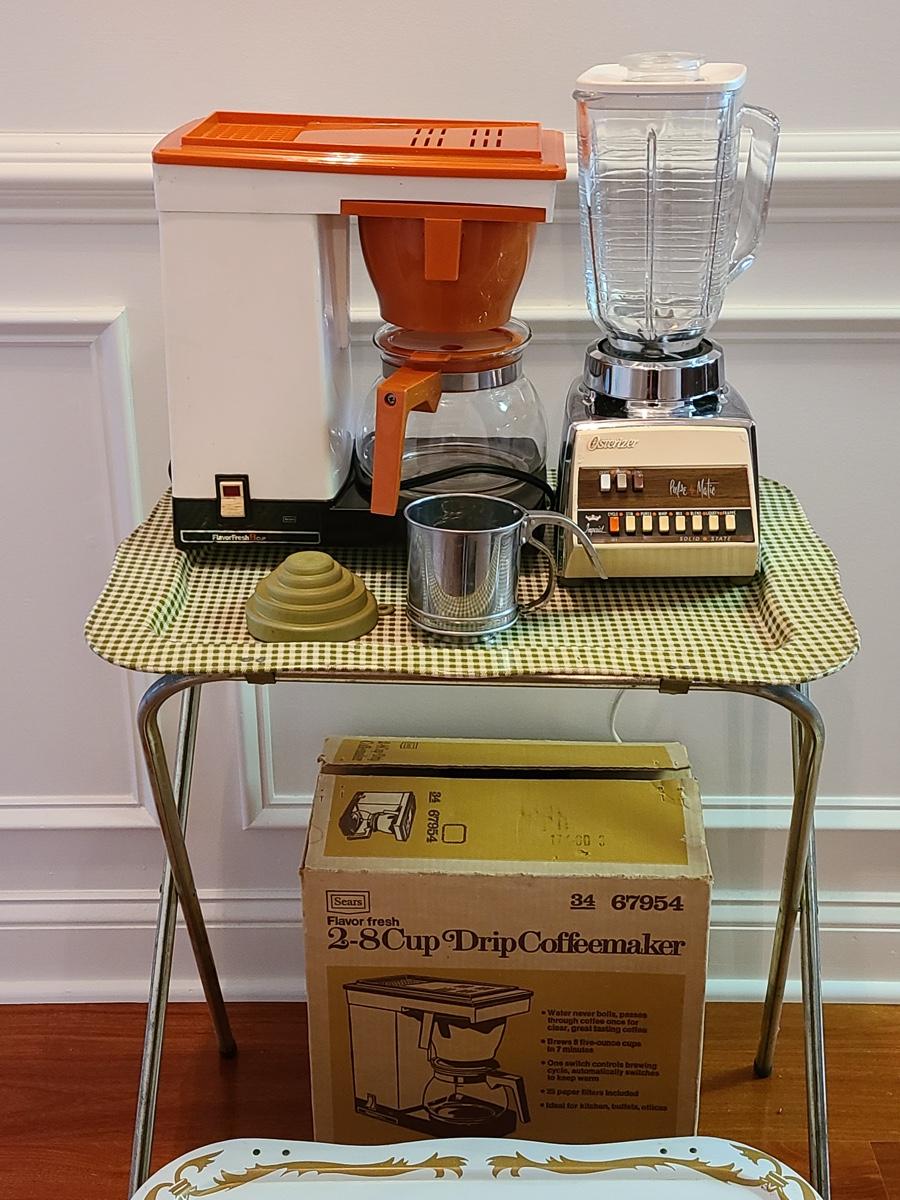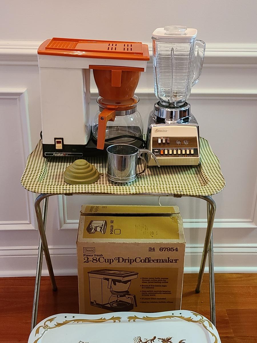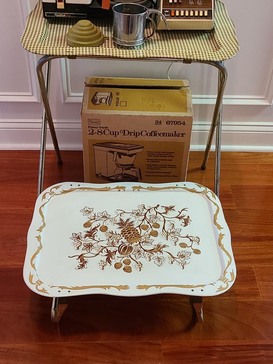 Lot 505: Vintage MCM Kitchen Lot: Metal Serving Trays, Coffee Maker, Chrome Blender and More