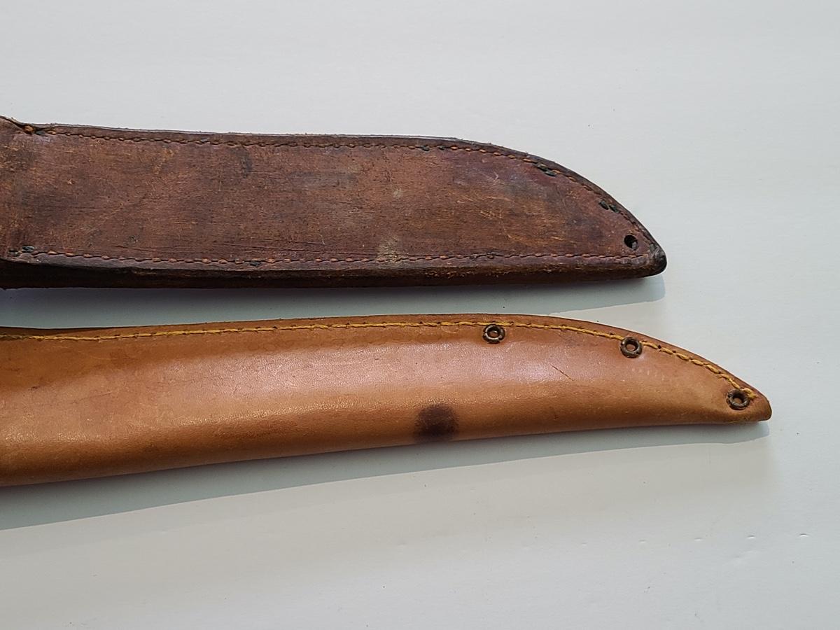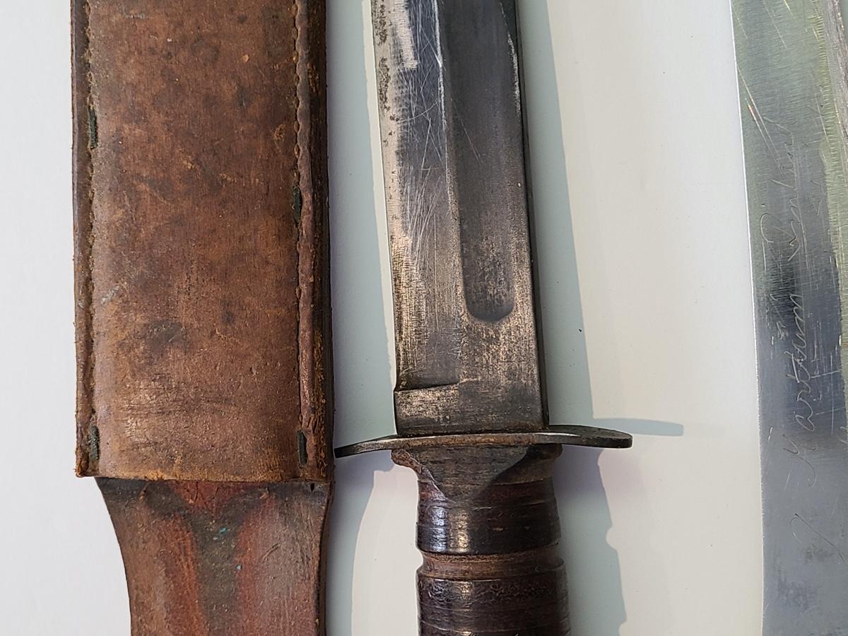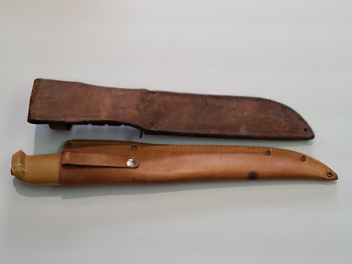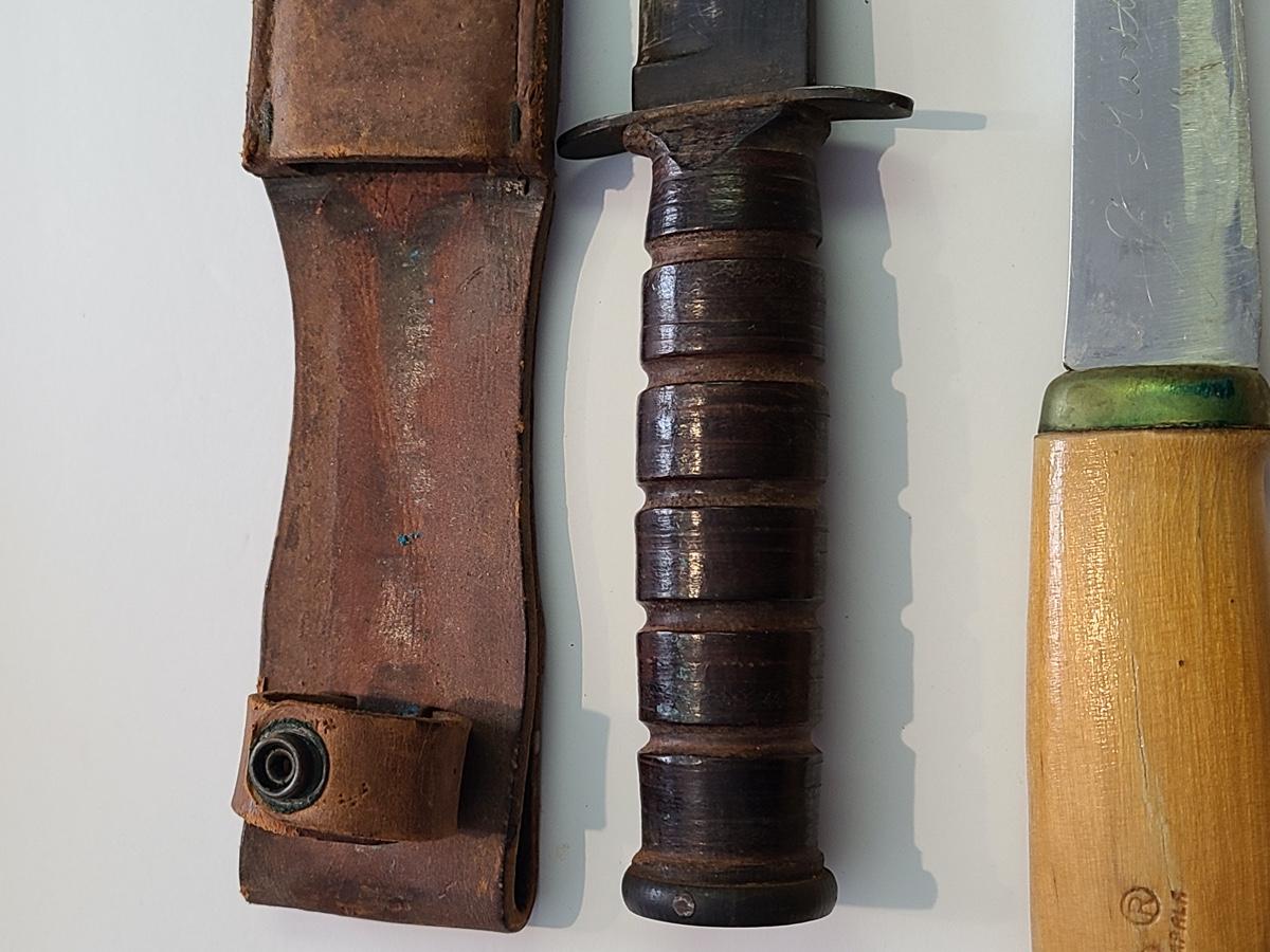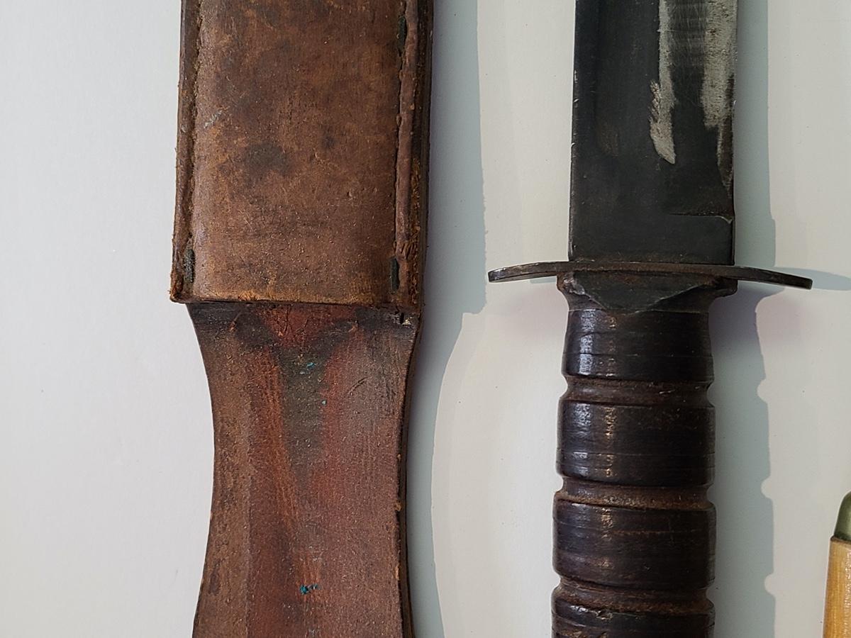 Two vintage knives. Each show conditions issues. The hunting knife is very sharp, so we did not try to clean the blade. Please see all pictures as they are the best representation of the items. The pictures show condition, measurements if taken, and what is included in the lot. Due to the large amount that we photograph and the time frame, we are not always able to take measurements. All items unless noted, are pre-owned and have been used. If you purchased furniture, you must bring help. We do not allow one person to carry large furniture out on their own. Bring help, tools and a truck for the safety of our client’s homes, and your personal safety. Company policy. Thank you.