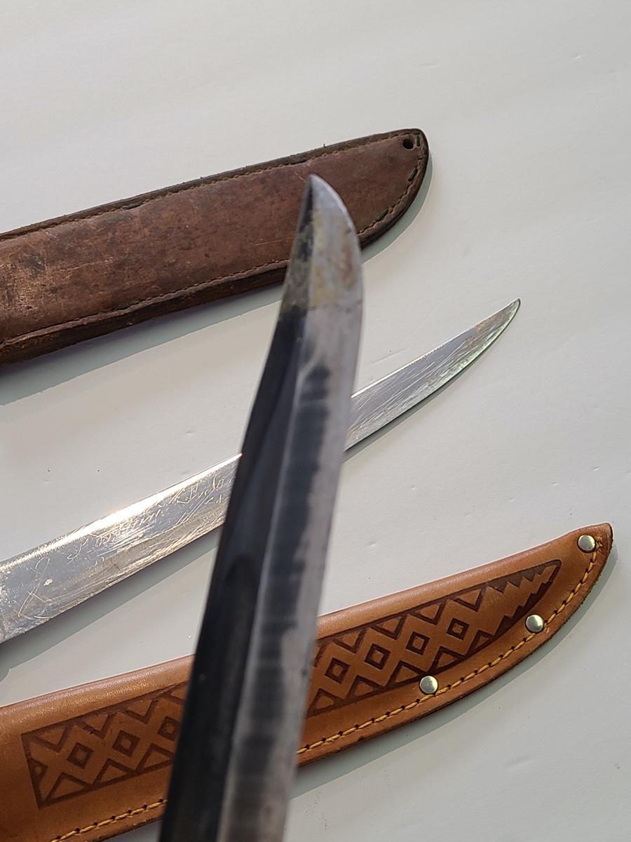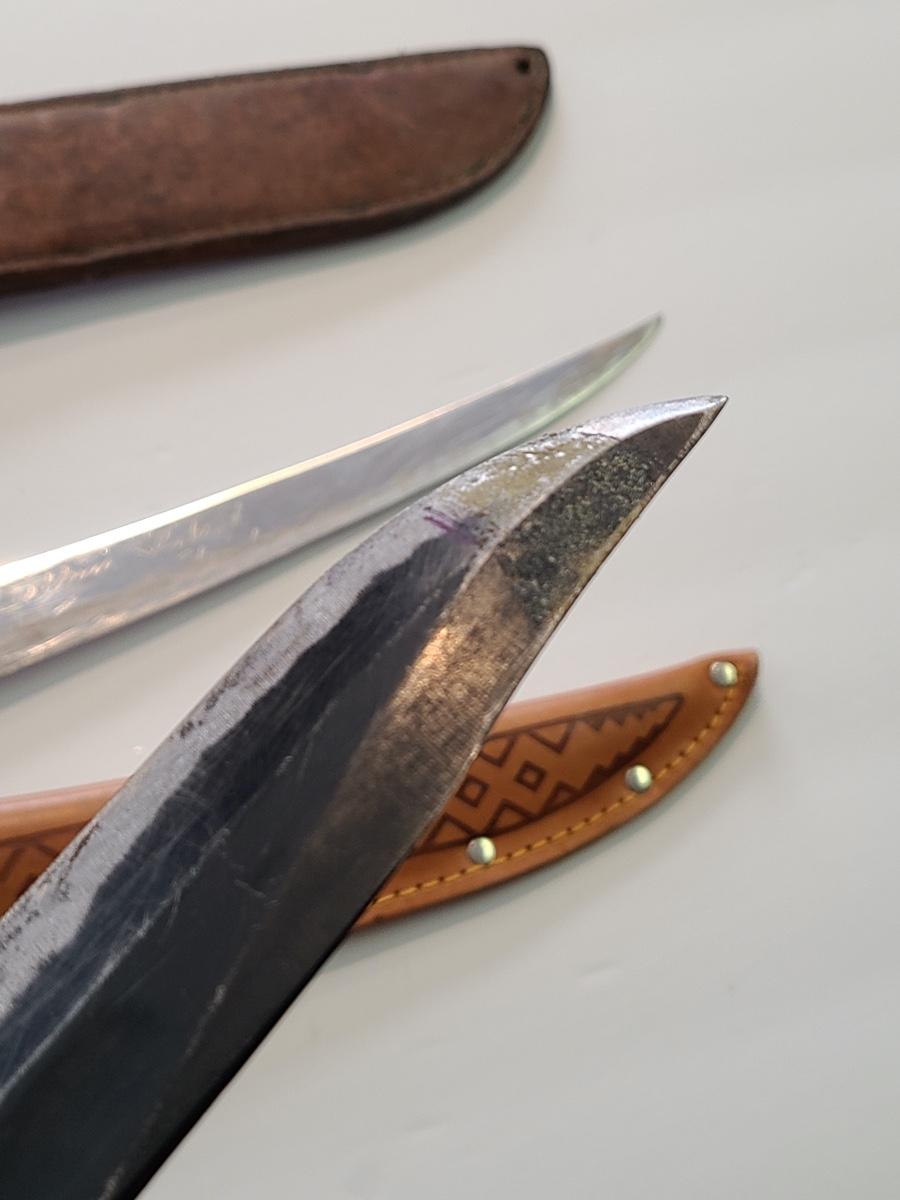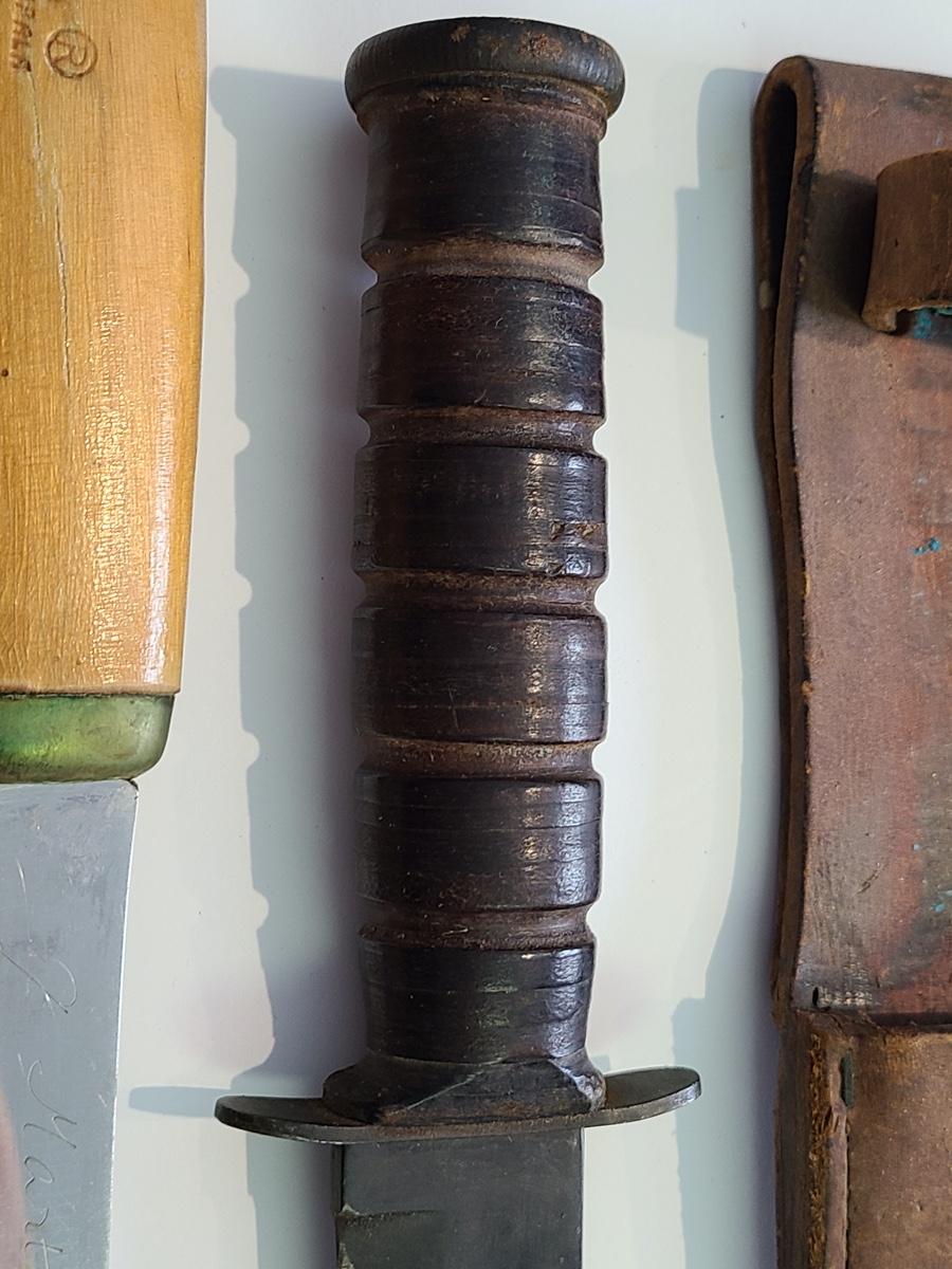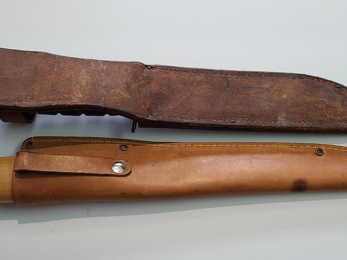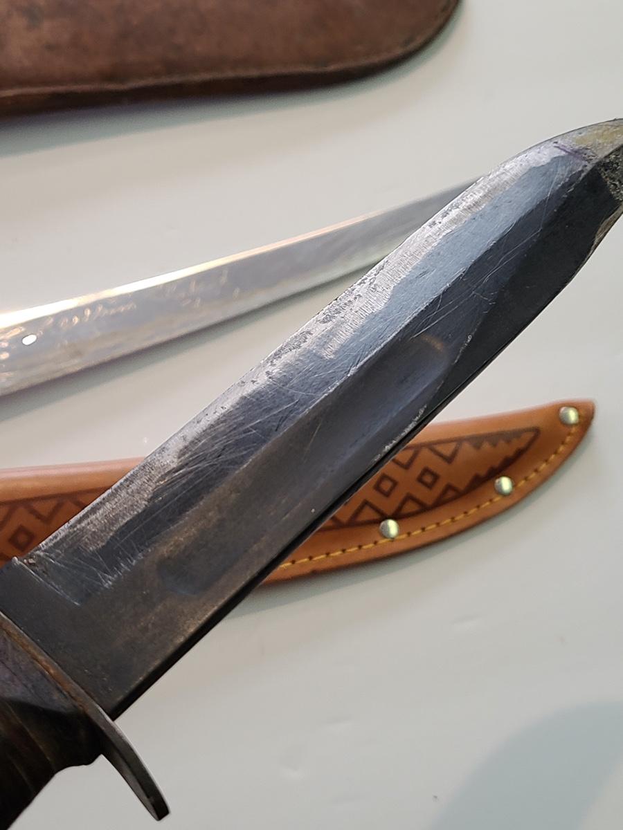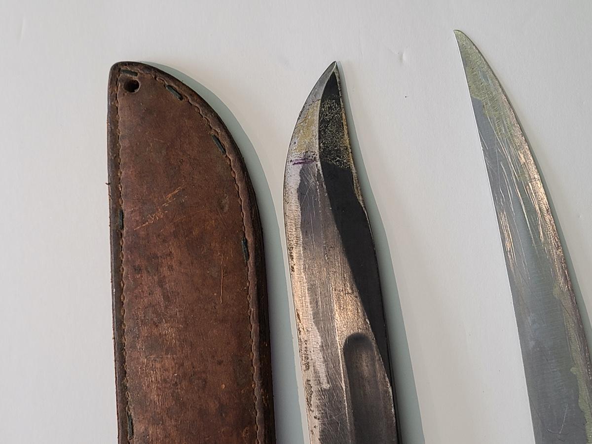 Two vintage knives. Each show conditions issues. The hunting knife is very sharp, so we did not try to clean the blade. Please see all pictures as they are the best representation of the items. The pictures show condition, measurements if taken, and what is included in the lot. Due to the large amount that we photograph and the time frame, we are not always able to take measurements. All items unless noted, are pre-owned and have been used. If you purchased furniture, you must bring help. We do not allow one person to carry large furniture out on their own. Bring help, tools and a truck for the safety of our client’s homes, and your personal safety. Company policy. Thank you.