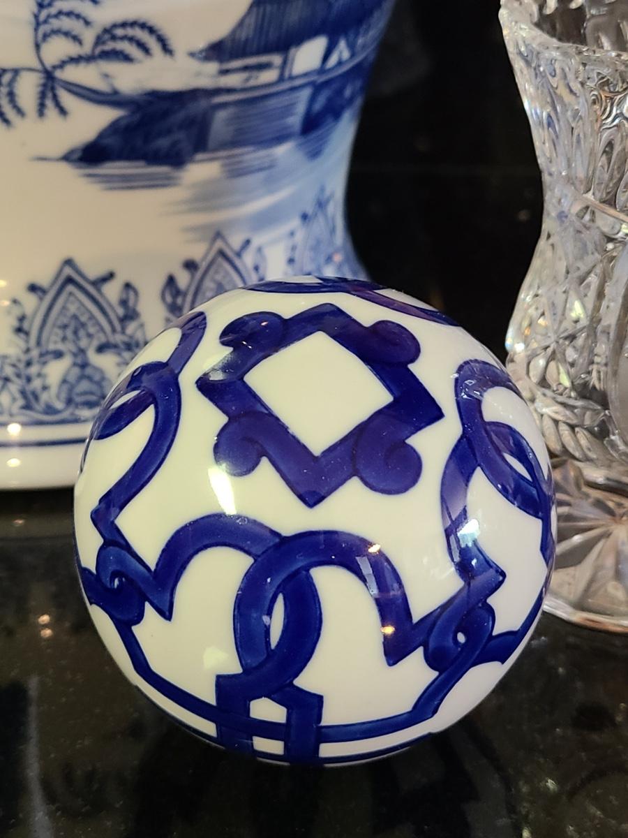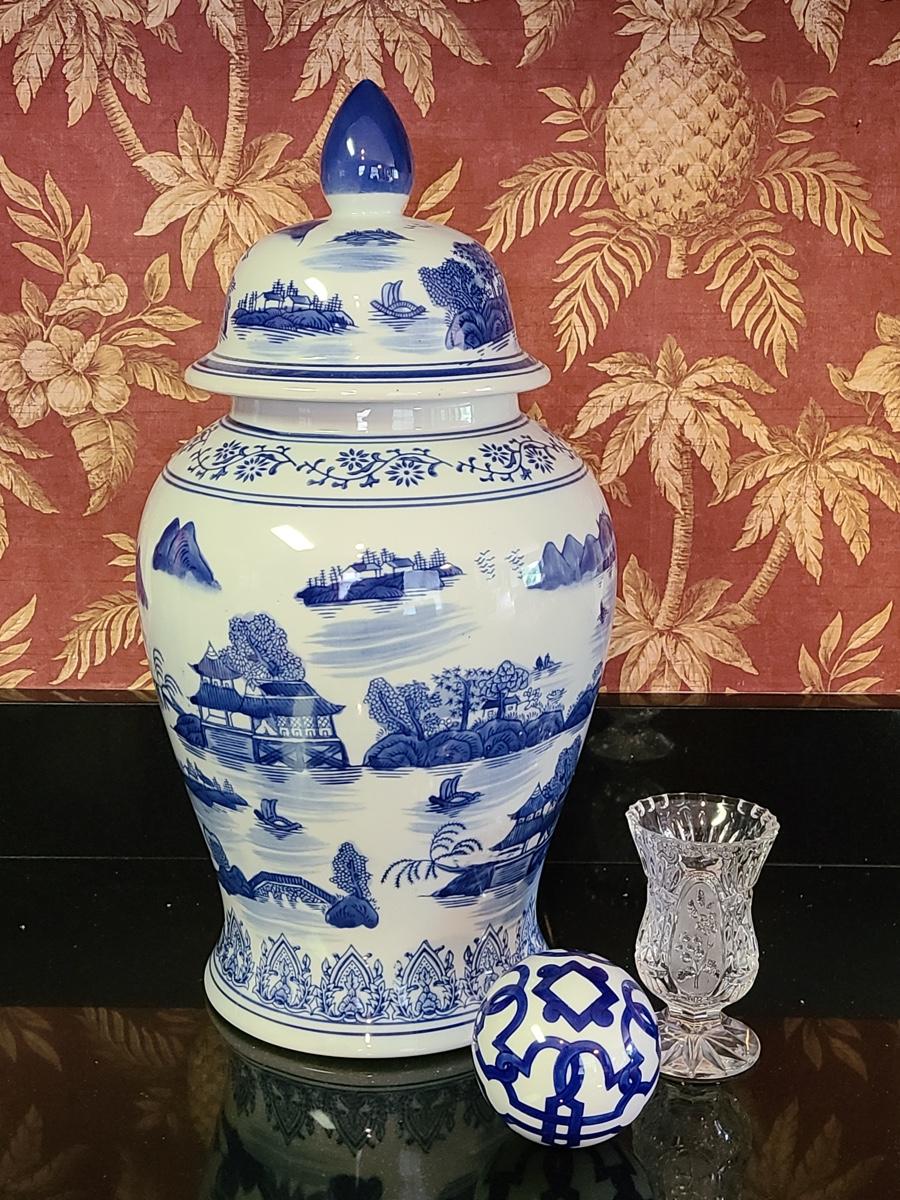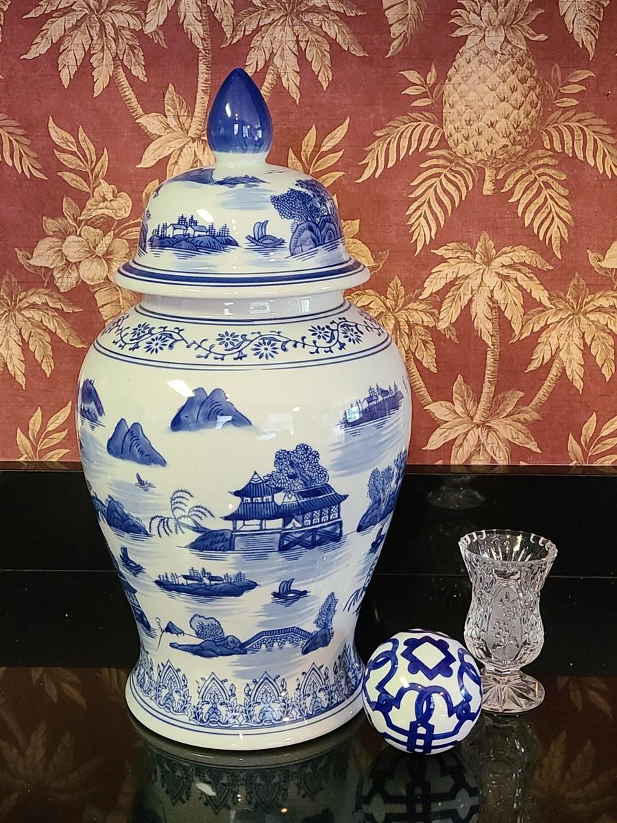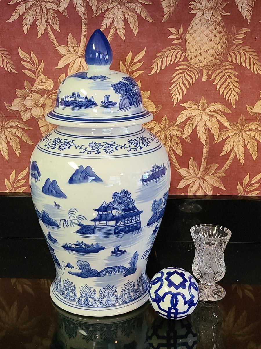 Large vase with lid in blue and whites by Three Hands Corp. Also included is a blue and white round decorative ball and small cut bud vase. The bud vase does have a chip in the lip of the vase. Please see all pictures as they are the best representation of the items. The pictures show condition, measurements if taken, and what is included in the lot. Due to the large amount that we photograph and the time frame, we are not always able to take measurements. All items unless noted, are pre-owned and have been used. If you purchased furniture, you must bring help. We do not allow one person to carry large furniture out on their own. Bring help, tools and a truck for the safety of our client’s homes, and your personal safety. Company policy. Thank you.