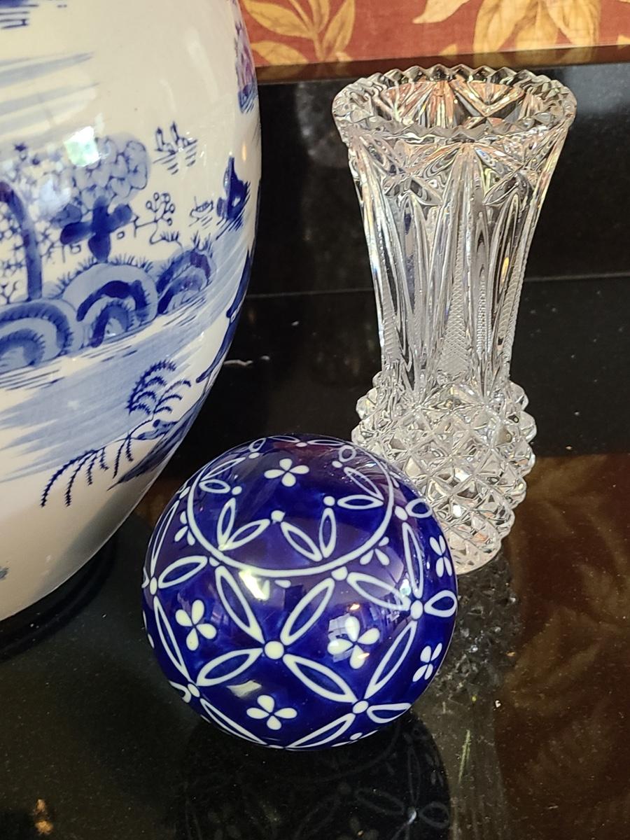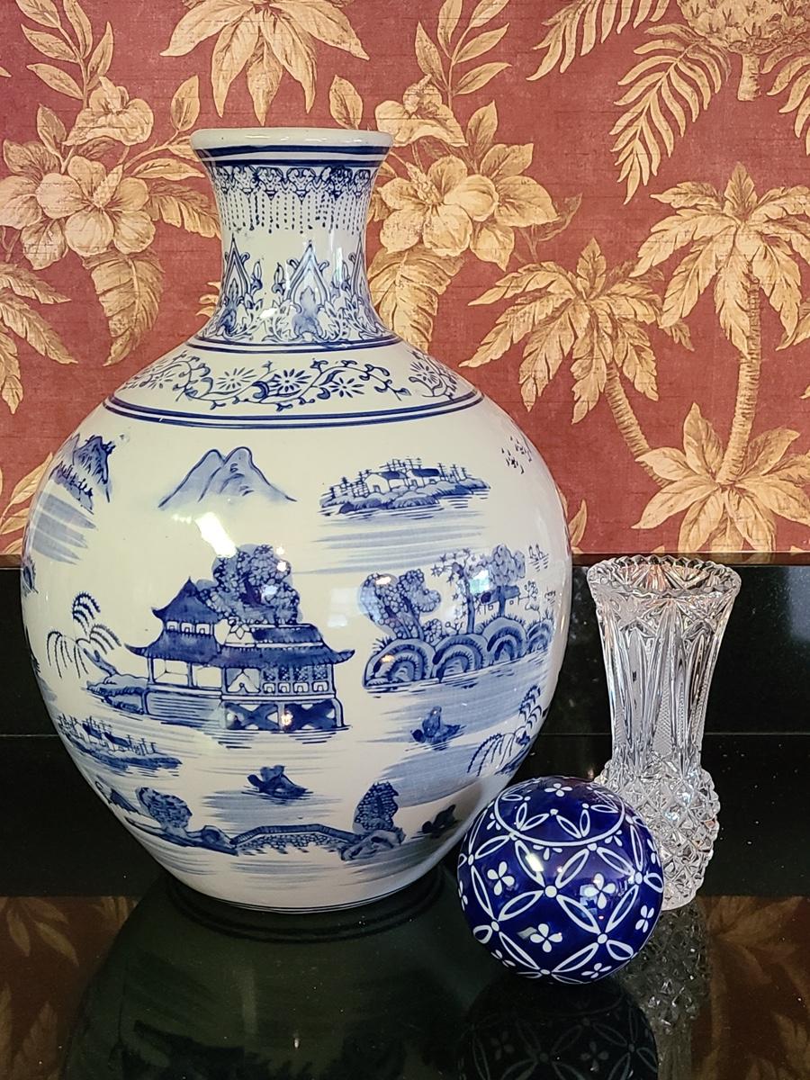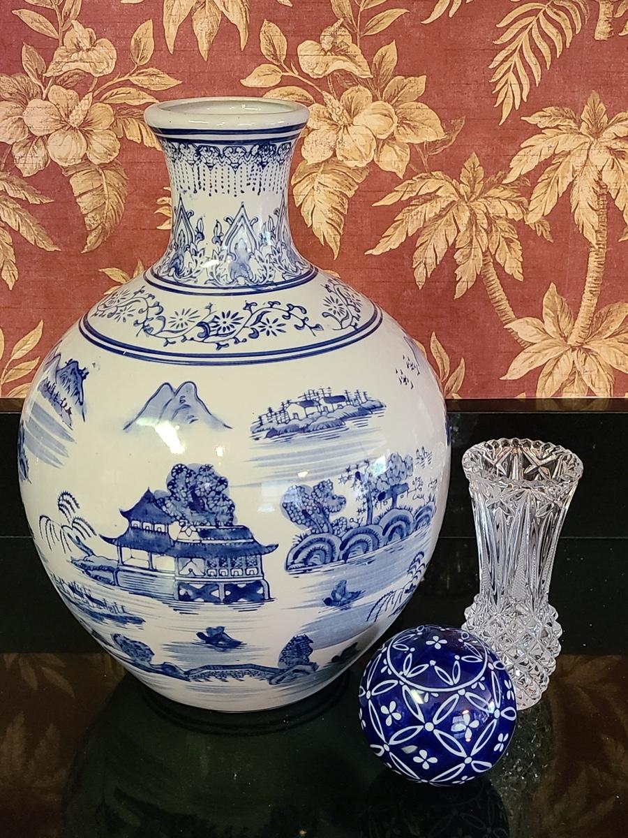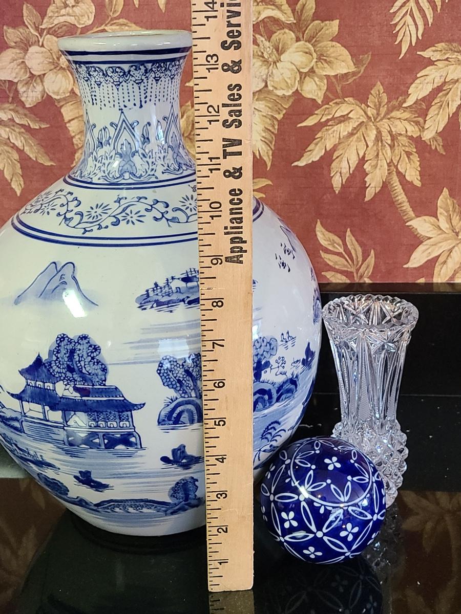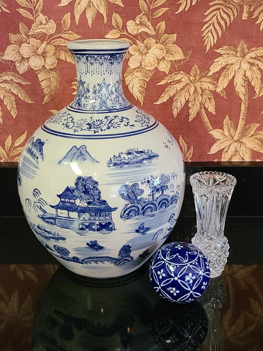 Large blue and white vase by Three Hands Corp and a small accent ball with bud vase. Please see all pictures as they are the best representation of the items. The pictures show condition, measurements if taken, and what is included in the lot. Due to the large amount that we photograph and the time frame, we are not always able to take measurements. All items unless noted, are pre-owned and have been used. If you purchased furniture, you must bring help. We do not allow one person to carry large furniture out on their own. Bring help, tools and a truck for the safety of our client’s homes, and your personal safety. Company policy. Thank you.