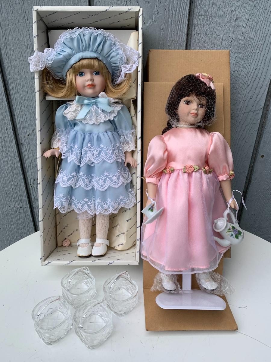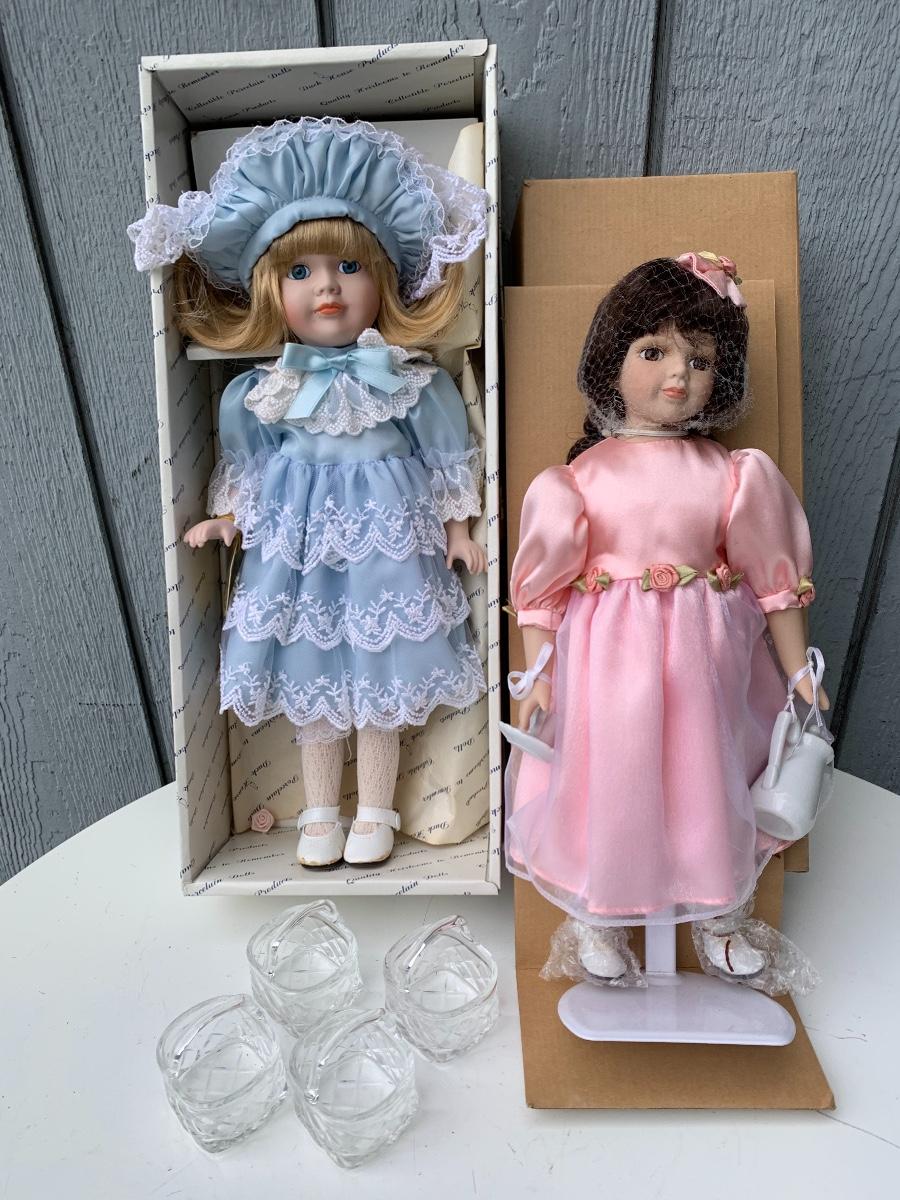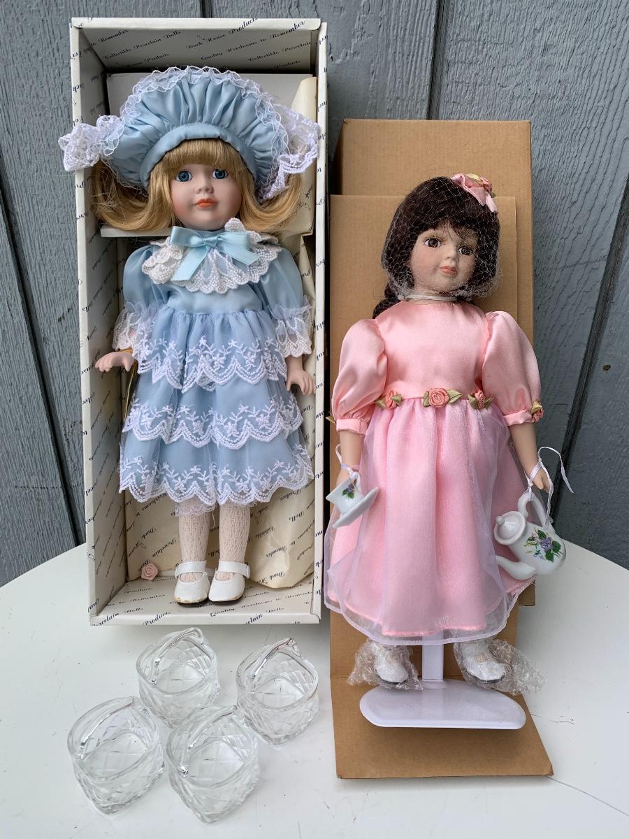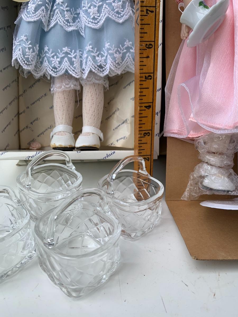 Pair of porcelain dolls are Tea Party ready and the lots has glass basket for "goodies" or decoration. Both boxes to the pair of dolls have condition issues - the dolls do not.