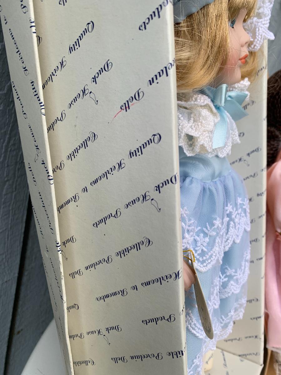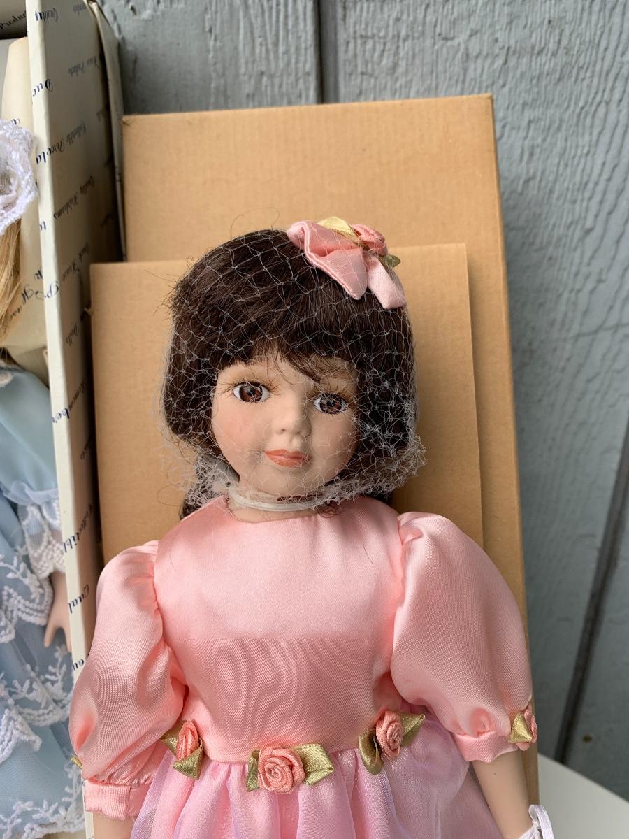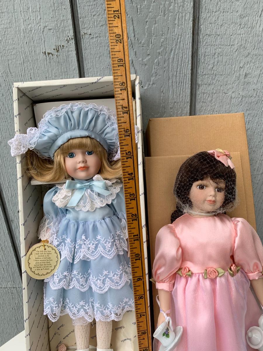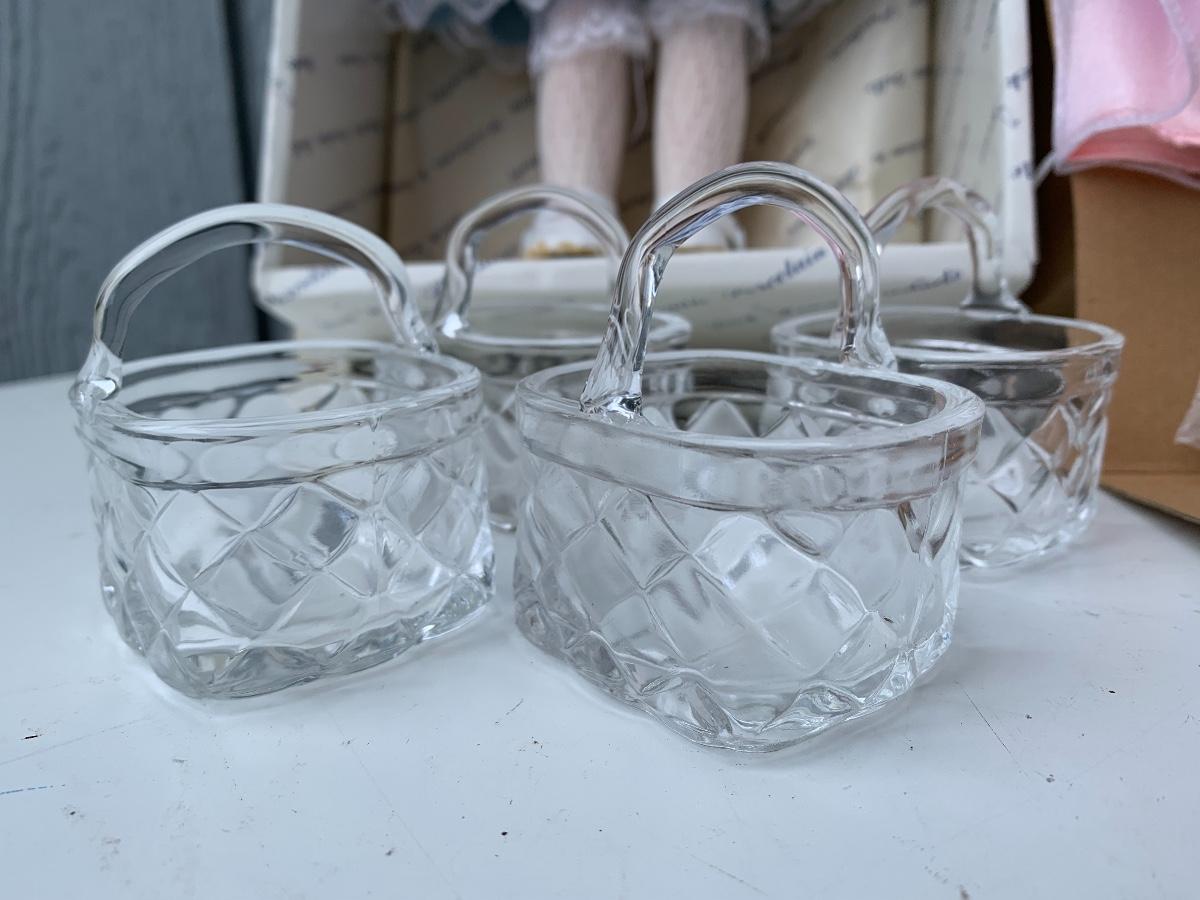 Pair of porcelain dolls are Tea Party ready and the lots has glass basket for "goodies" or decoration. Both boxes to the pair of dolls have condition issues - the dolls do not.