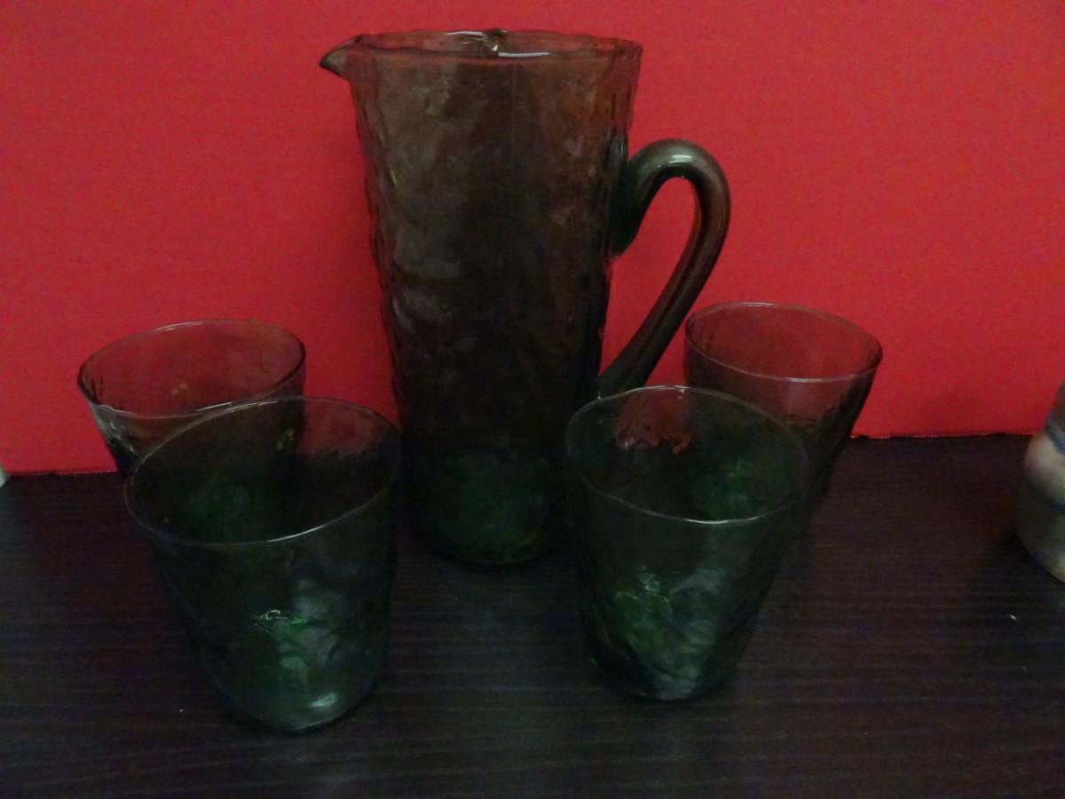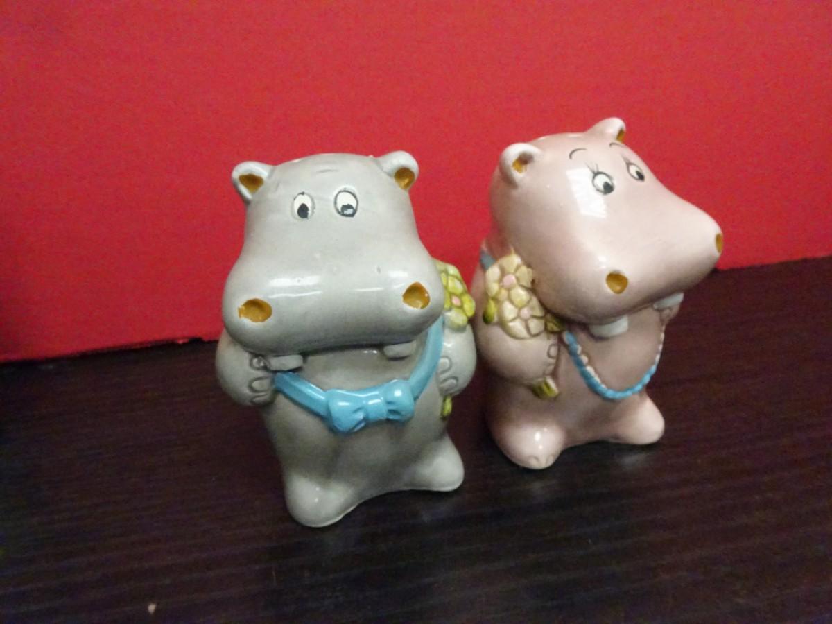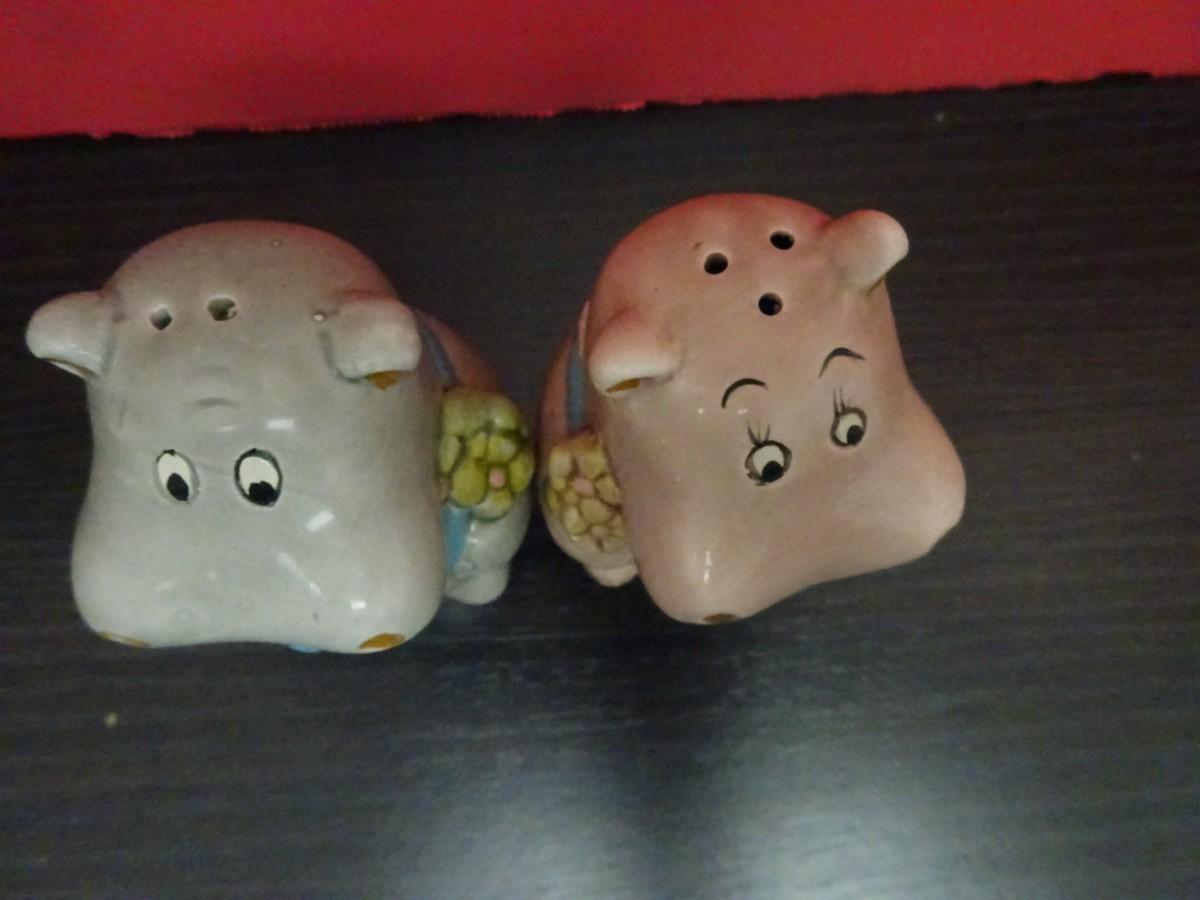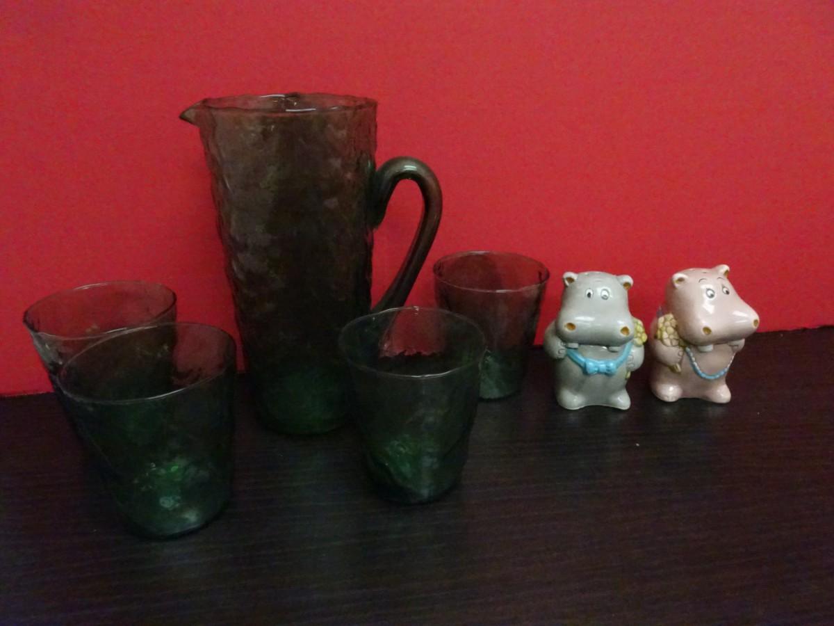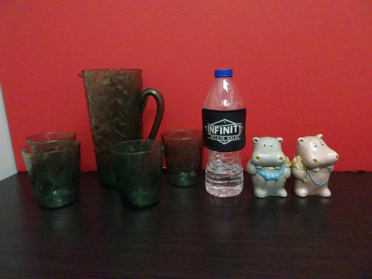 LOT 633. VINTAGE GLASSWARE SET AND VINTAGE HIPPO SALT AND PEPPER SET