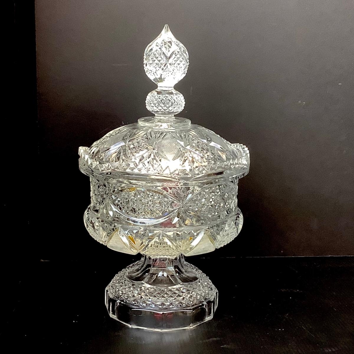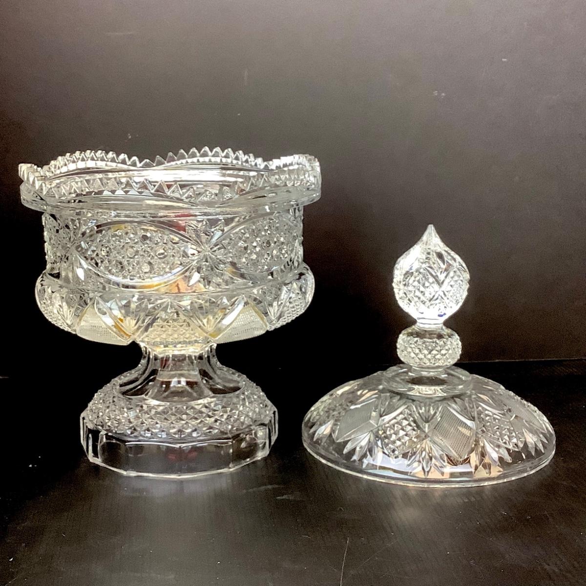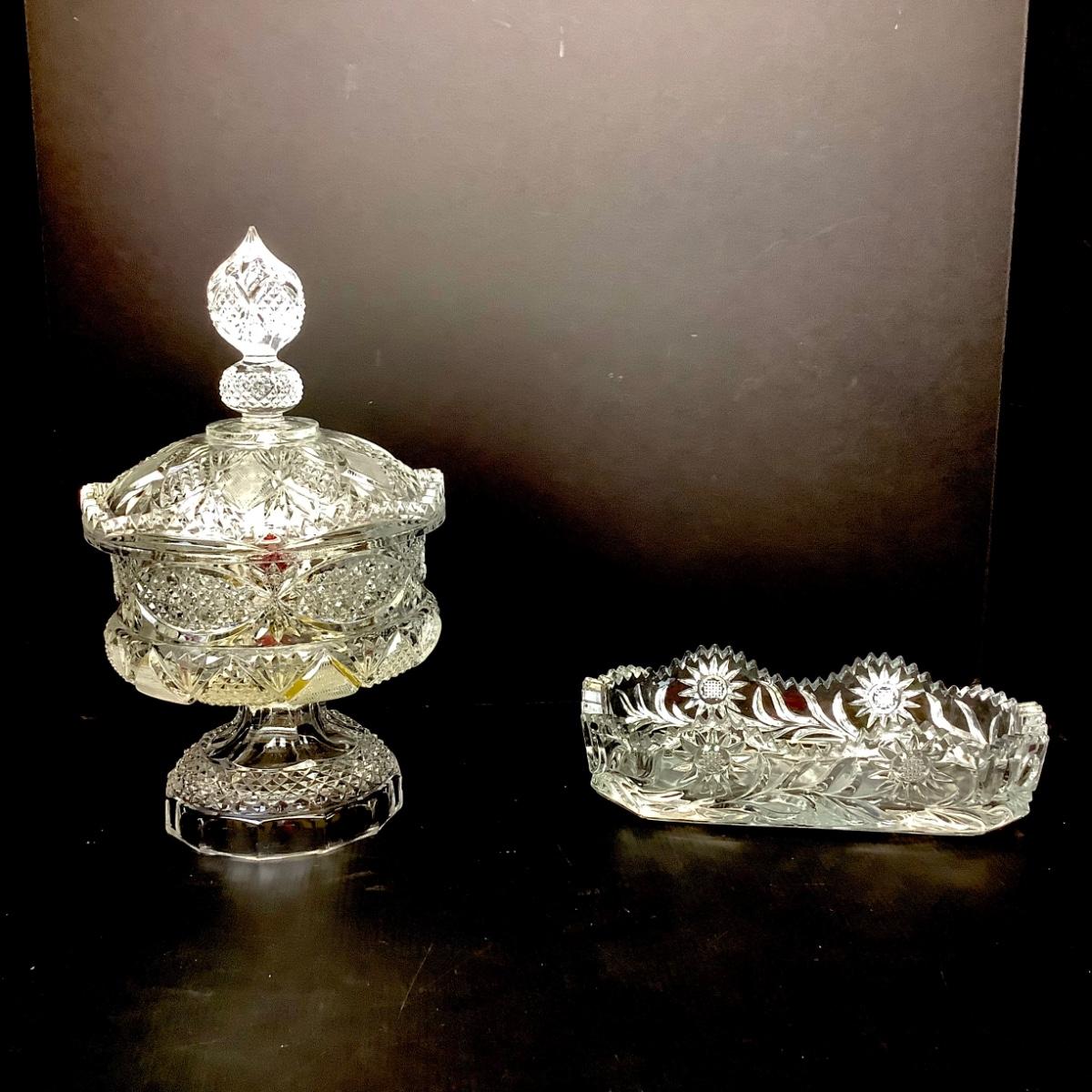 Lot 634  Vintage Clear Crystal Tall/Large, Heavy Pedestal/Lidded Candy Dish & Antique U.S. Glass Daisy/Pickle Dish EAPG