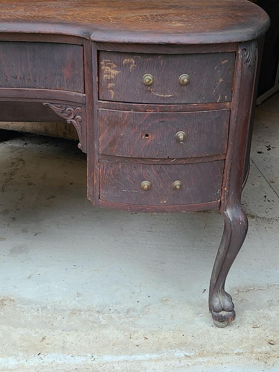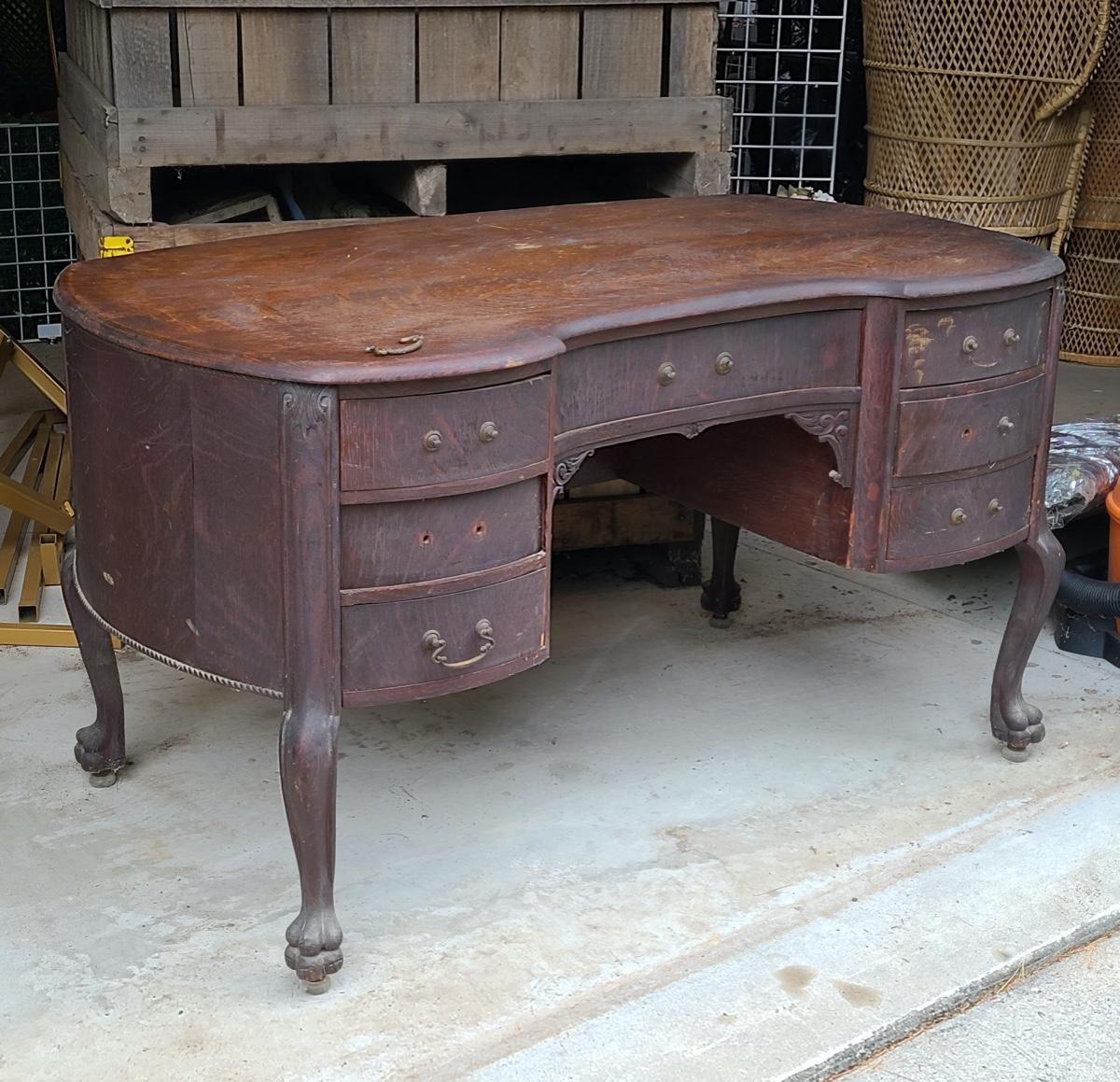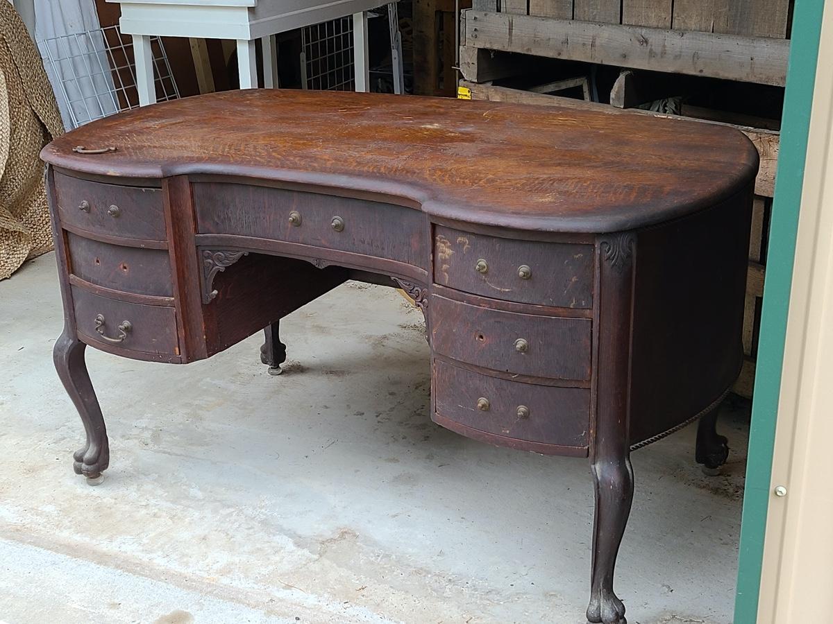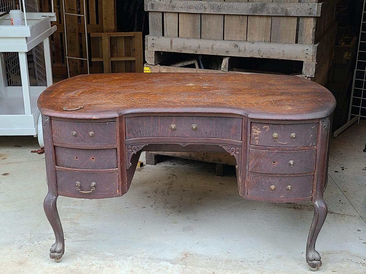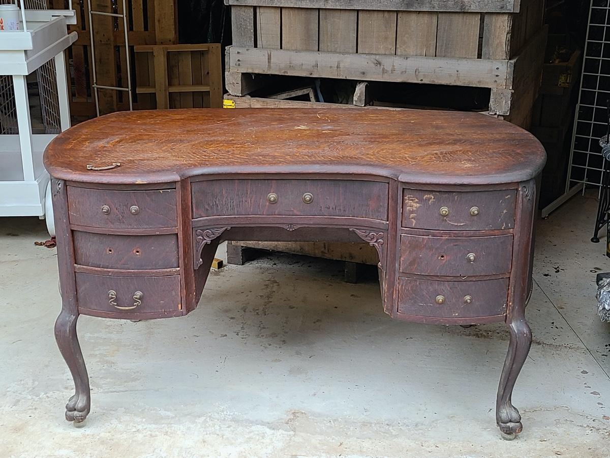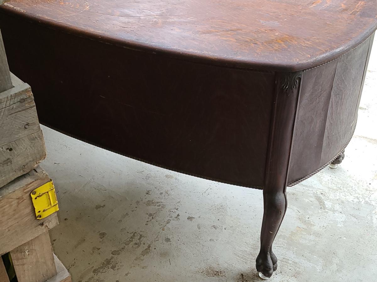 This piece has been stored in old barn building and has great bones, but could use an up-cycling. It would look amazing chalk-painted, because it has details that would pop and the back is flat so it can go in the middle of an office! You will need to bring a truck and help to move! This is large in size. The pictures show condition, measurements if taken, and what is included in the lot. Due to the large amount that we photograph and the time frame, we are not always able to take measurements. All items unless noted, are pre-owned and have been used. If you purchased furniture, you must bring help. We do not allow one person to carry large furniture out on their own. Bring help, tools and a truck for the safety of our client’s homes, and your personal safety. Company policy. Thank you.