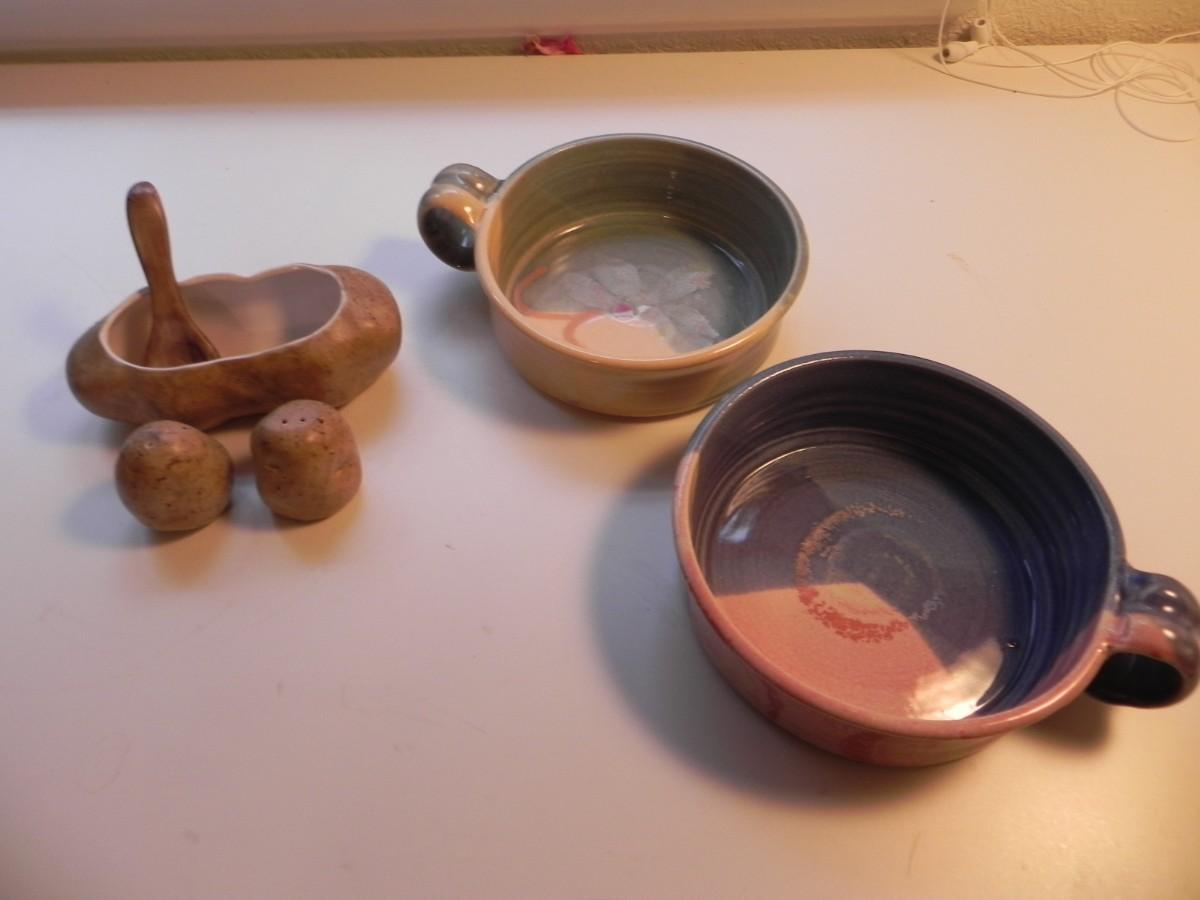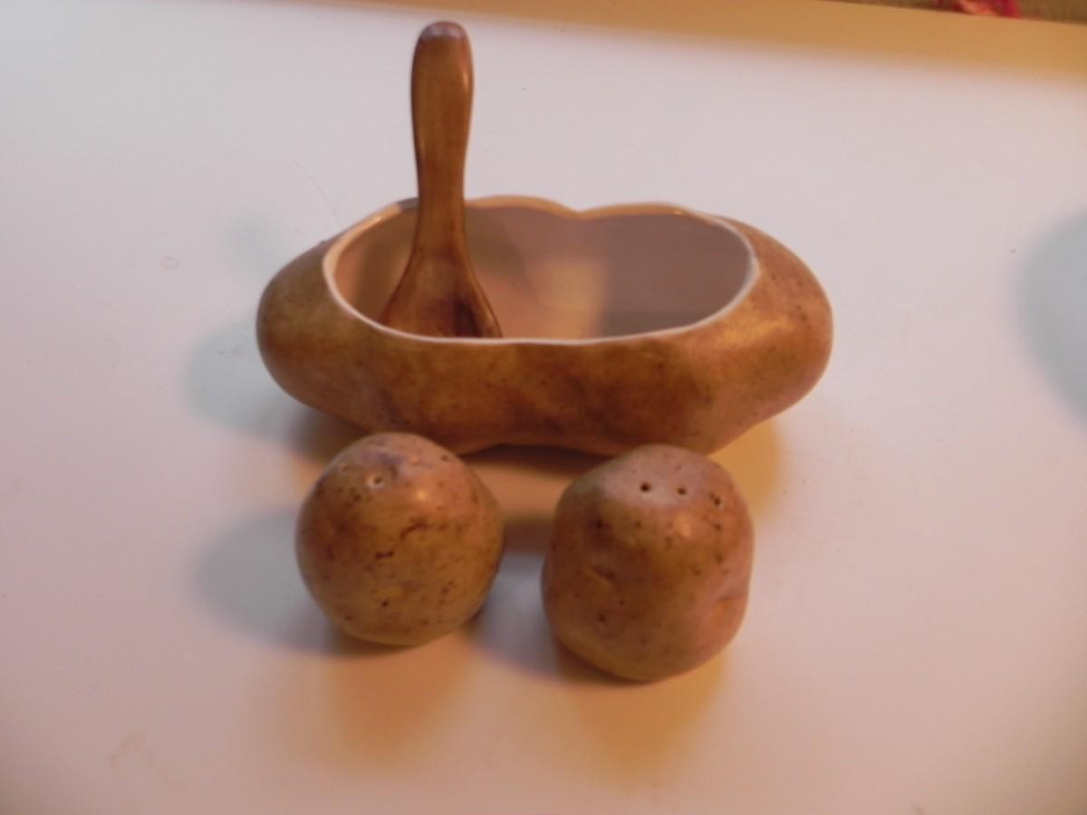 CLAY POTATO SERVER WITH SALT&PEPPER SHAKERS AND 2 CLAY BOWLS