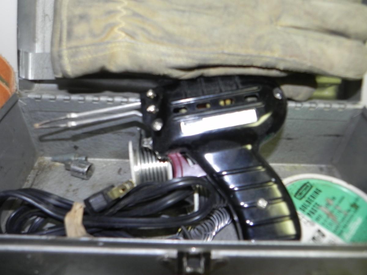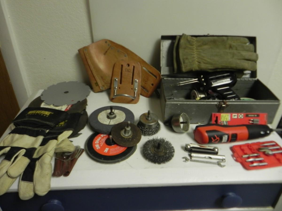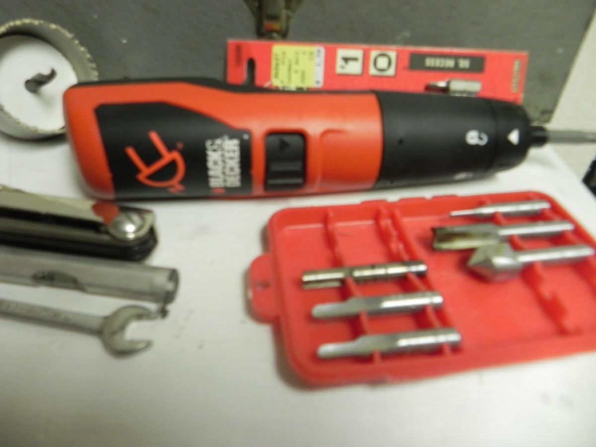 SOLDIER IN METAL BOX, ATTADHMENTS FOR DRILL, CORDLESS SCREWDRIVER, AND MORE