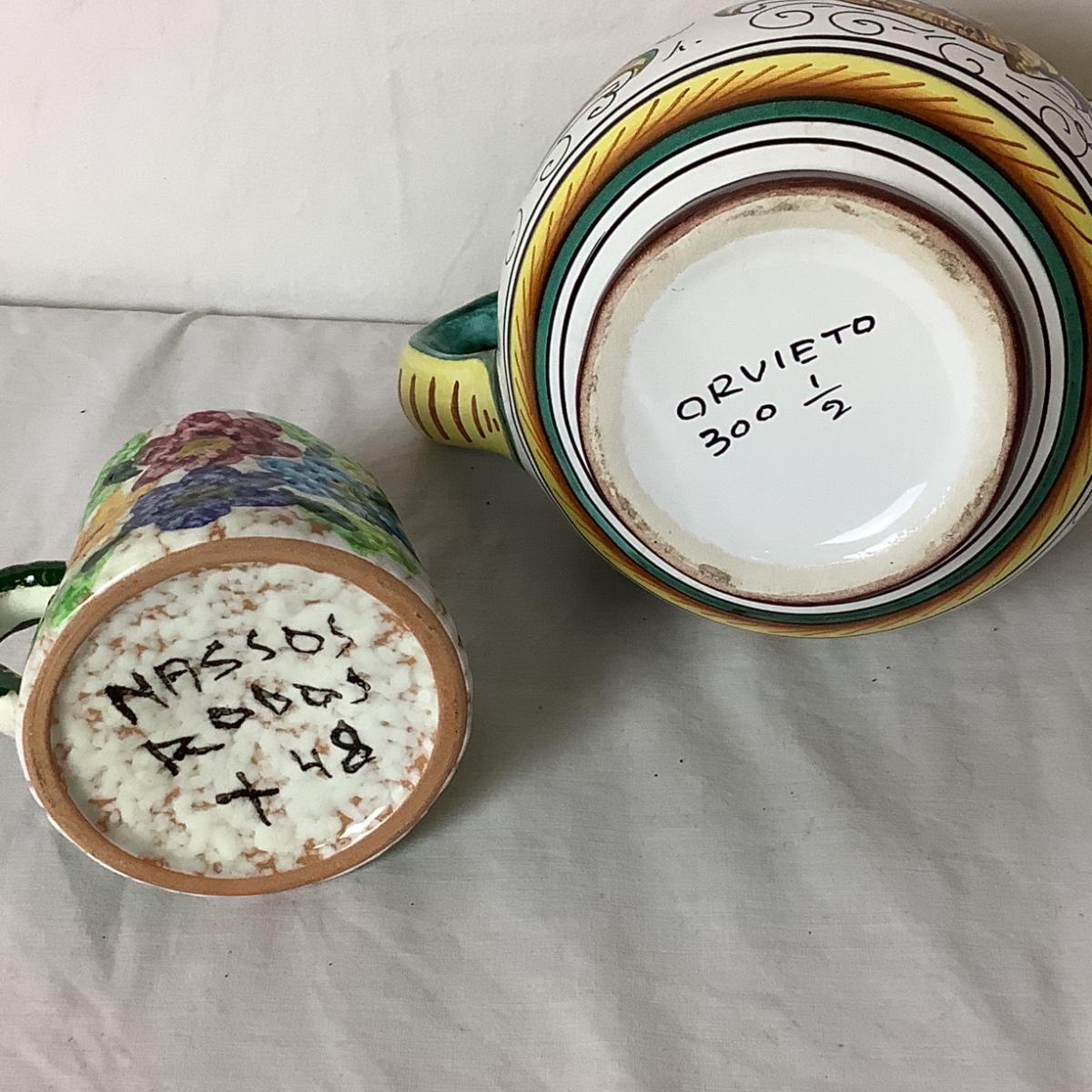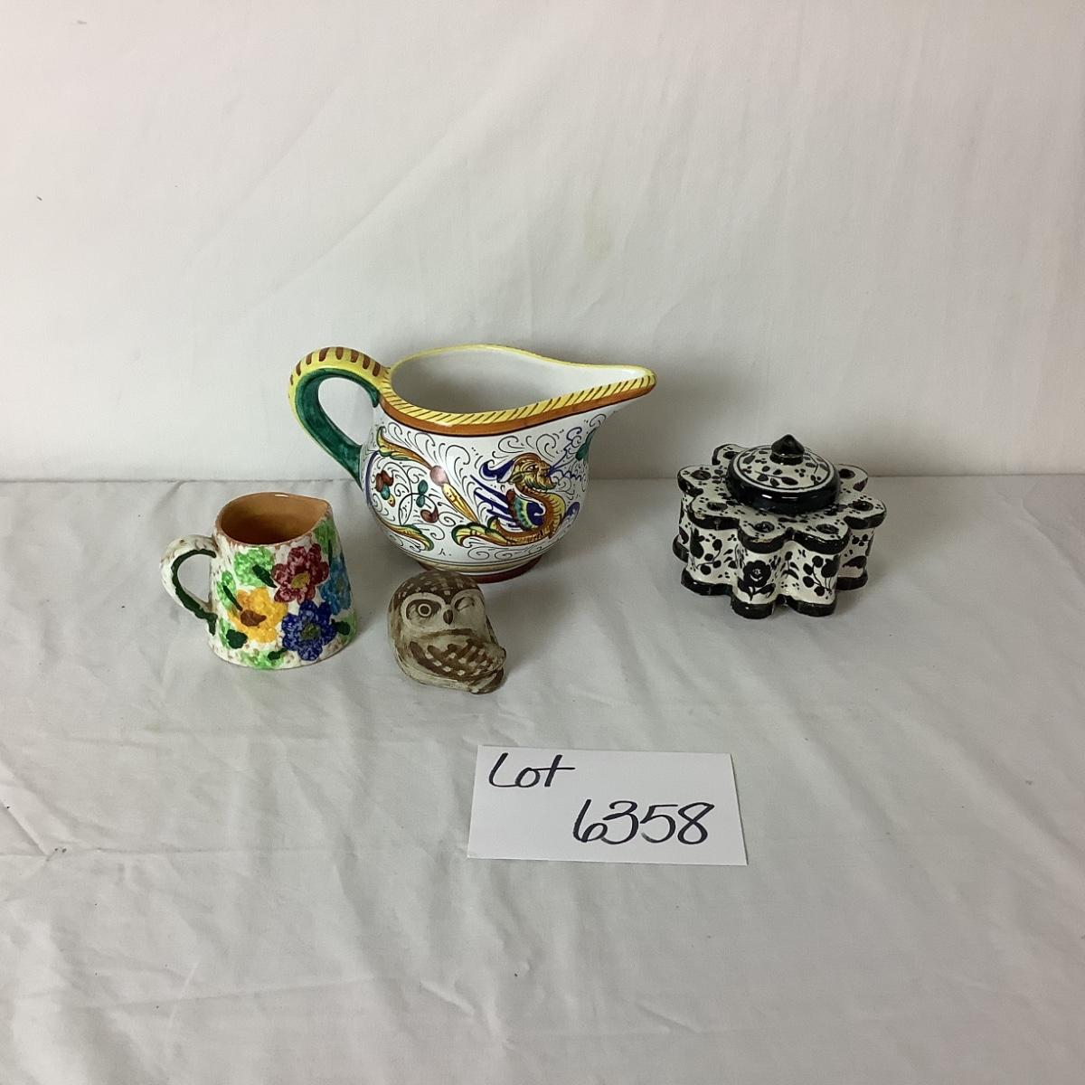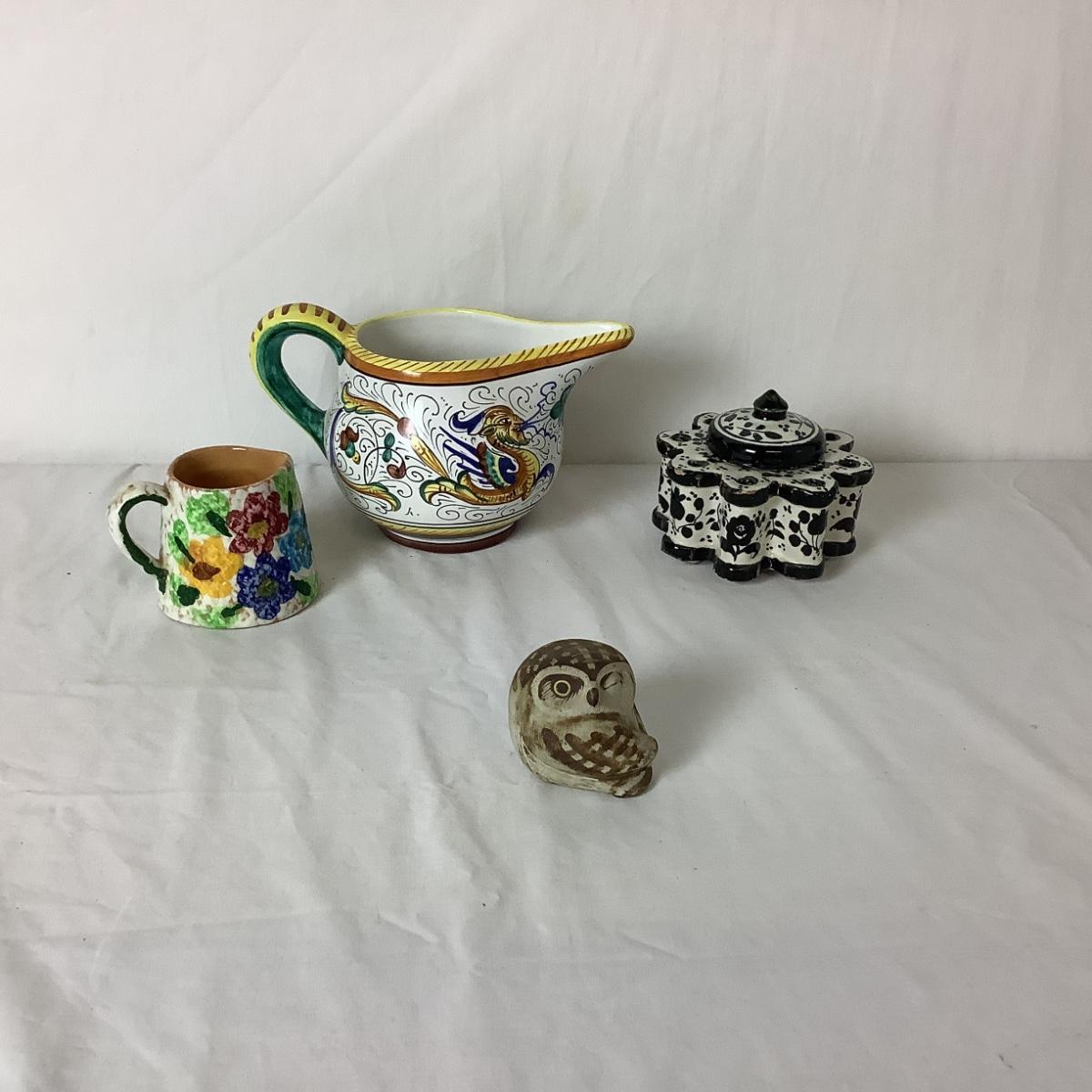 Lot 6358. Italian, Hand Painted Ceramic Ink Well, Italian Hand Painted Creamers, Hand Painted Owl
