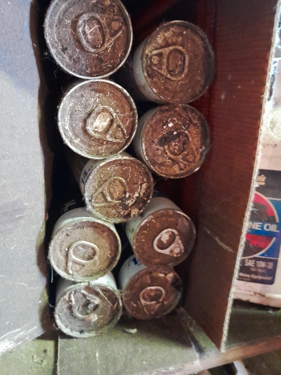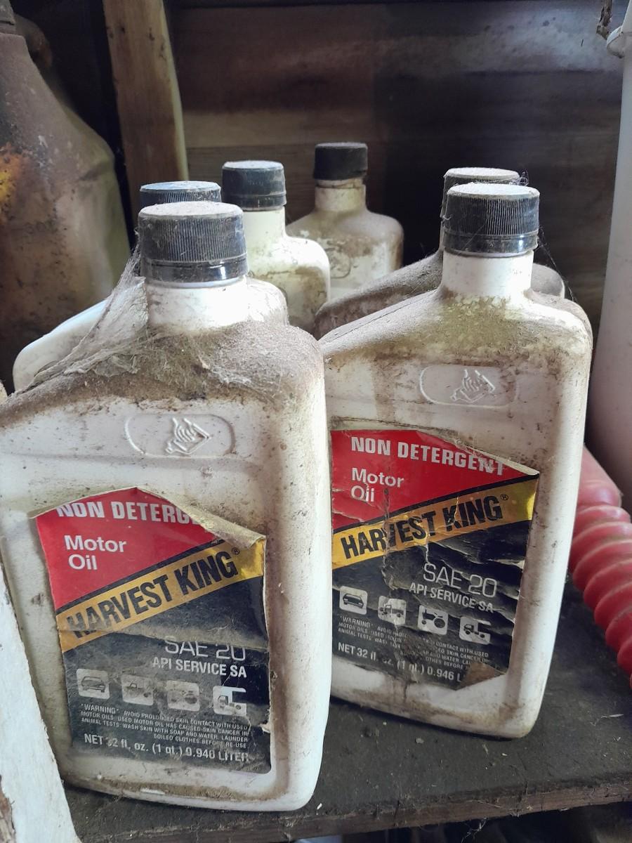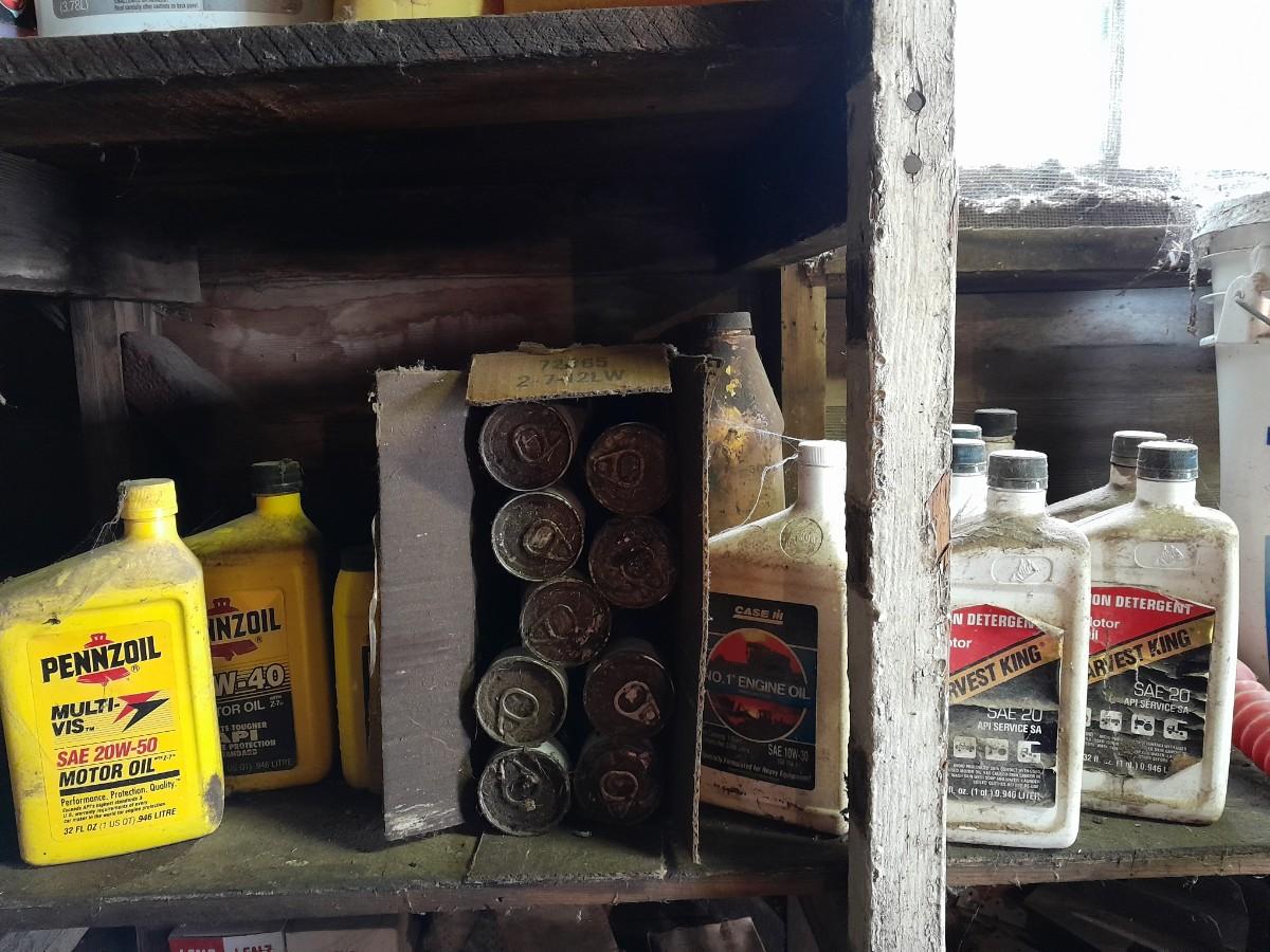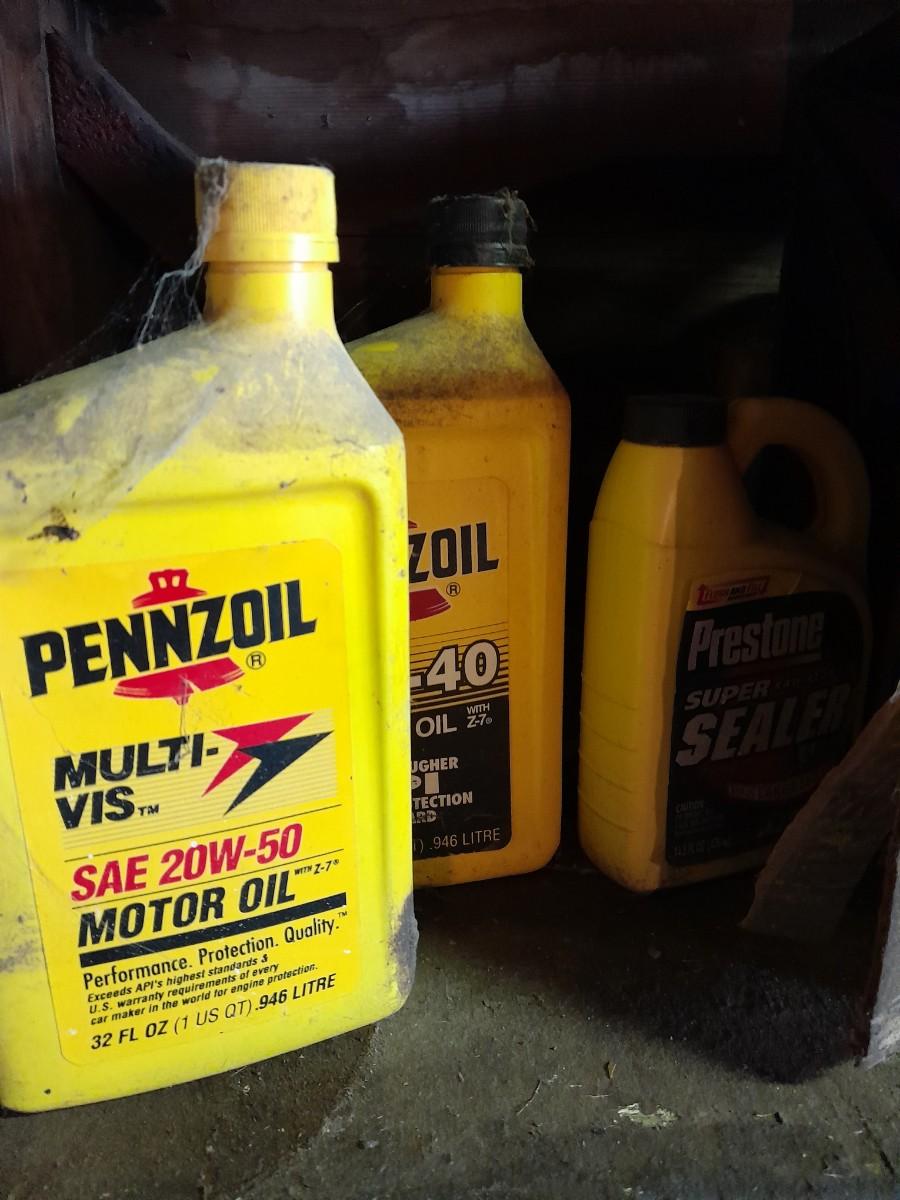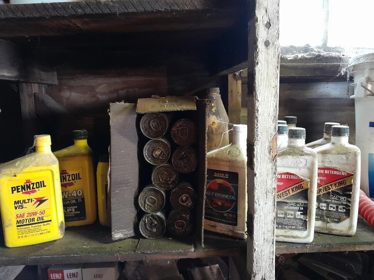 ASSORTMENT OF MOTOR OIL AND GEAR LUBRICANT HAS BEEN ON A SHELF A WHILE