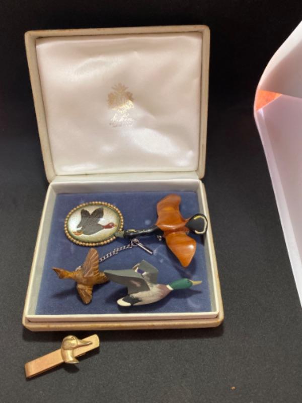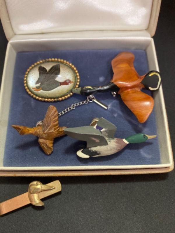Lot of Vintage Carved Duck pins and a reverse painted duck pin with a duck tie clip