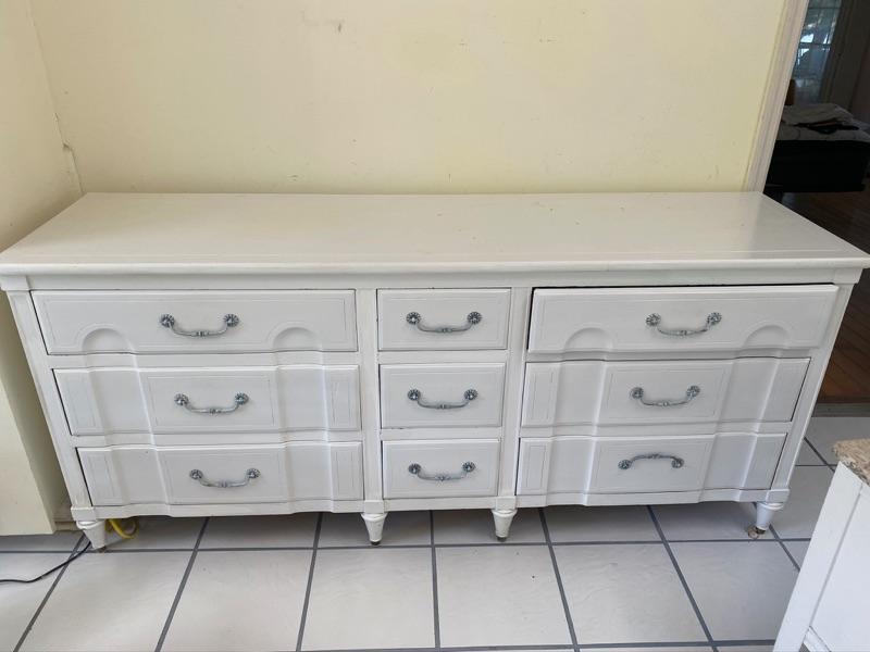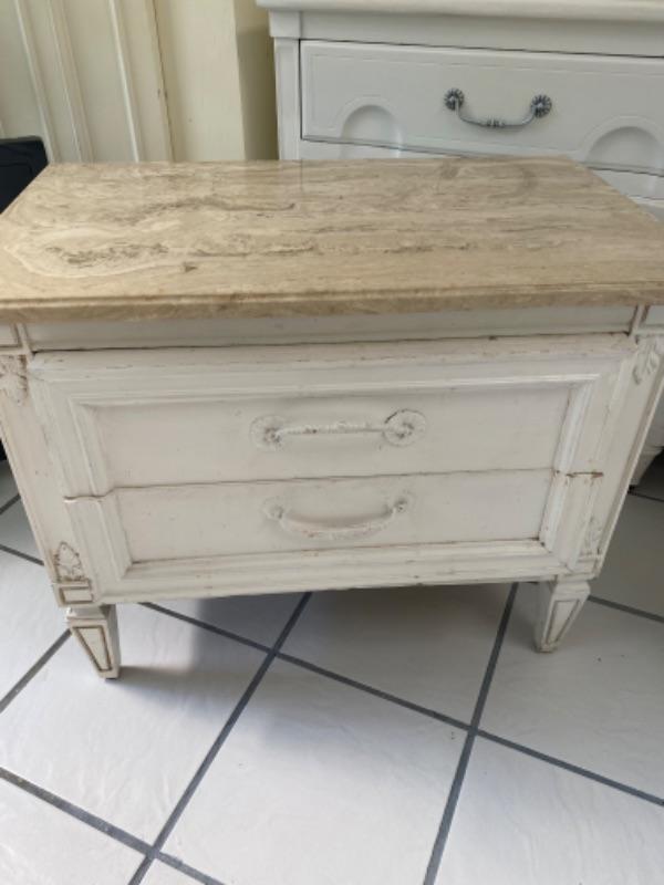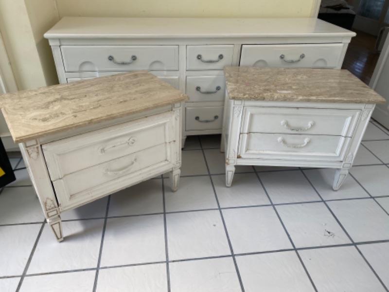 3 pc. Old Hickory manufacturing furniture set. One 9 drawer dresser with two night stands that have marble top. The dresser measures 72” x 20” x 32”h and the nightstands are 30” wide x 18” deep x 24” tall