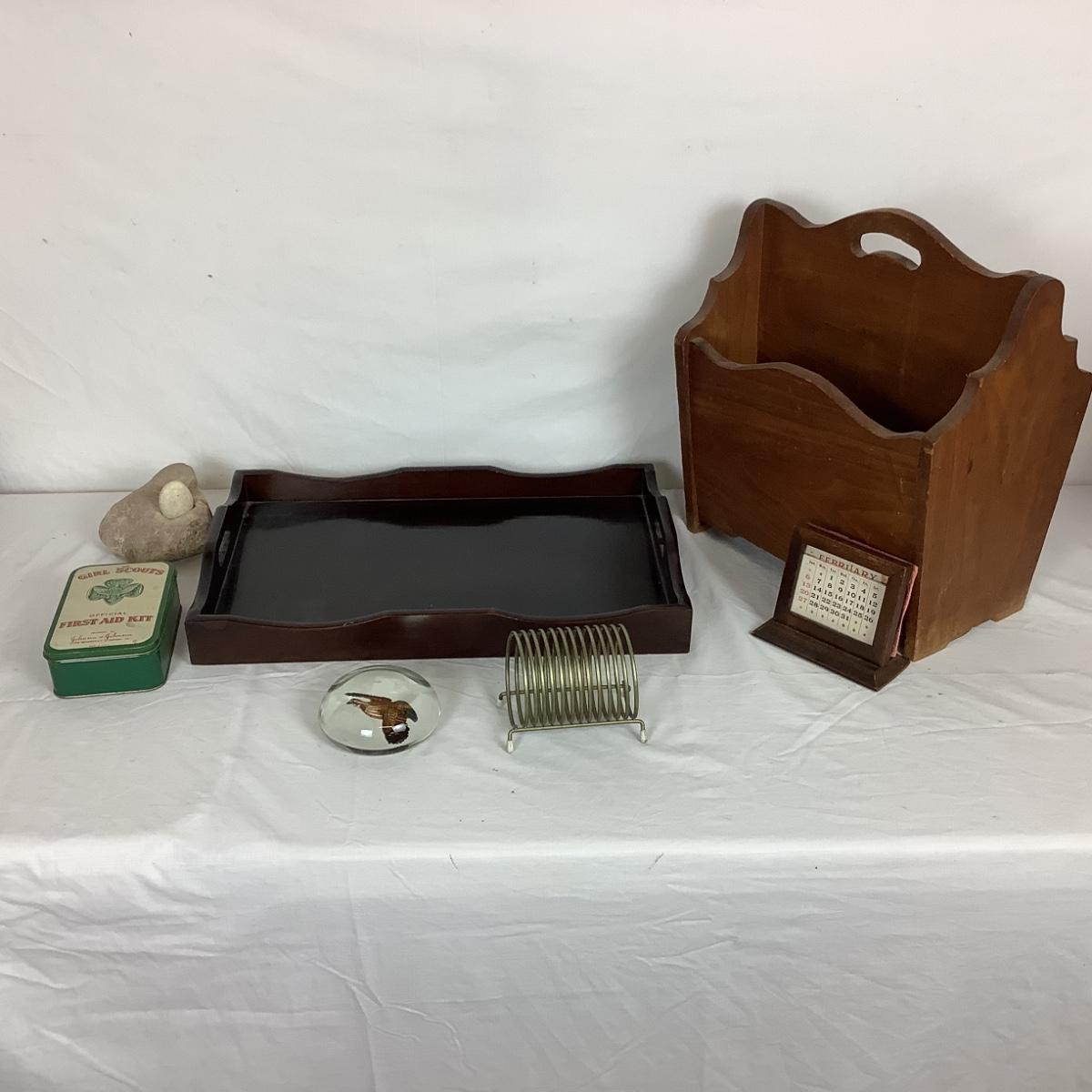 Wooden Tray, paperweight, Magazine holder, GS badges, calendar