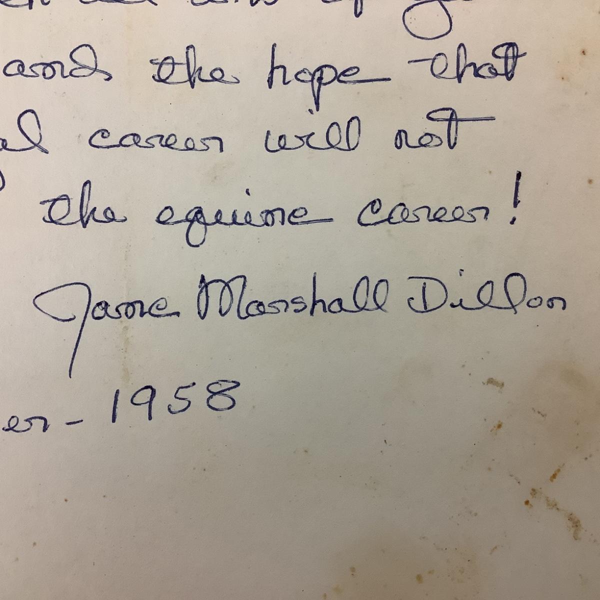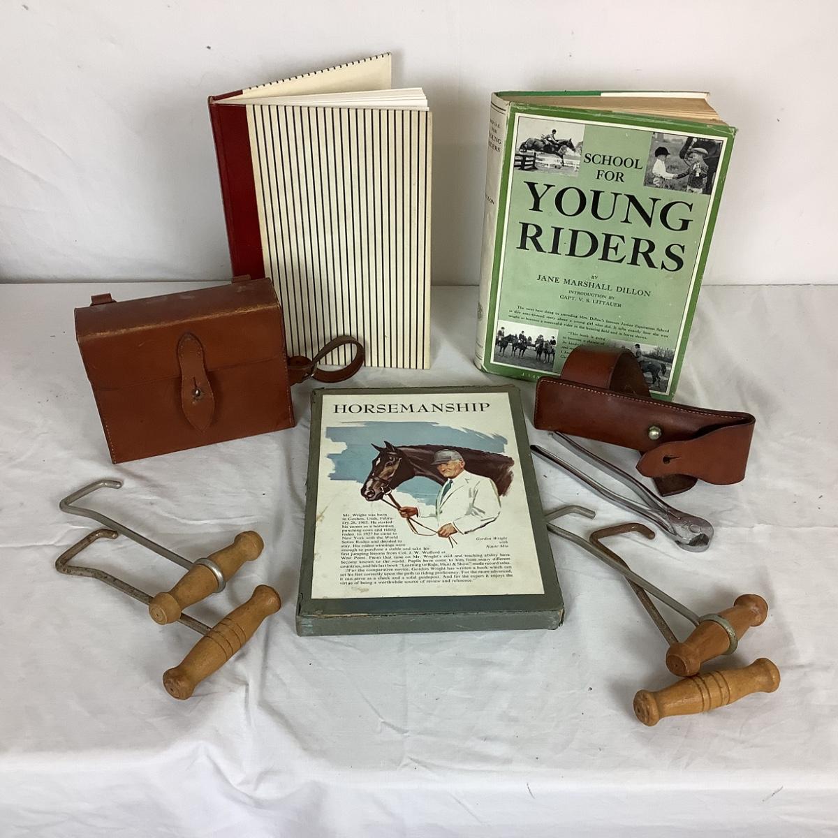 Signed School for Young Riders book by Jane Marshall Dillon. 4 wooden Boot Pulls, Horsemanship by Gorden Wright, leather holster, leather canteen kit.