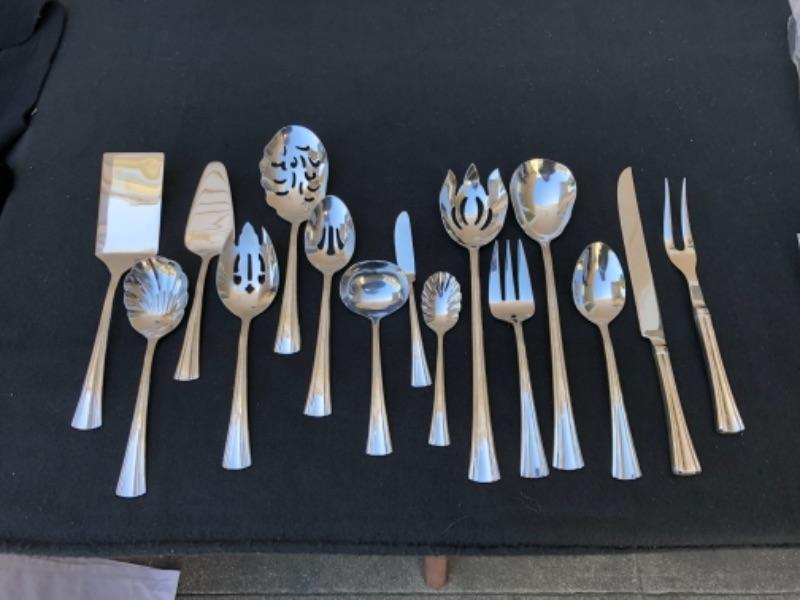 Lot 63L. Reed & Barton Stainless Flatware, Brookshire pattern, New and Unused, 115 Pieces include: 12 Soup spoons, 12 teaspoons, 12 parfait/iced beverage spoons, 12 Tablespoons, 12 Dinner knives, 12 Steak knives, 1 butter knife, 12 salad forks, 12 dinner forks, 18 serving/carving pieces