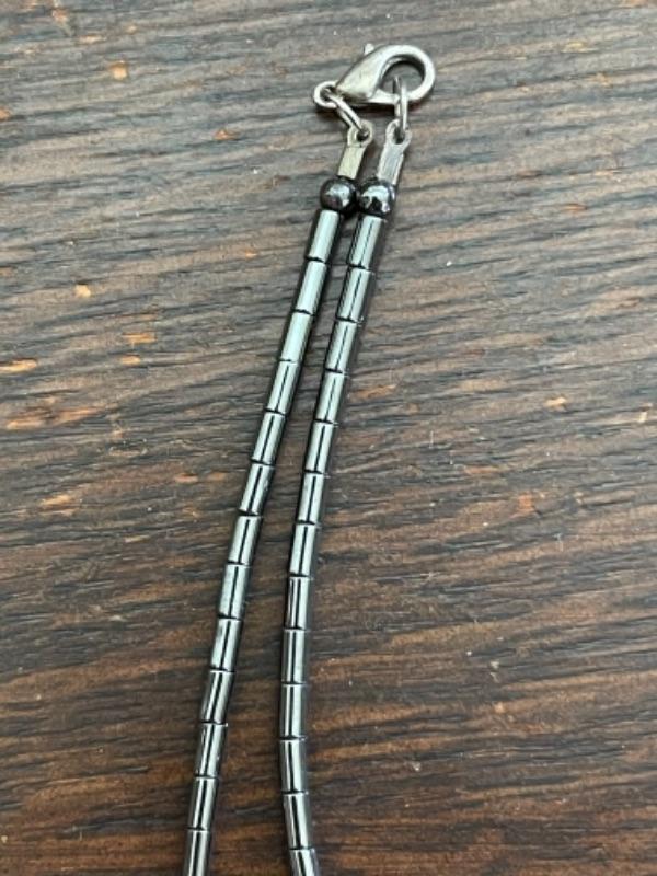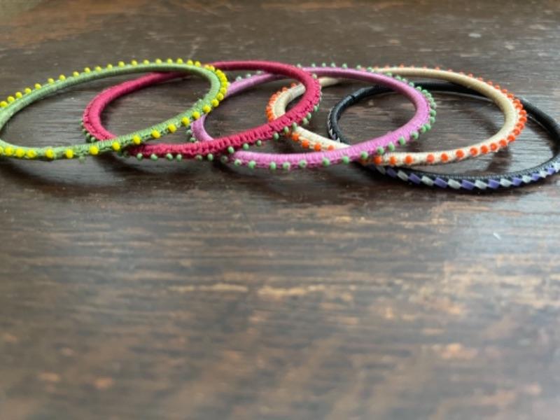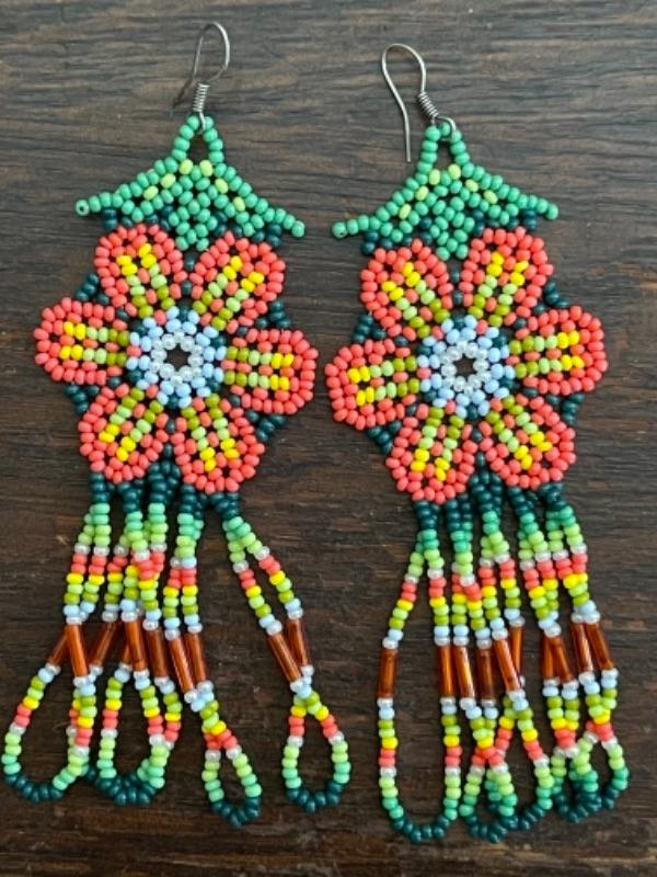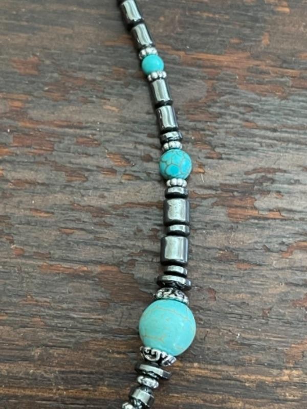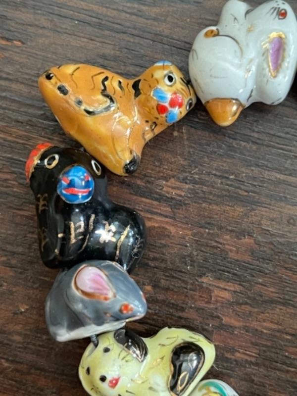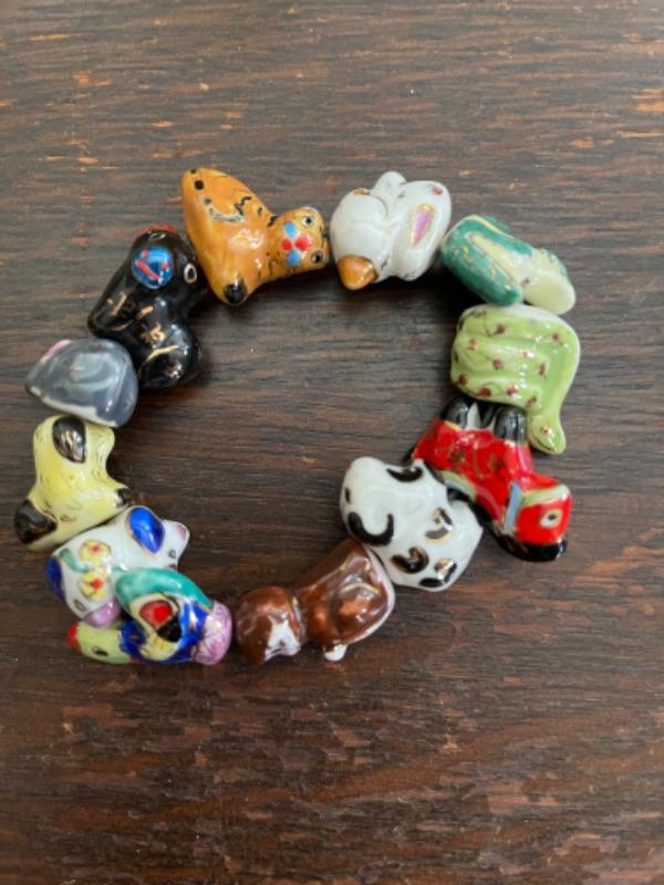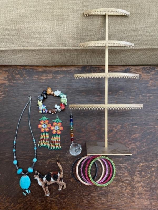 Lot 63LD. Assorted beaded jewelry with stand; one glazed ceramic Chinese zodiac bracelet (adjustable elastic); five multi-color beaded bangles; one pair of beaded drop flower earrings; one beaded cat brooch in leather; one turquoise and hematite necklace; one crystal prism--$65