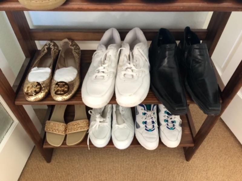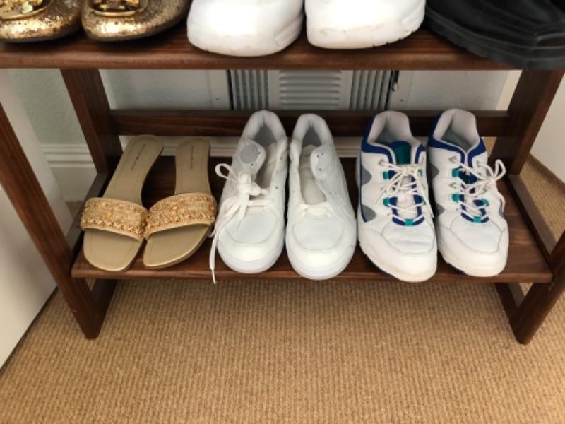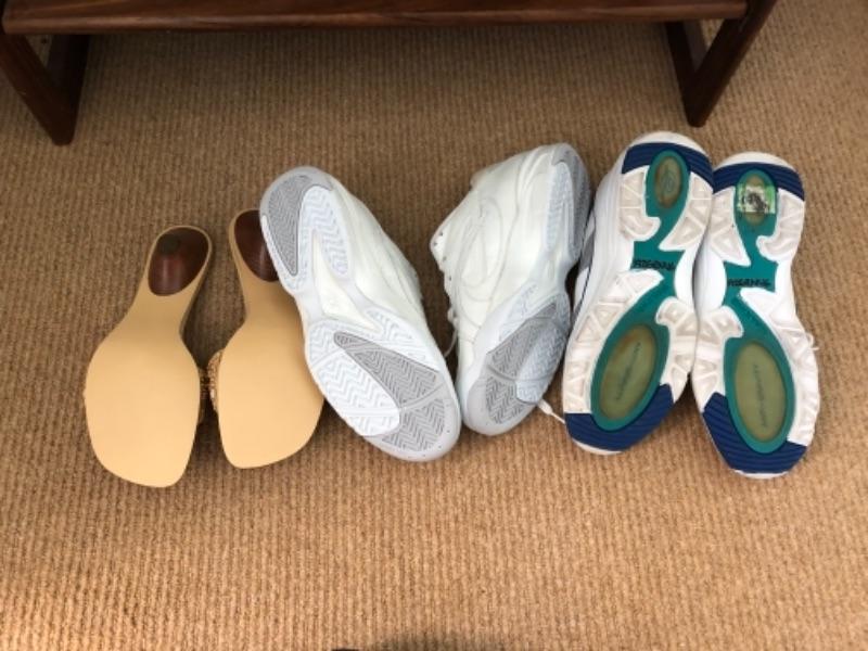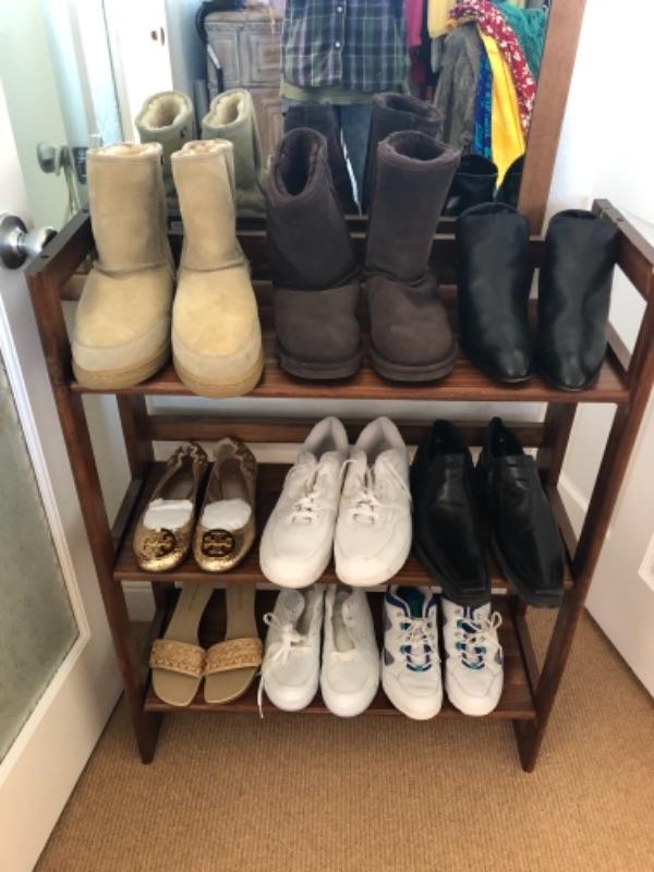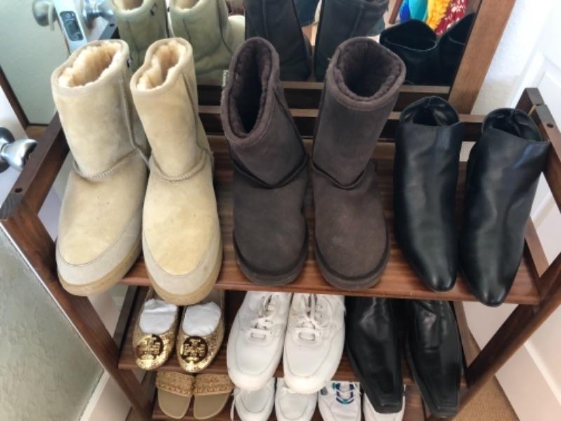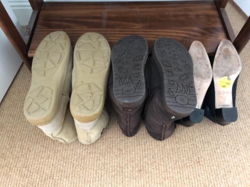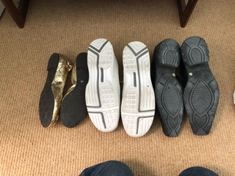 Lot 63U. Nine pairs of shoes“”3 men’s running, sizes 9.5 to 11, tan fleece mukluks, size 11, women’s Bear Paw brown mukluks, men’s black leather loafers, UK size 41.5, women’s black Sudini boots, sandals, size 10M, 1 pair gold lame and 1 pair of loafers--$85