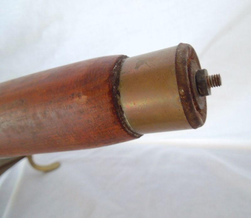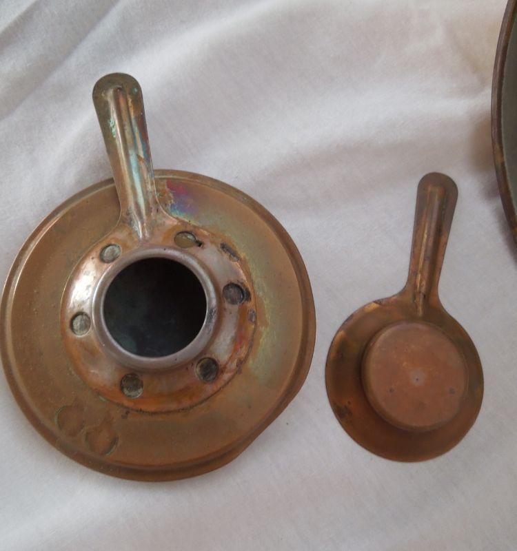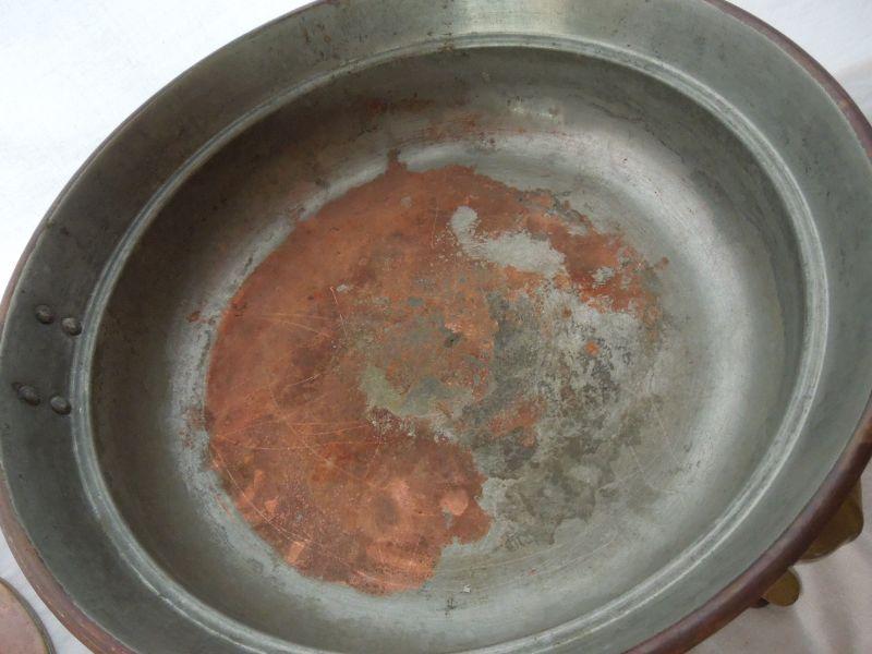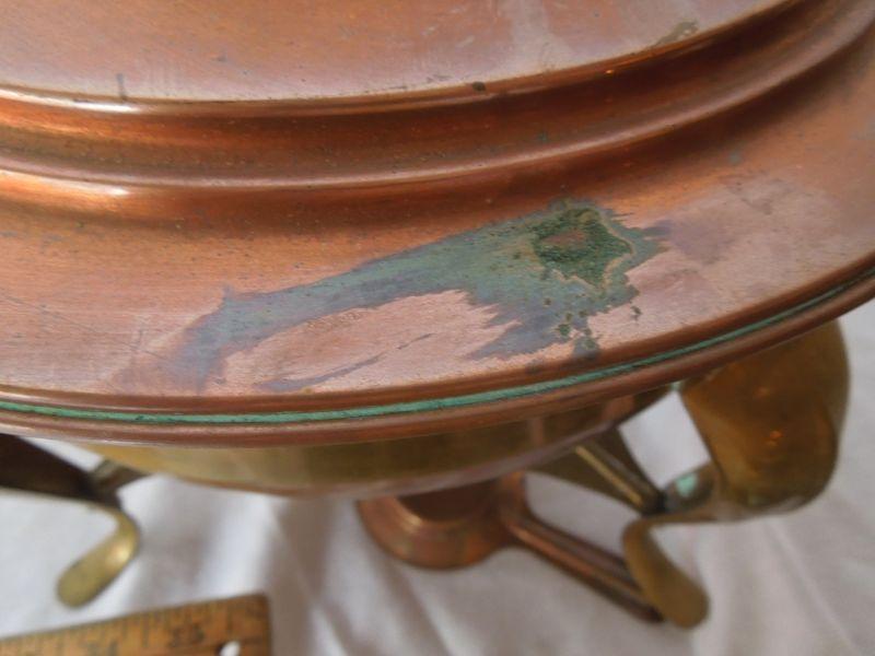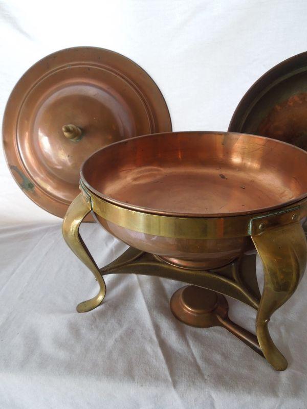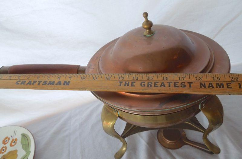 Copper and brass vintage 1950's wood handled chaffing dish with stand and burner. All parts included. End of handle missing piece and some oxidization on inside water dish.