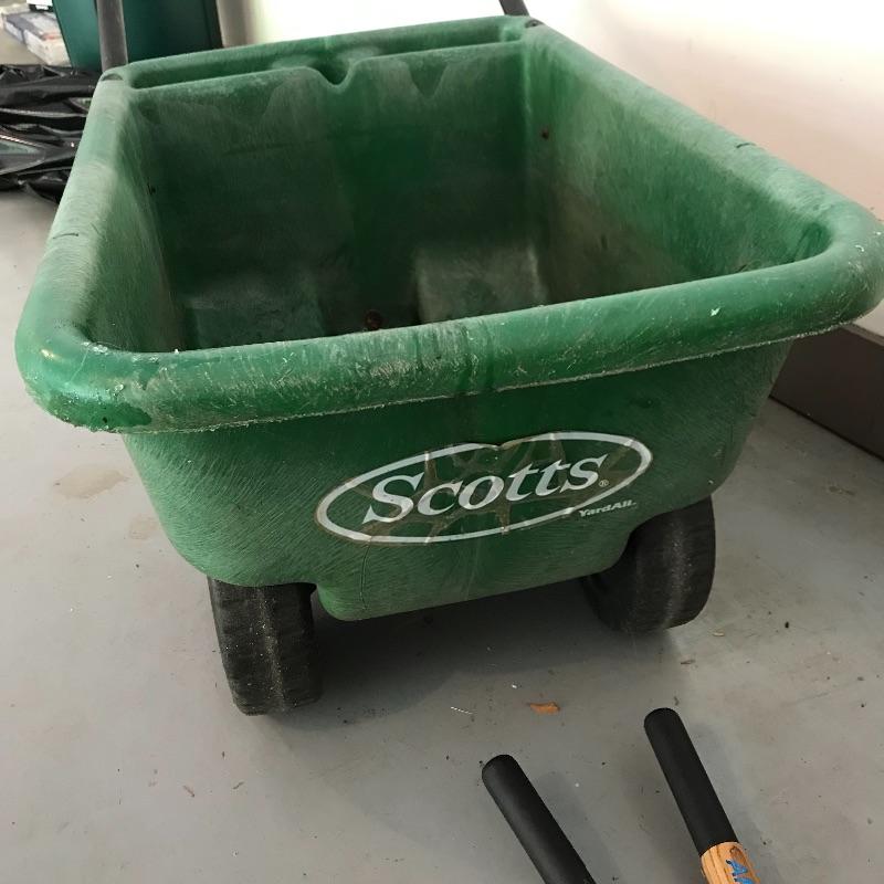 Scotts Yard All garden cart with side hooks and a cup holder is perfect for helping you achieve the yard you want this spring! Inside the basin measures approximately 32” x 22” x 15”. Lot also includes nice utility gloves and plenty of tools in good shape to get the yard jobs done. See photos. No shipping.