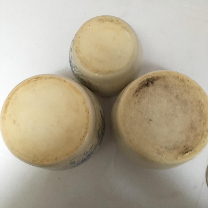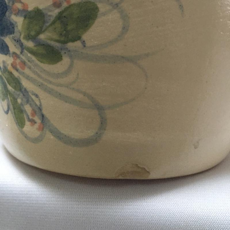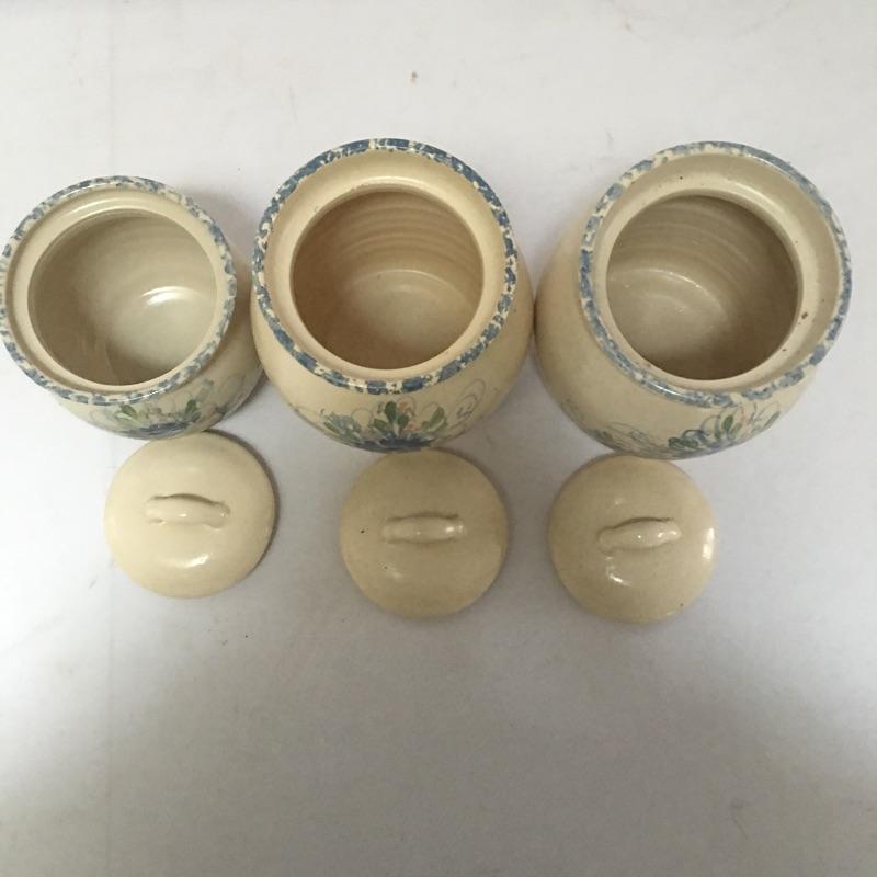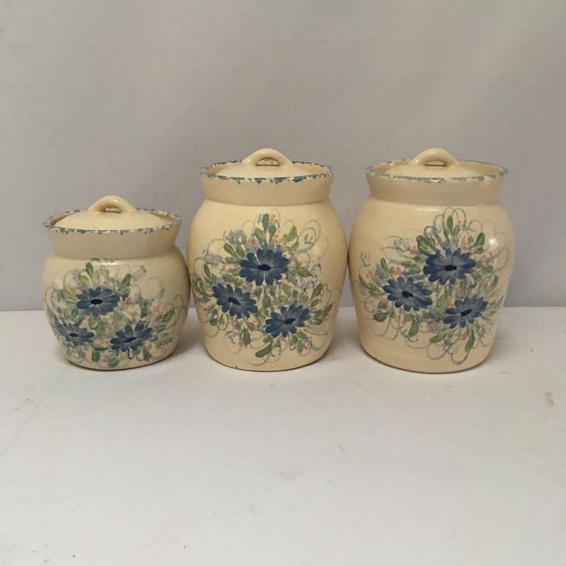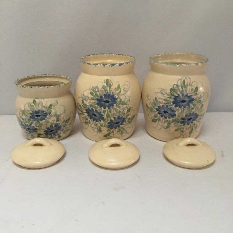Three pottery canisters with lids and a floral design on the front. Organize your flour, sugar and coffee and make them easy to access! One large canister has a chip on bottom, see pictures. Largest canister measures 8” tall x 6.5”D.