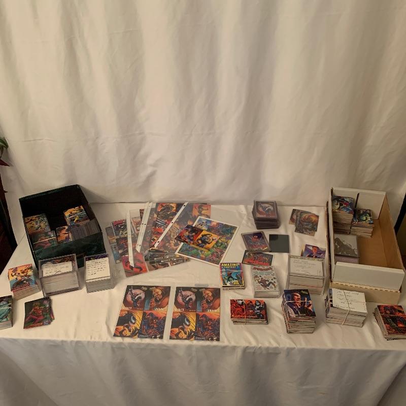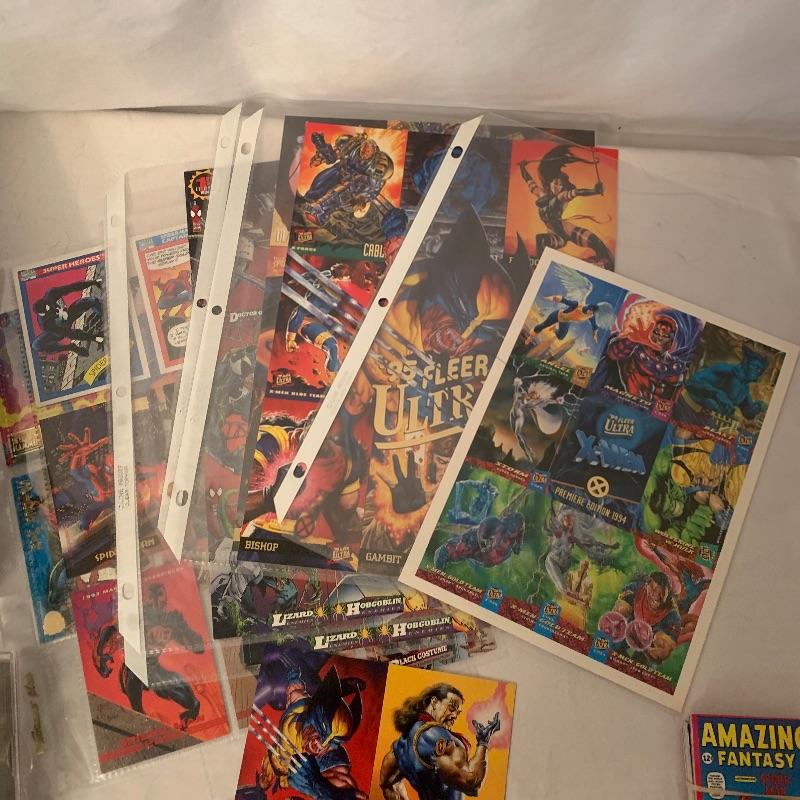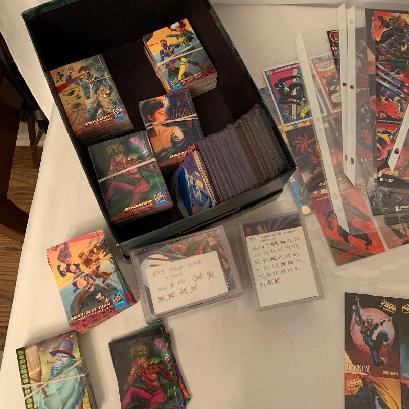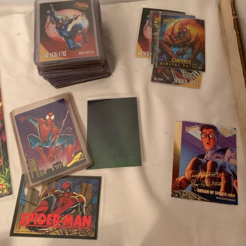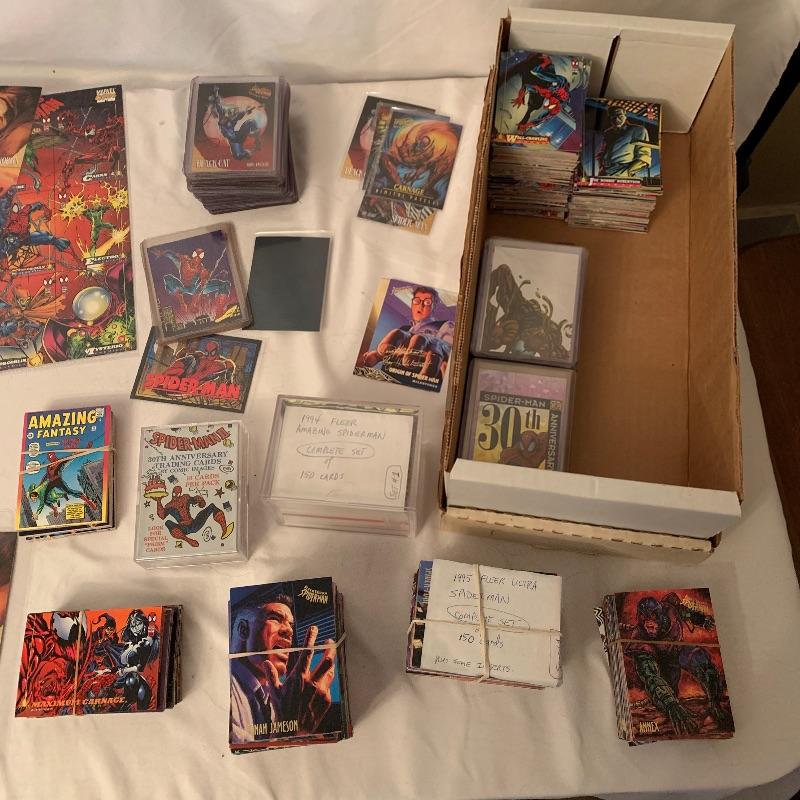 This collection has 30th Anniversary Spider-Man II TRADING CARDS, 1995 Fleer Ultra Spider-Man, 1994 Fleer Amazing Spider-Man, Limited Edition, Fleer Ultra Spider-Man Golden Web, Masterpiece and Holoblast. X-men collection has 1995 Fleer Ultra, 1995 Fleer Ultra x-men Chromium, 1994 Fleer Ultra and more. A few uncut card pages also.