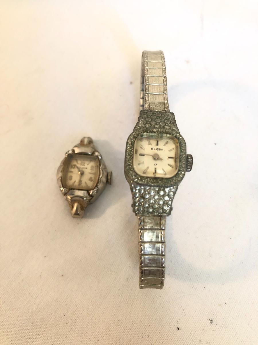A total of eight ladies timepieces here that includes a vintage Bulova face and an Elgin watch. The Bulova has no band. Other brands include Timex and Chairish, See images for more information on the other watches.