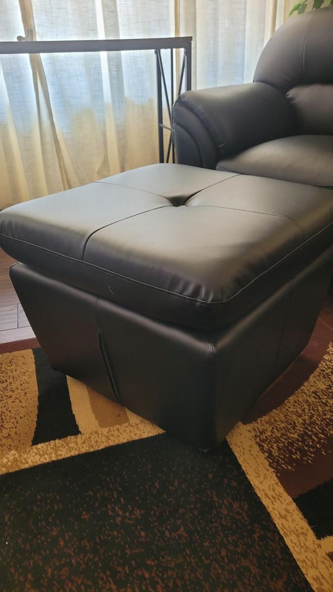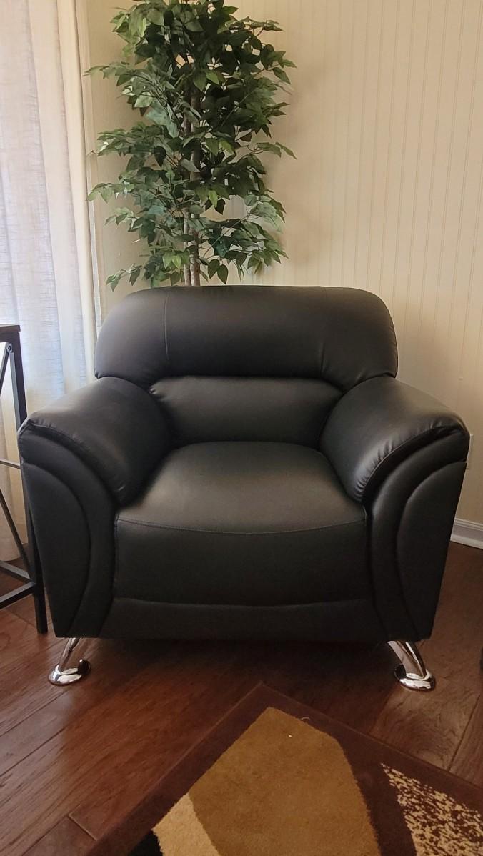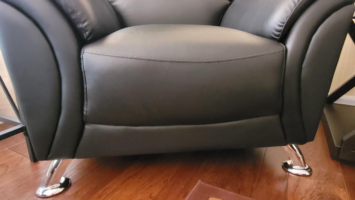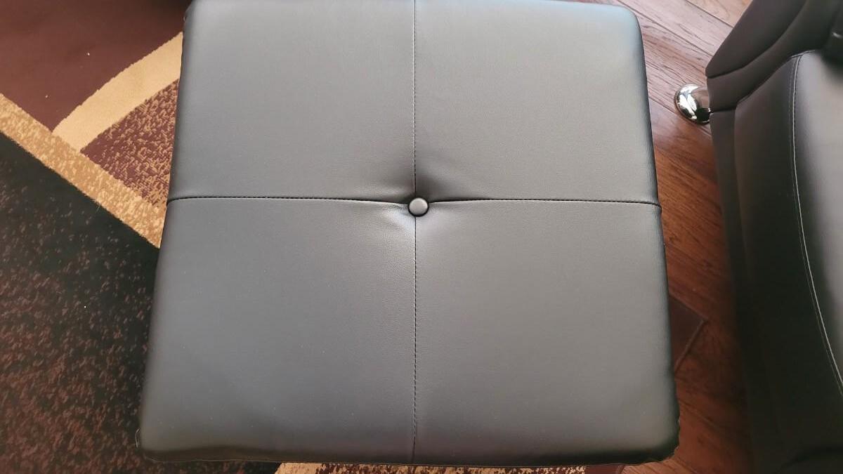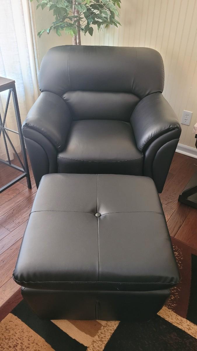 Lot 64: American Furniture Warehouse 'San Francisco Collection Chair and Ottoman' Black Durahide with Chrome Feet