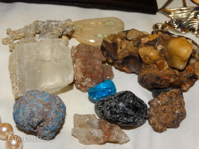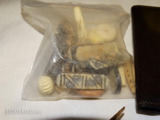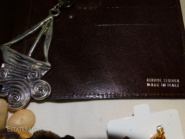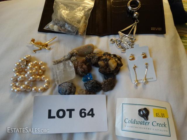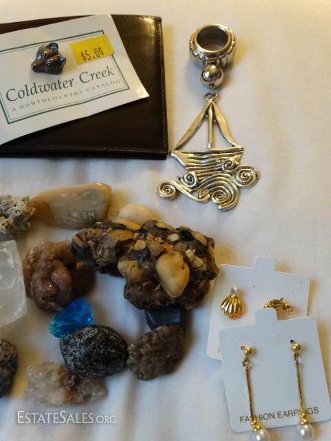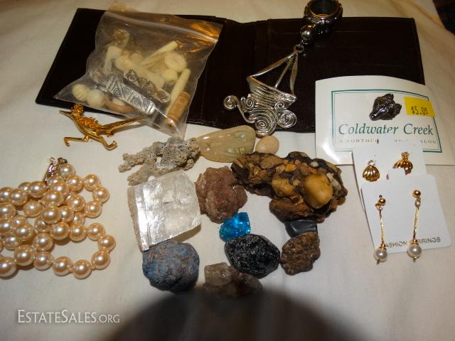 Gemstones, ship necklace pendant, pearls, beads, leather mens wallet, Coldwater Creek wolf pin, surgical steel post earrings.