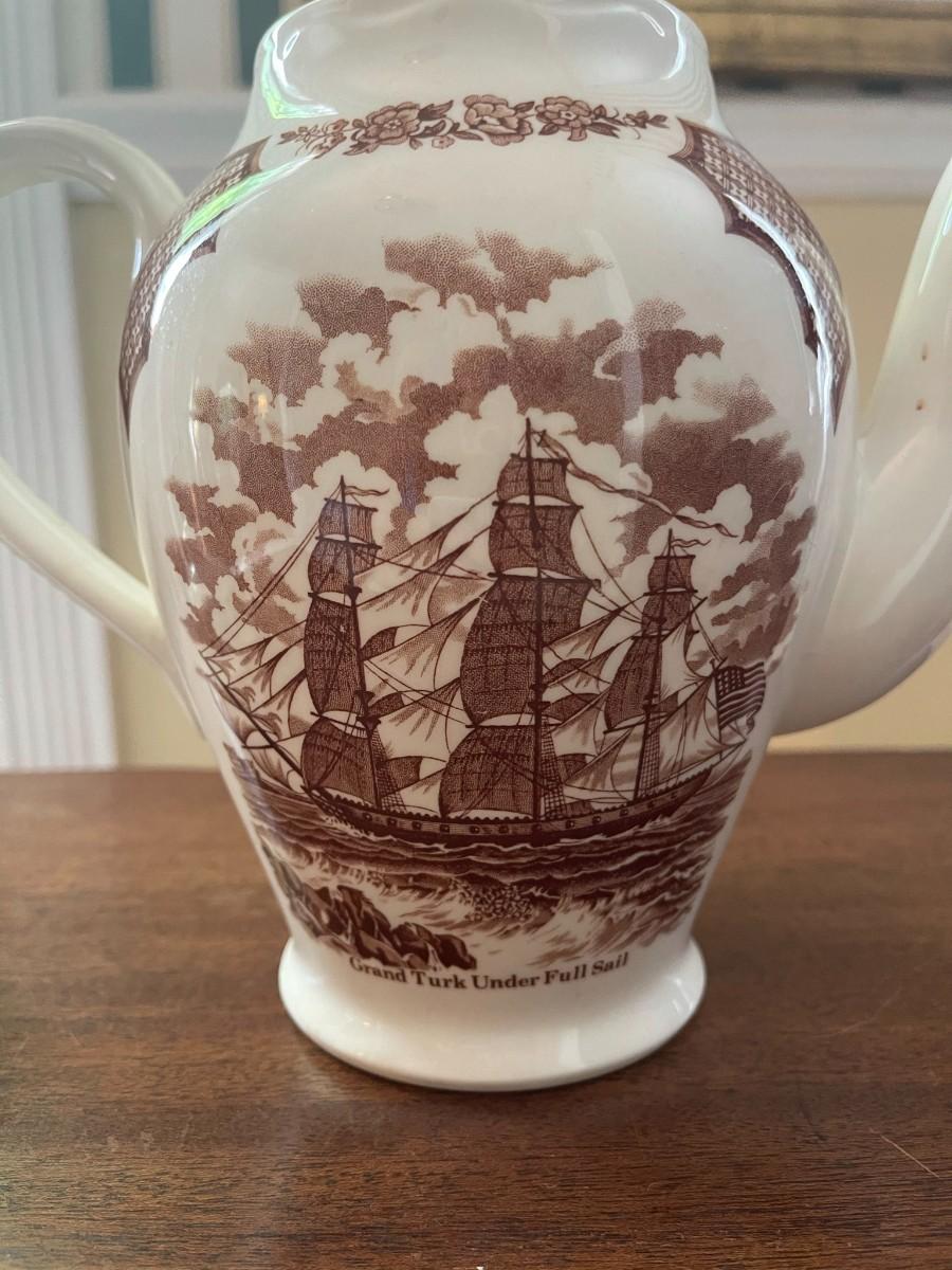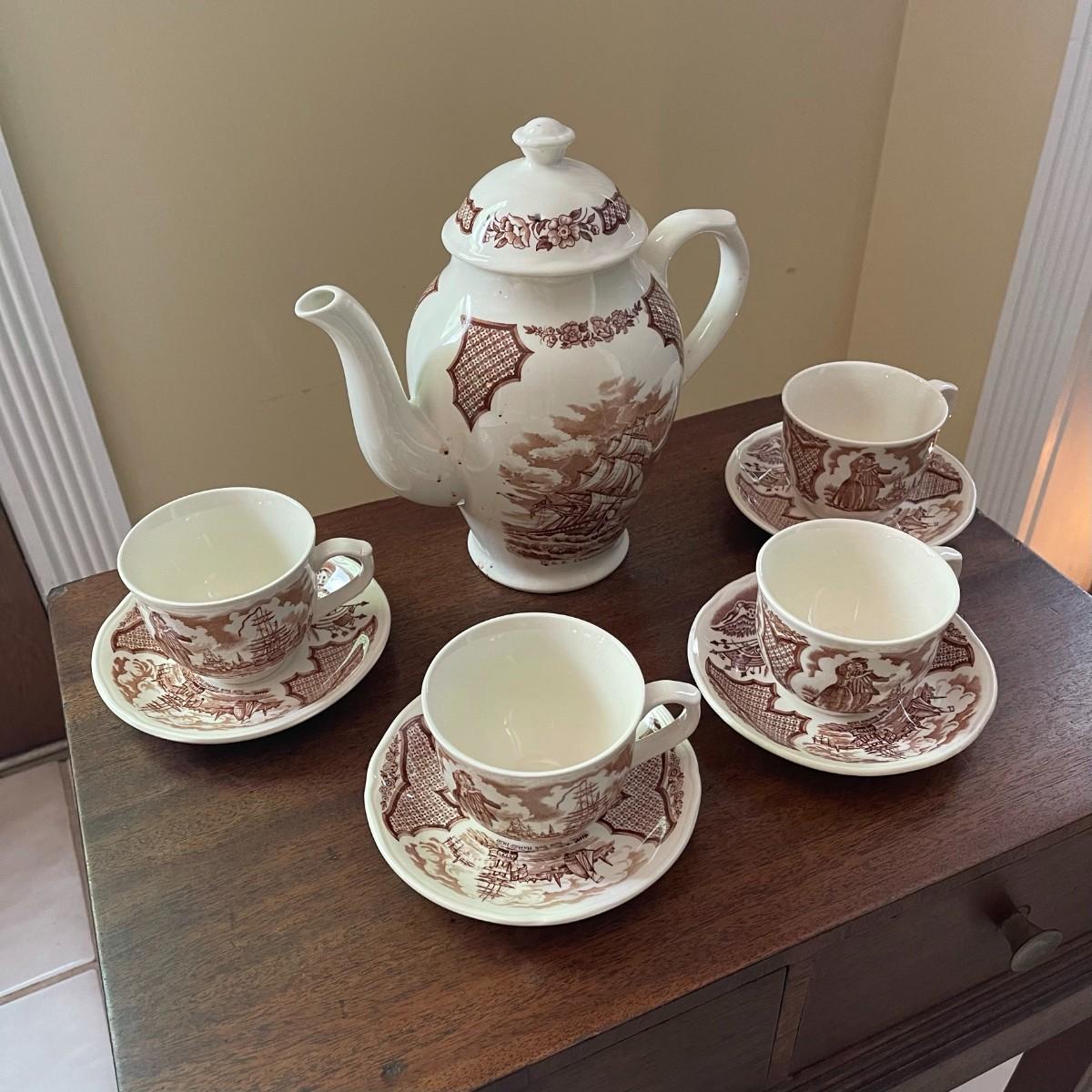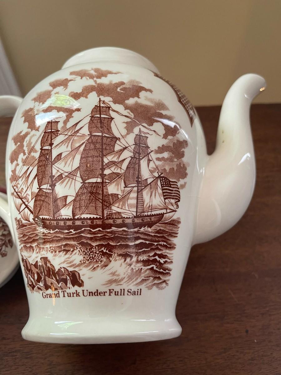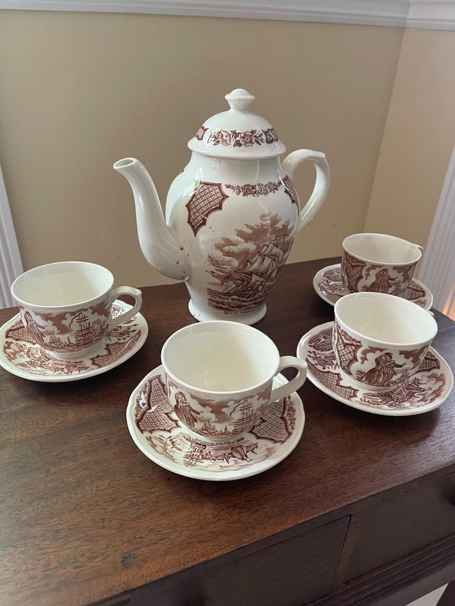 Alfred Meakin, Fair Winds, Brown, Set of Teapot and 4 Tea Cups/4 Saucer Plates. Visuals include Sailors Farewell, NY State Seal and NY Harbor 1830