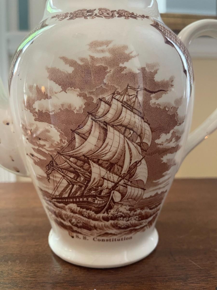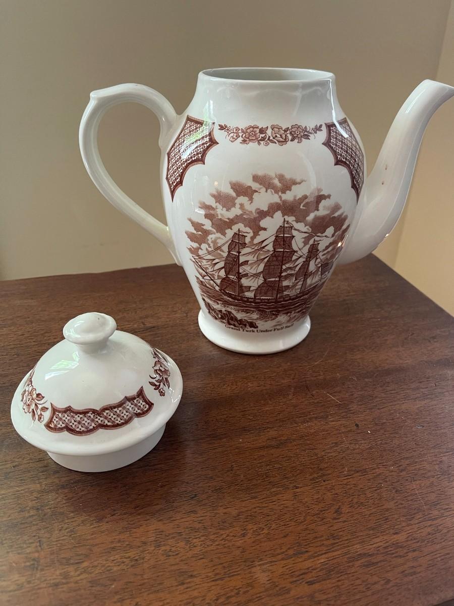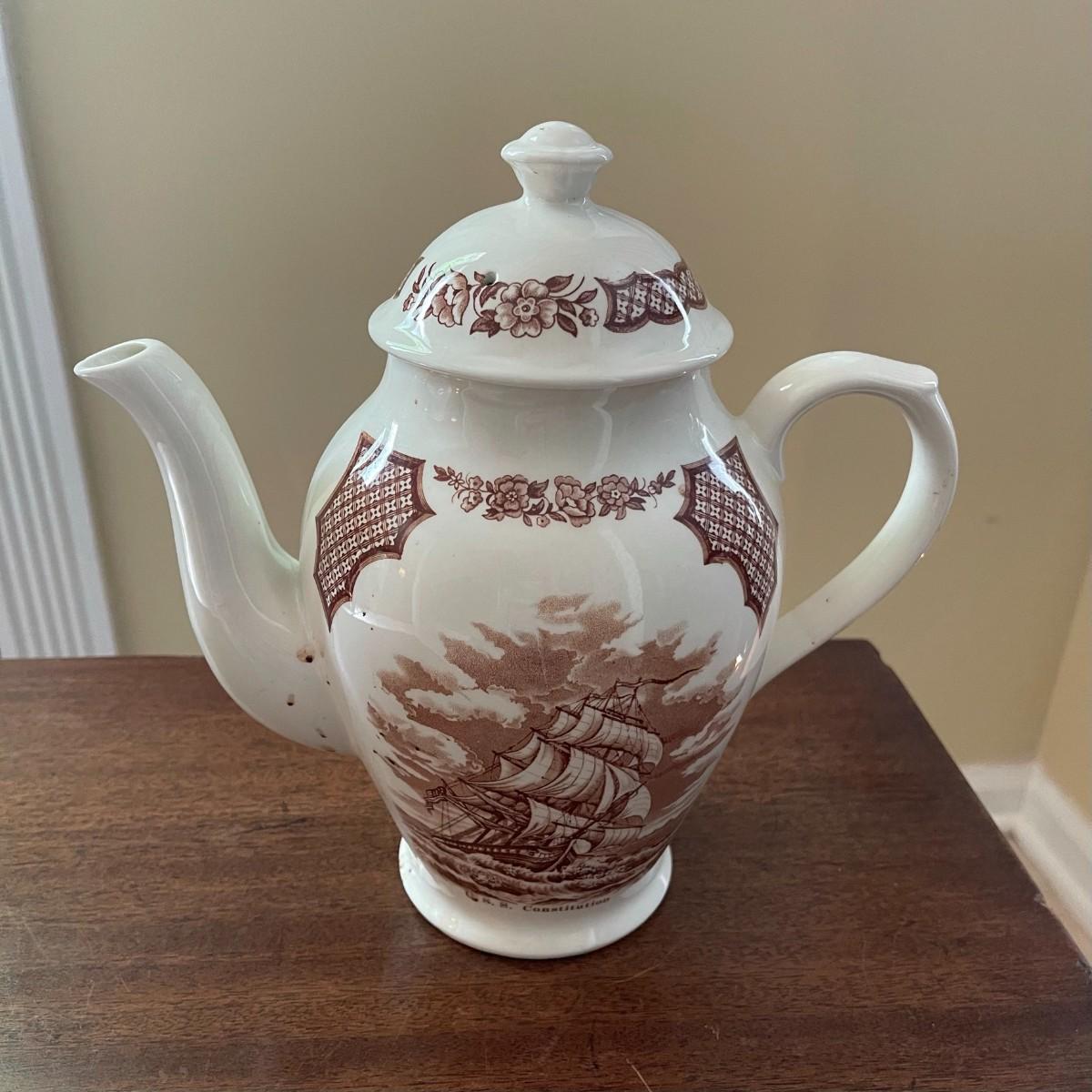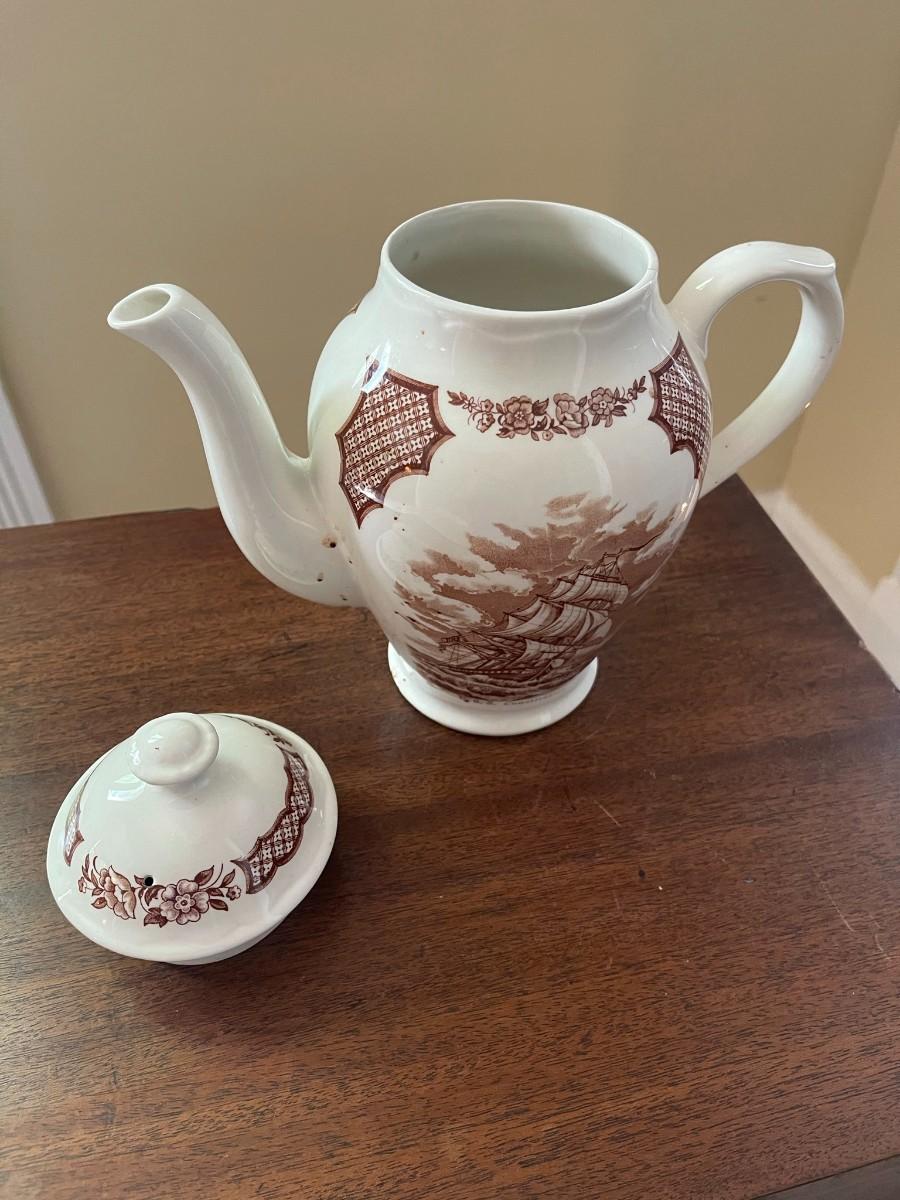 Alfred Meakin, Fair Winds, Brown, Set of Teapot and 4 Tea Cups/4 Saucer Plates. Visuals include Sailors Farewell, NY State Seal and NY Harbor 1830