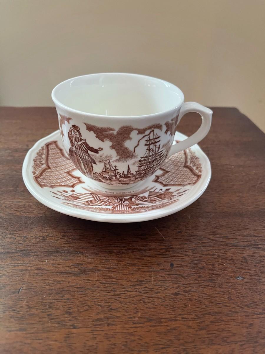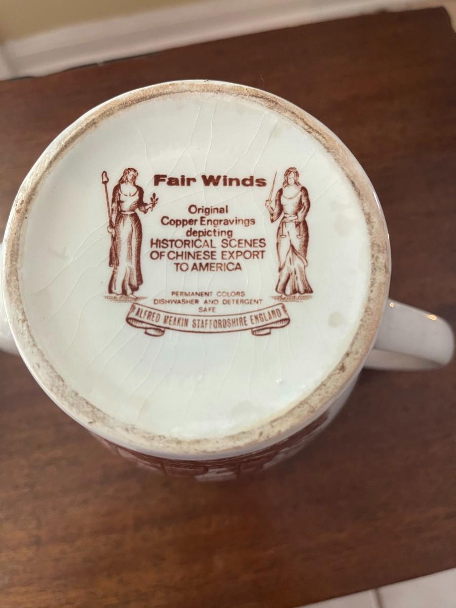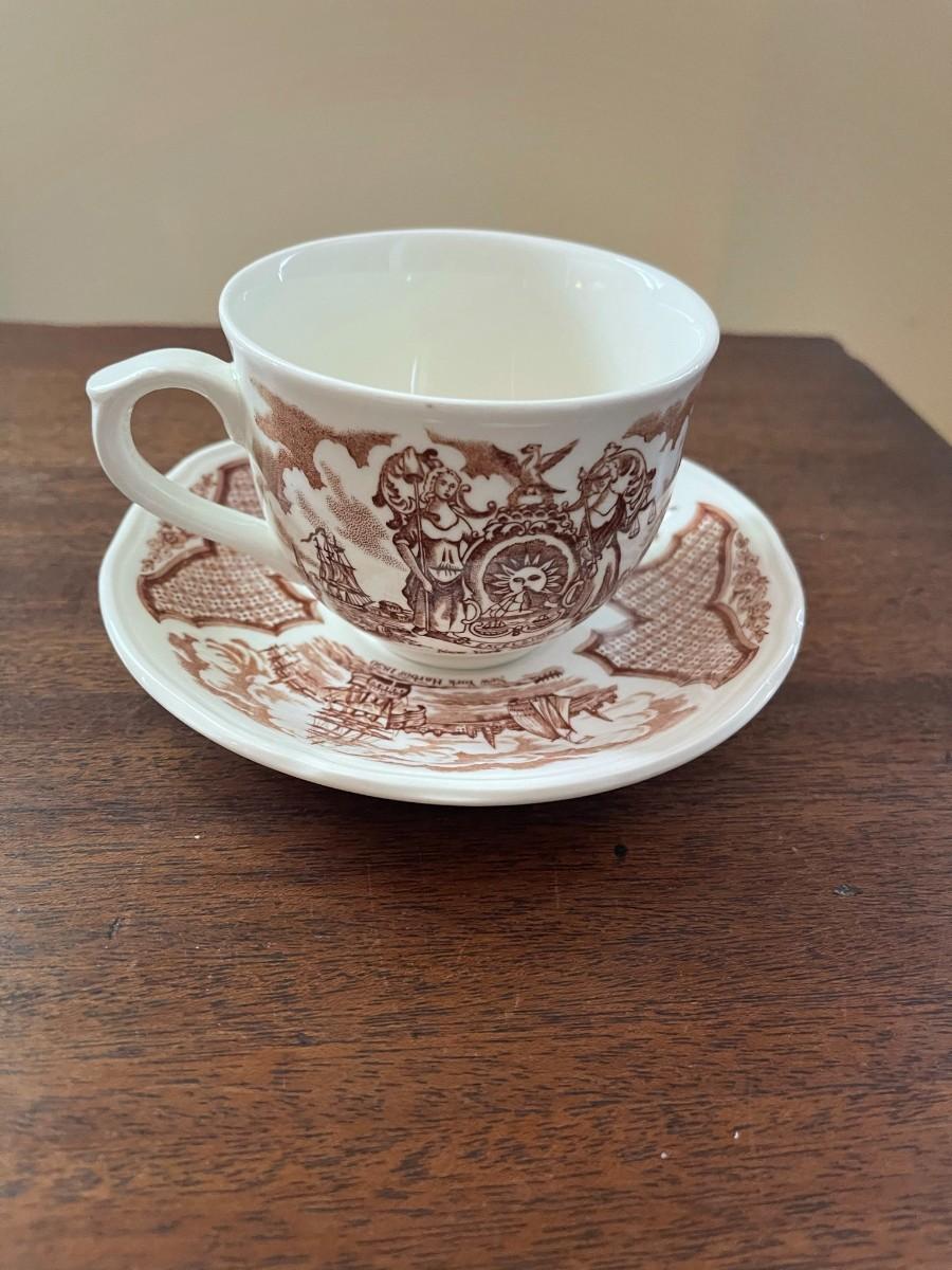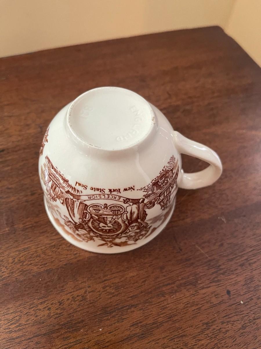 Alfred Meakin, Fair Winds, Brown, Set of Teapot and 4 Tea Cups/4 Saucer Plates. Visuals include Sailors Farewell, NY State Seal and NY Harbor 1830