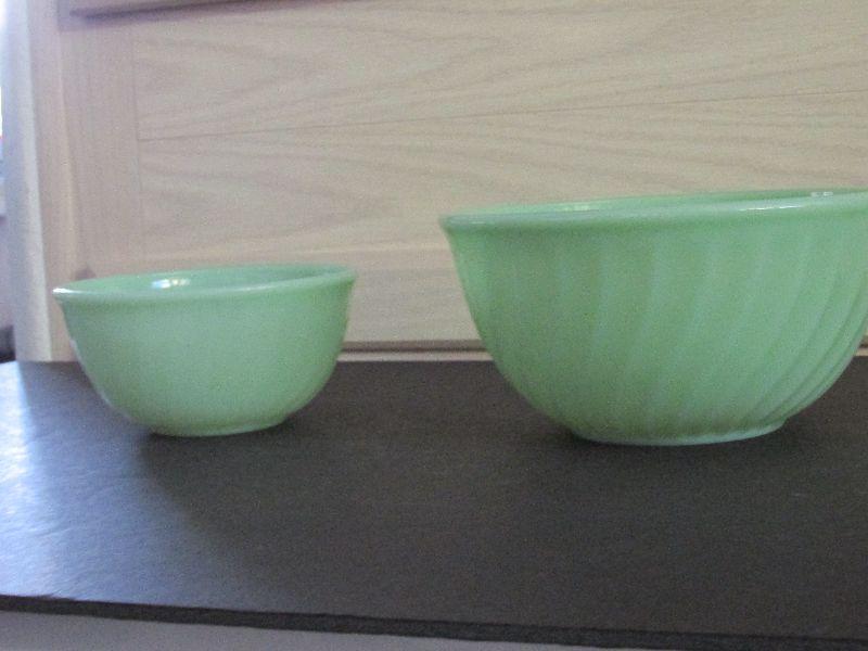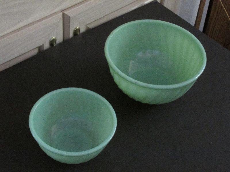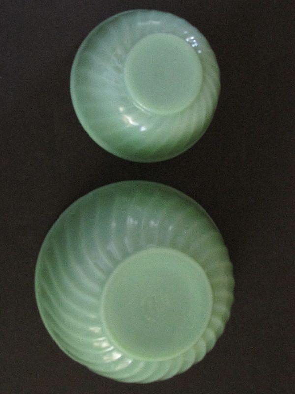 Set of two Anchor Hocking Fire King Jadeite Swirl mixing bowls. 6" and 8". Small chip in smaller bowl and some blackish marks around rim on larger bowl.