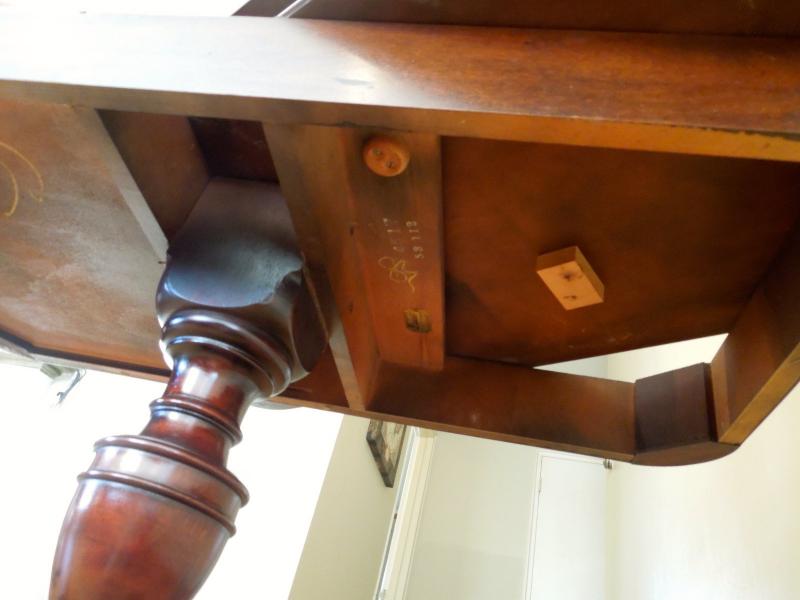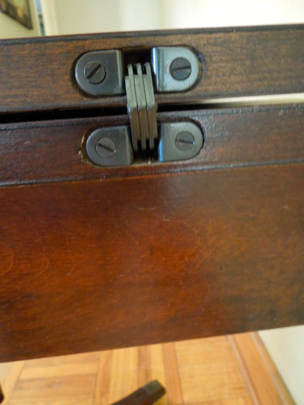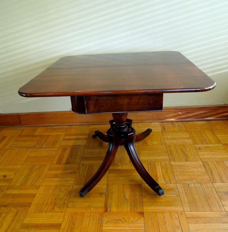 This is a lovely antique table that can be used as a side table or dining table. Unique design. The top lifts and folds so that it converts to a dining table when revolved. Has internal room for storage. Structurally sound. Some surface scratching, but no major gouges. Measures 38" L x 19" W x 31" H closed and 38" W when open