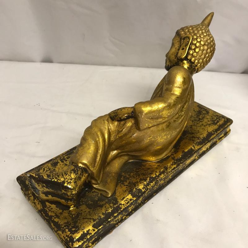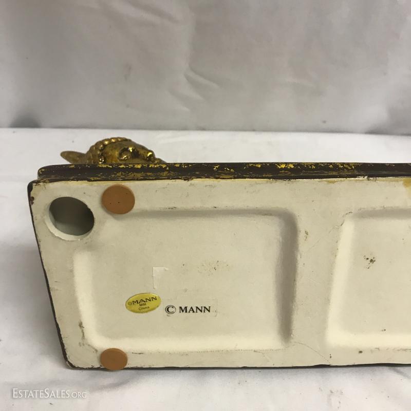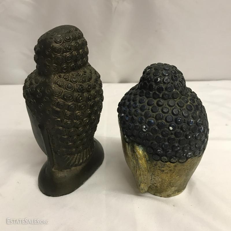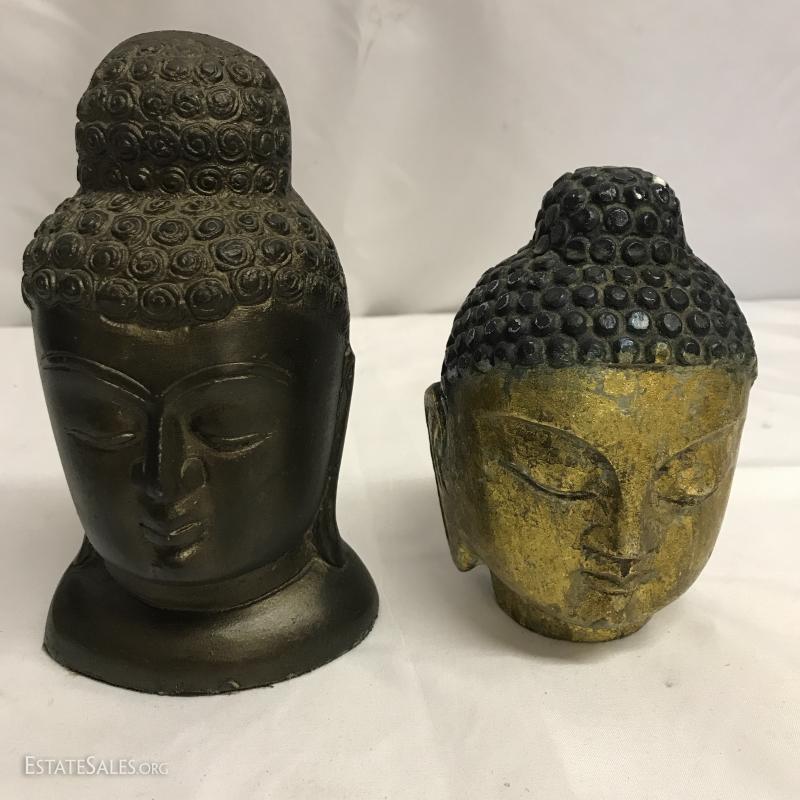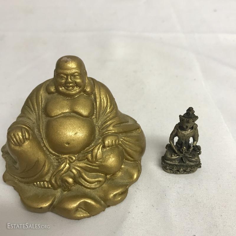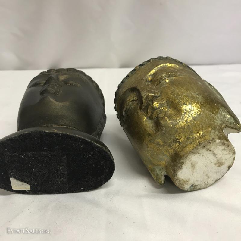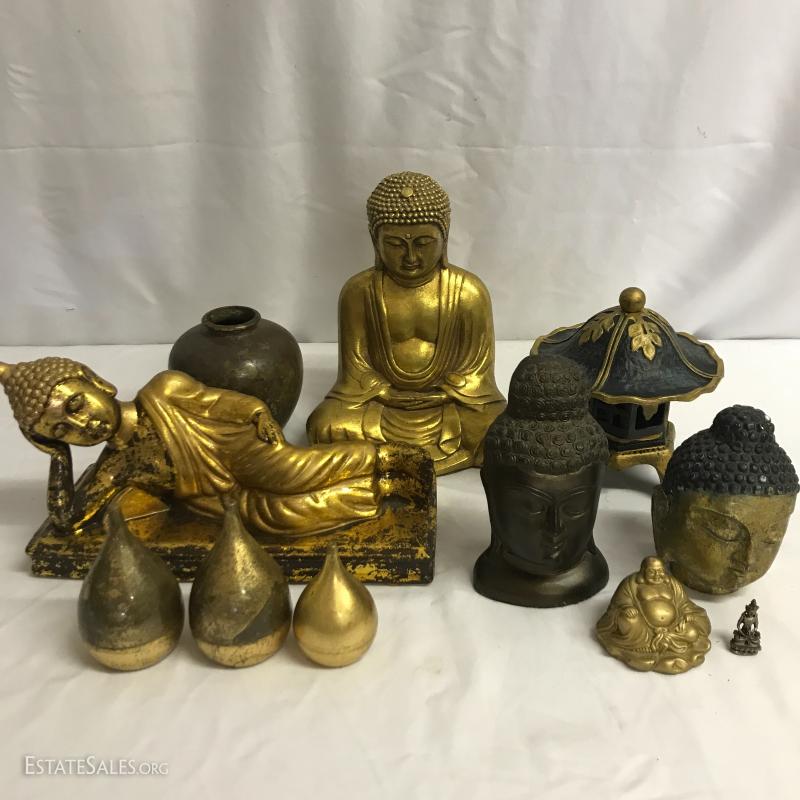 Faces, statues, case and candle holder. Variety of materials. Brass base is 5" tall with nice color. Tall sitting statue is 8.5" tall. Laying down statue is 11"l x 5"w x 6" h.