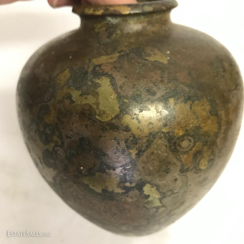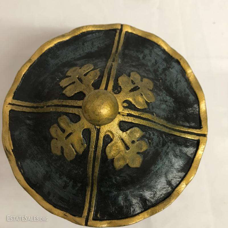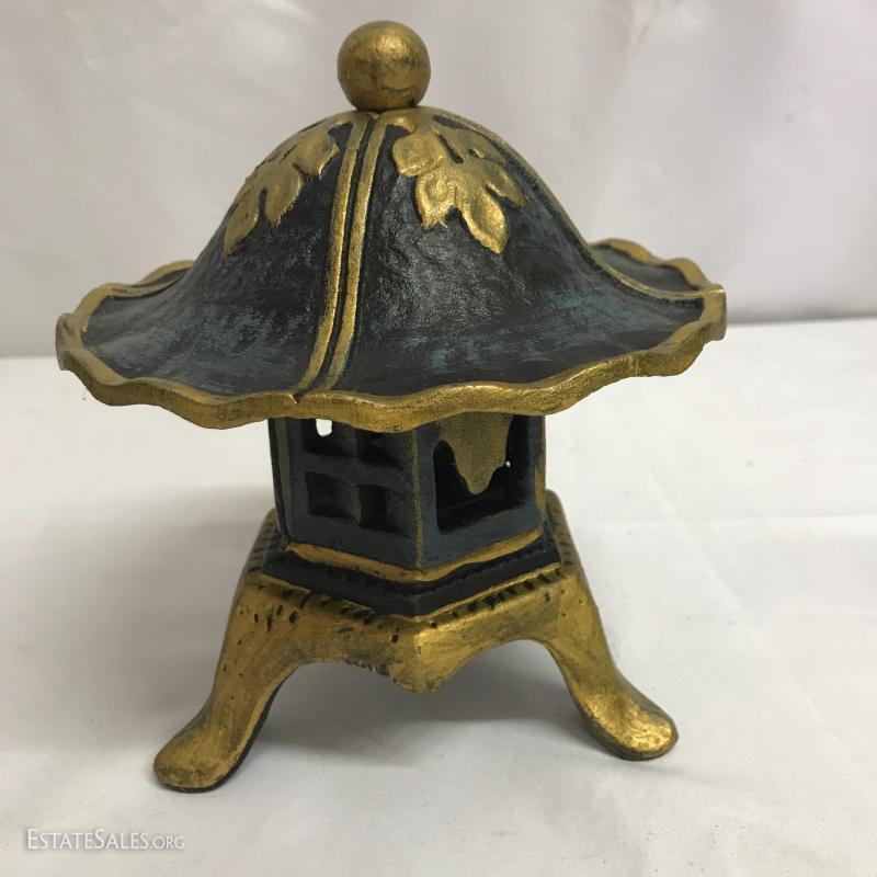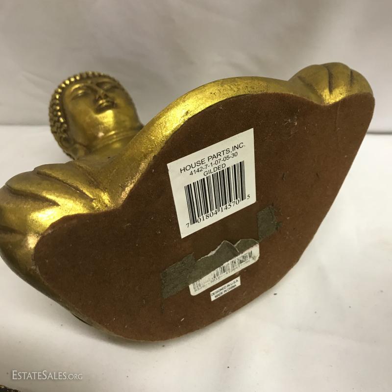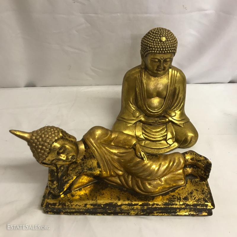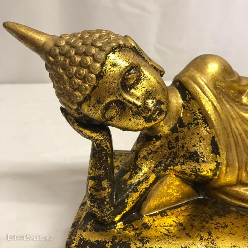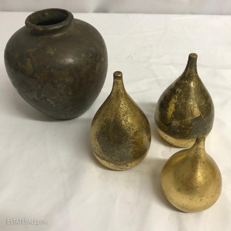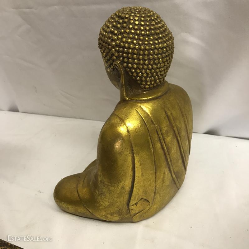 Faces, statues, case and candle holder. Variety of materials. Brass base is 5" tall with nice color. Tall sitting statue is 8.5" tall. Laying down statue is 11"l x 5"w x 6" h.