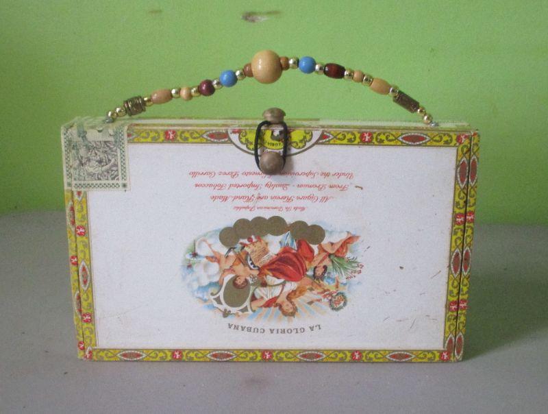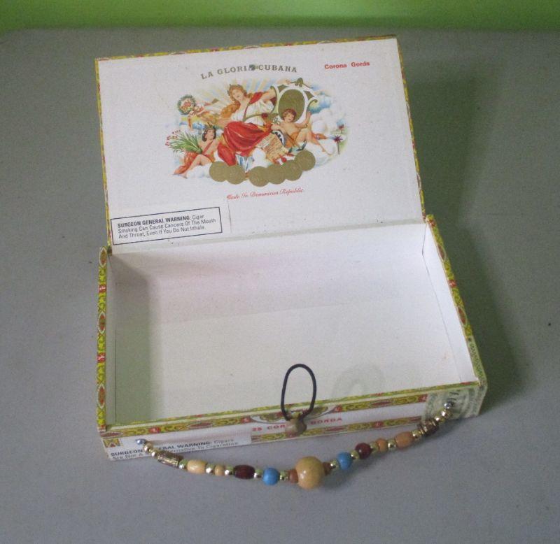 The cigar box is made of wood and measures 11" x 6.5" x 2".