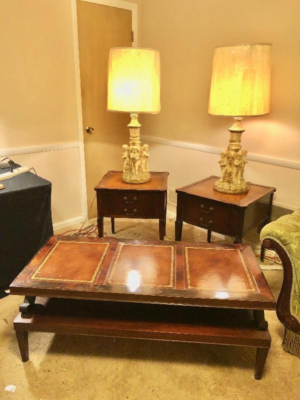 Lot 64 - Coffee Table, 2 End Tables on wheels and 2 Lamps