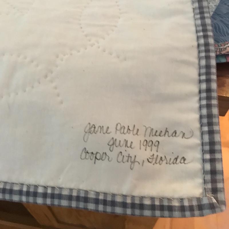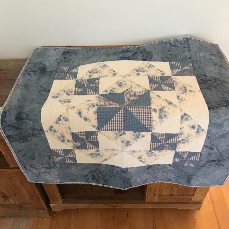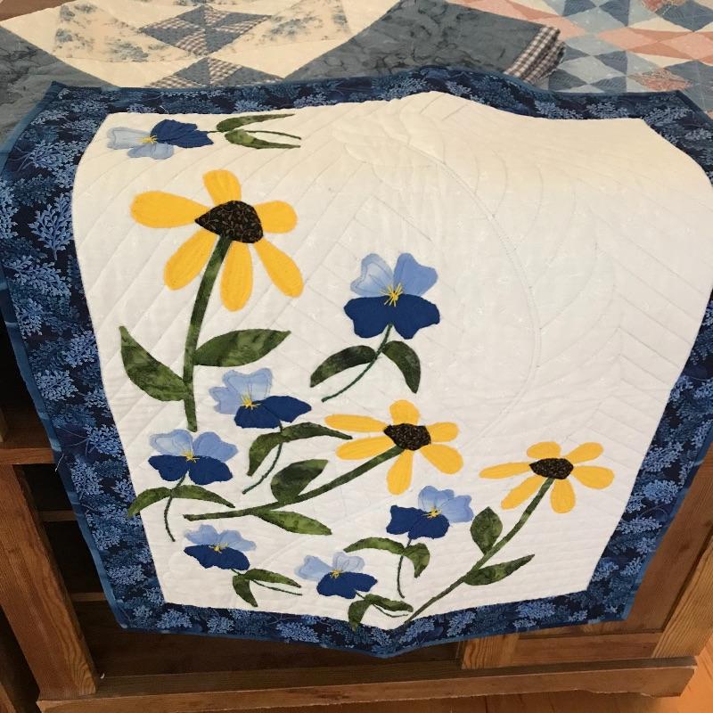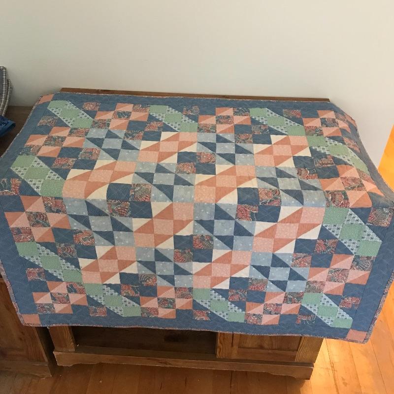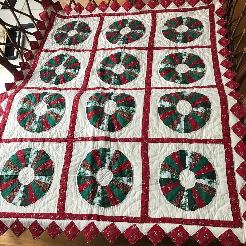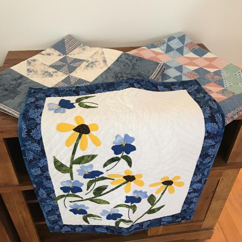 Four small hand stitched quilts and a woven green throw. Some have quilters name and location. Smallest quilt has blue pansies measures 22" X 28". The largest of them is the Christmas quilt measuring approx. 48 "x 54". All in good condition. Shipping available.