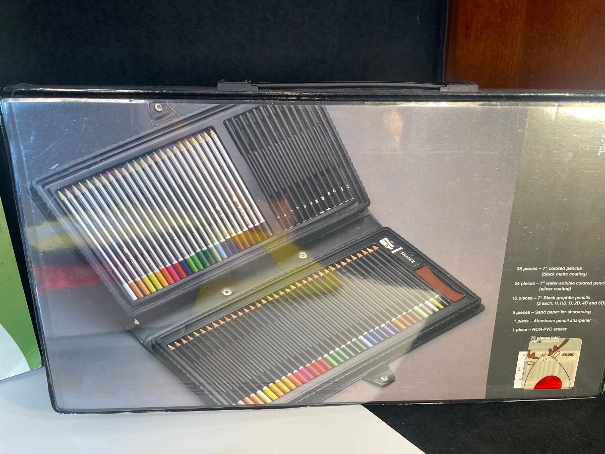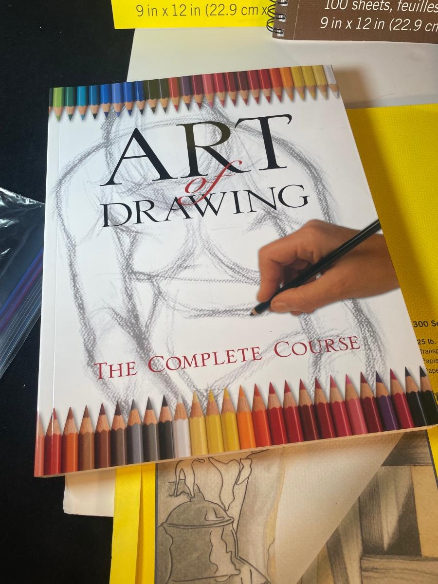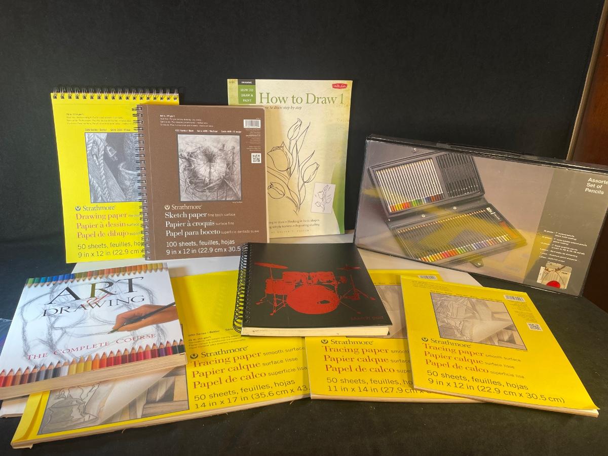 "Art of Drawing" book, "How to Draw 1" book, two pads of drawing/sketch paper, unopened 72 pc set of drawing pencils, blank sketch book and three packs of tracing paper.