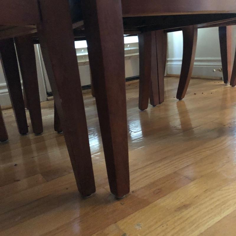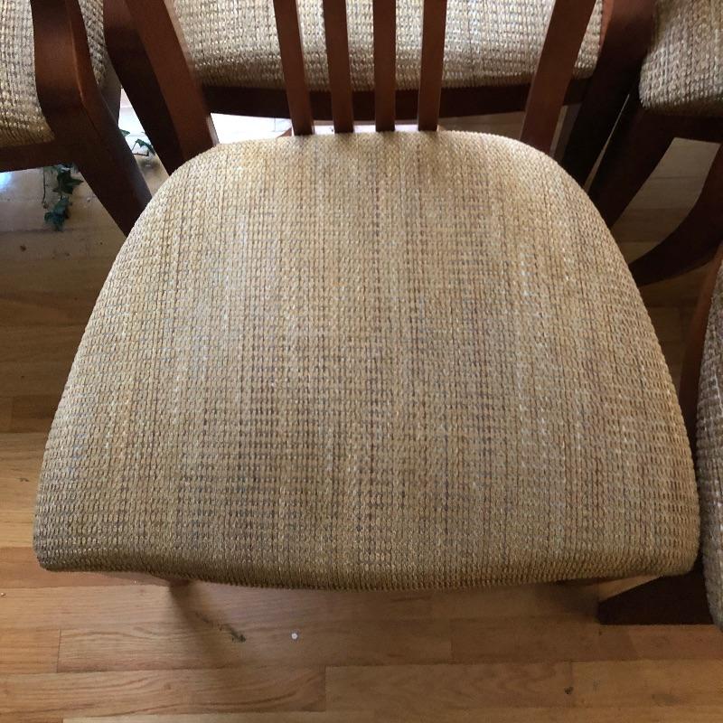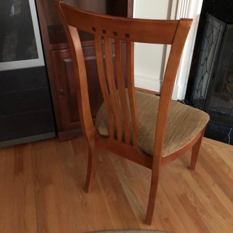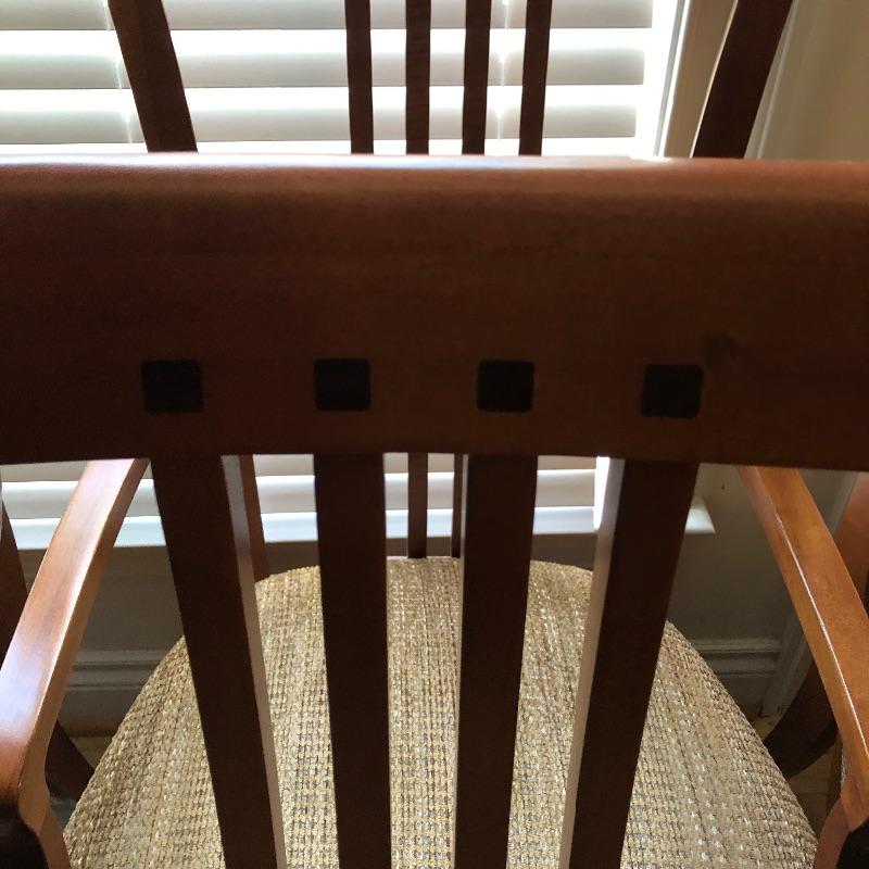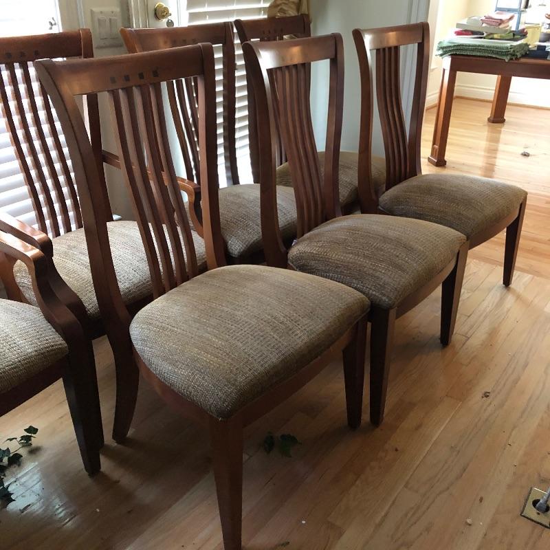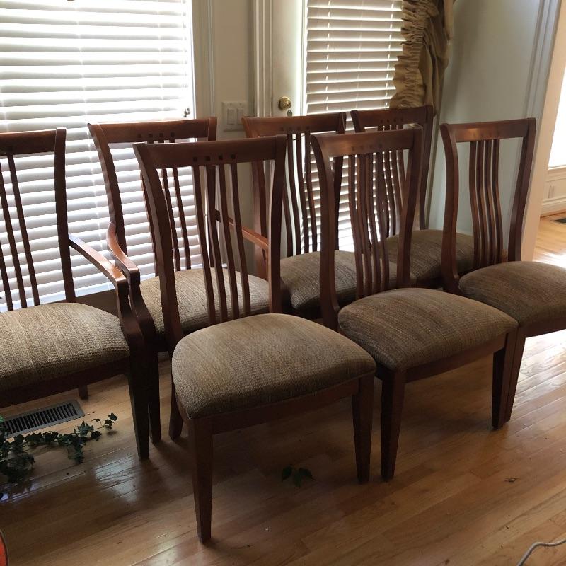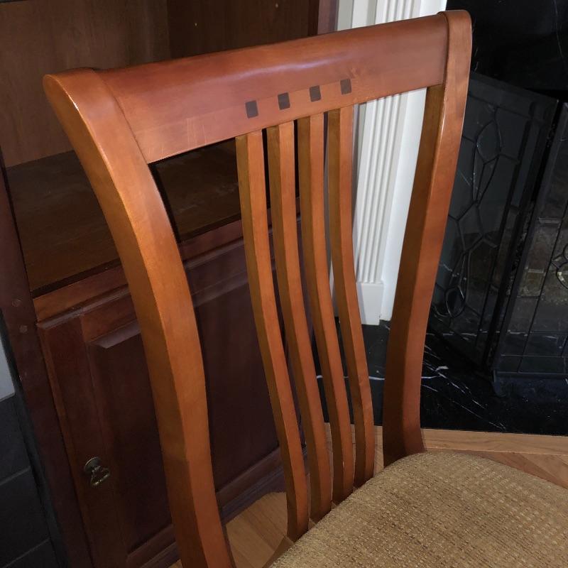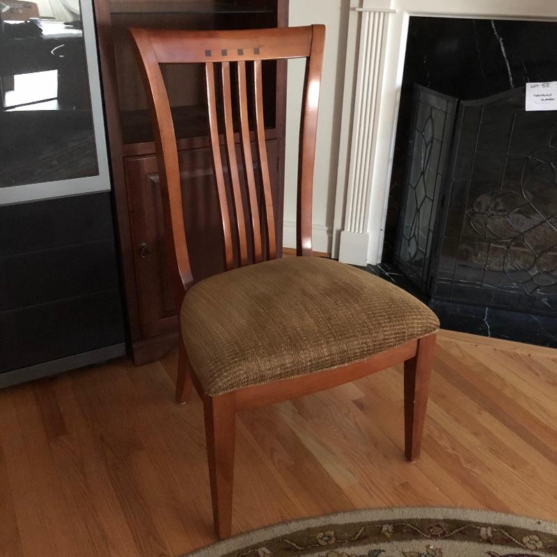 Beautiful set of eight Mission style dining chairs that go with the table in Lot 75. These sturdy and comfortable chairs are a warm medium toned wood with nice details that includes a gentle curve to the slatted chair backs. Seats are upholstered in a tan fabric. They measure 24”w x 18”d x 42”h and the seat is 18” h.