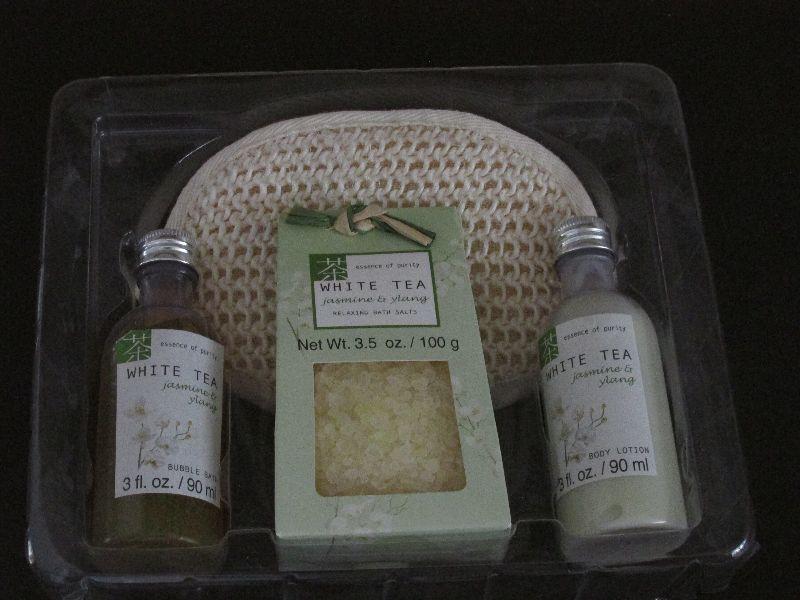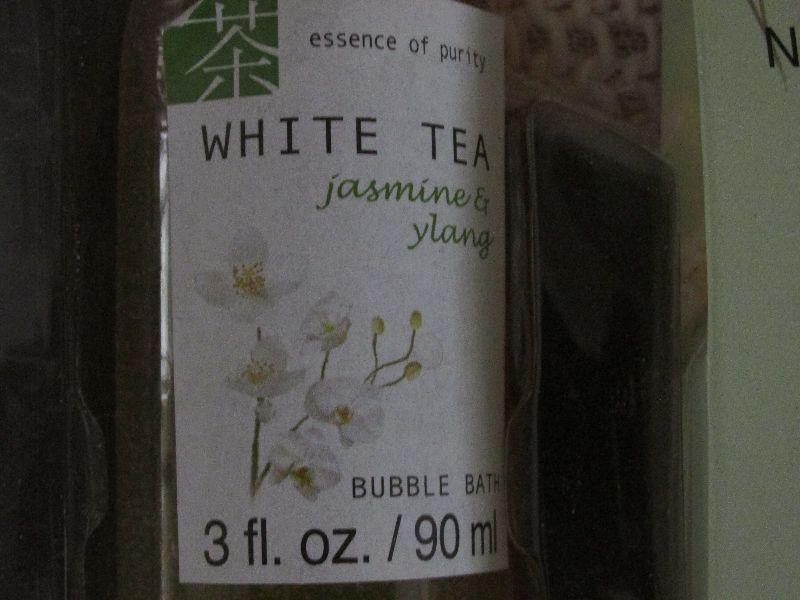 New, never opened. Essence of Purity White Tea bubble bath set.