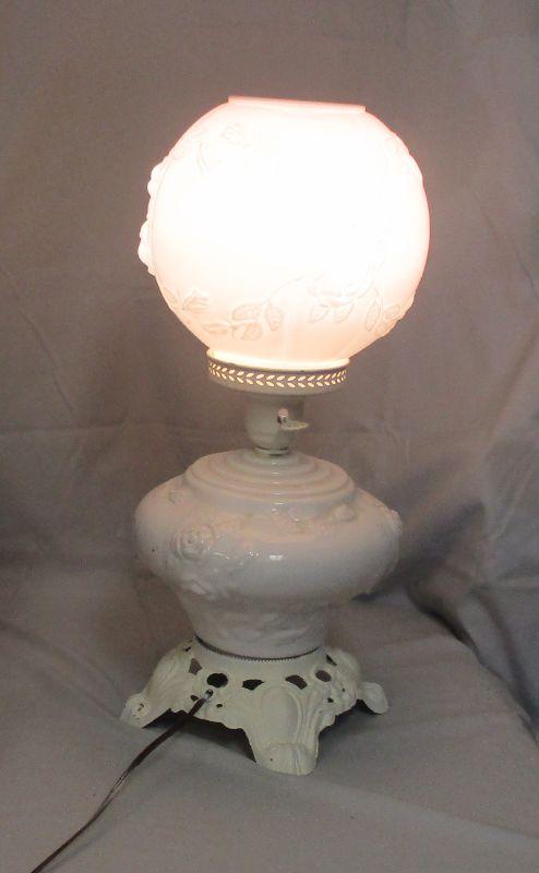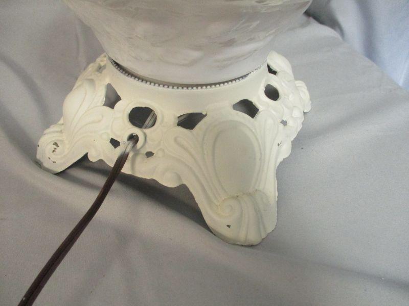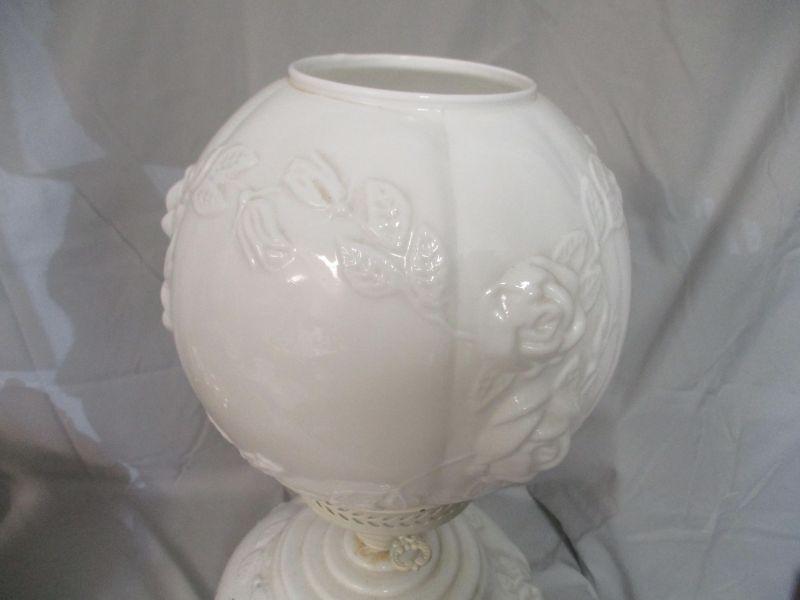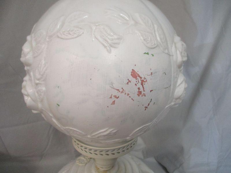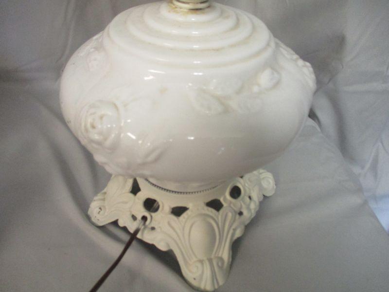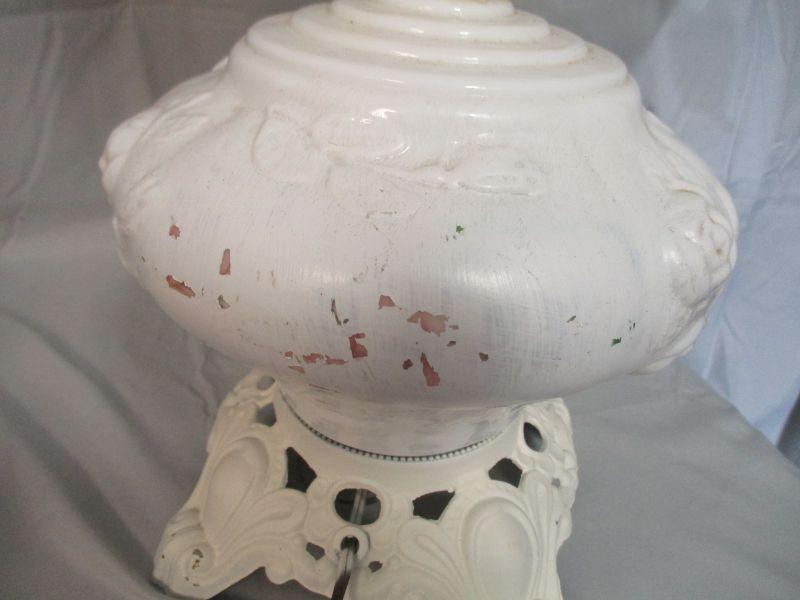 Overall, this lamp is in very good condition. There is not a chimney, but the glass base and glass shade are free of damage. They both appear to have had a rose design placed on them that was later painted over (that's the paint issue you see on the top and bottom) which I think it all can be cleaned up or off. There is a small light in the base that should light up the base. It is 20" tall and it does work.