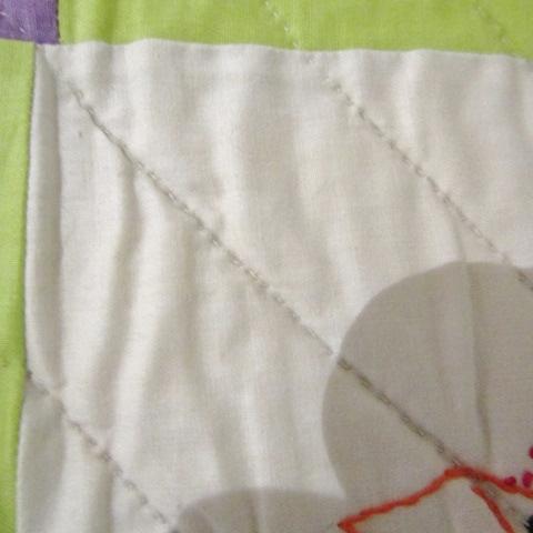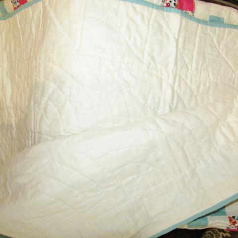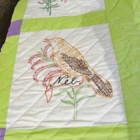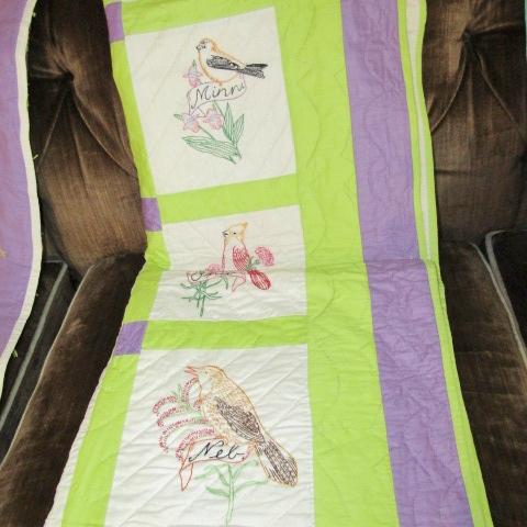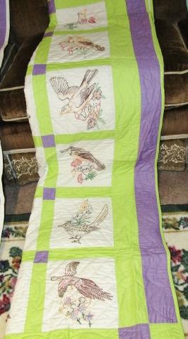 HAND STITCHED DOUBLE SIZE QUILT WITH EMBROIDERED BIRDS IN EACH BLOCK