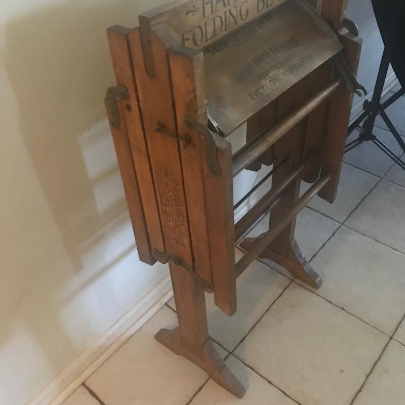 Antique wood and metal unit. Measures 45” x 18.5” x 38.5” when spread out and folds up to 12” wide at base. Local pick up only.