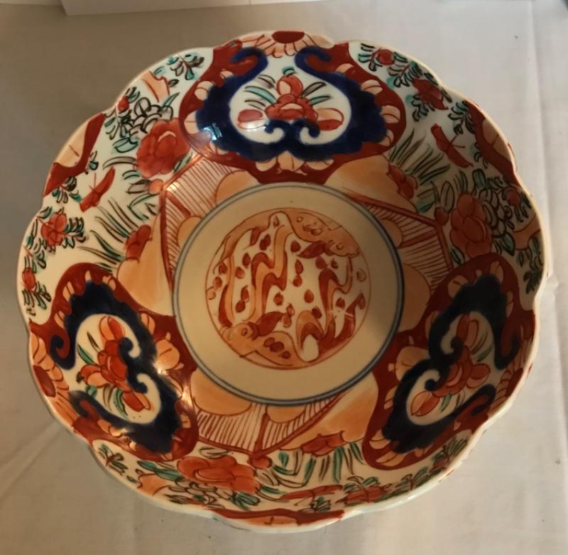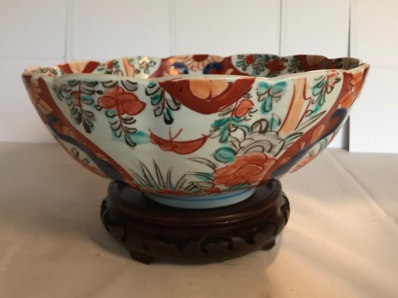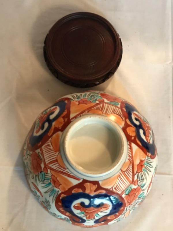 Chinese Imari bowl 9-1/2” diameter and 4” deep comes with stand. No chips or cracks