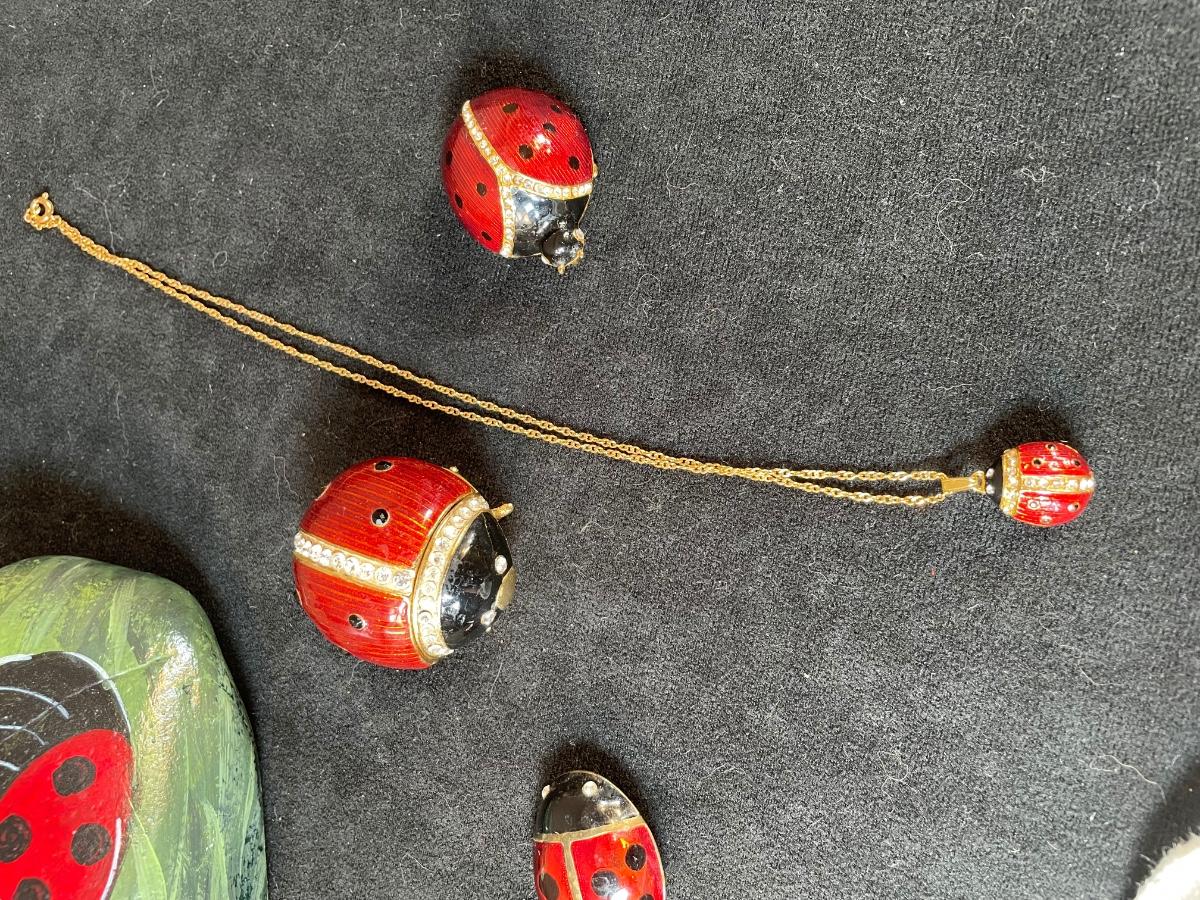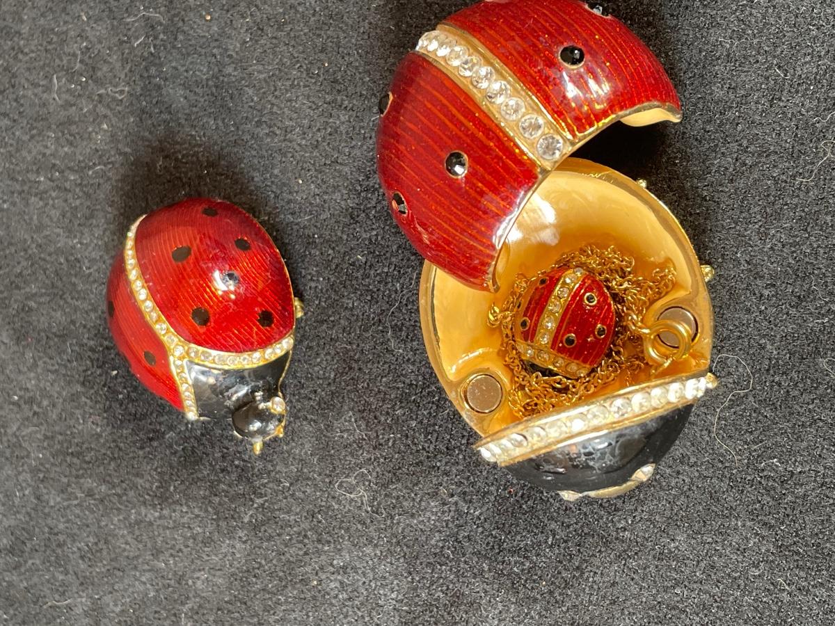 Lady bug trinket box holds a matching necklace and has a matching brooch