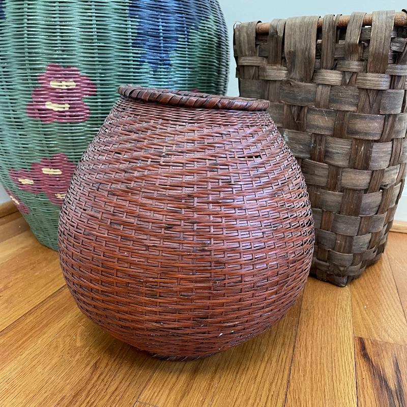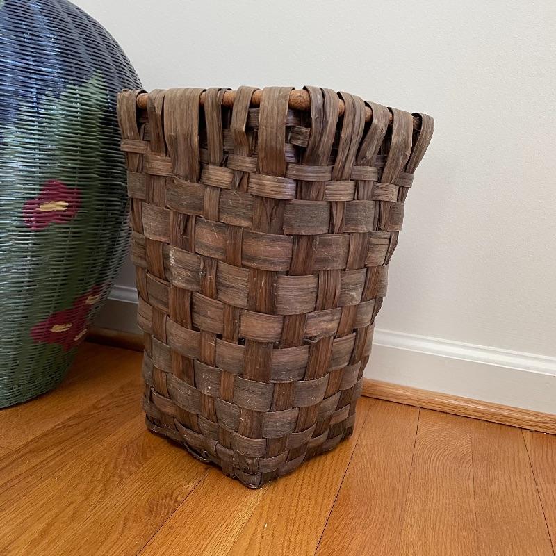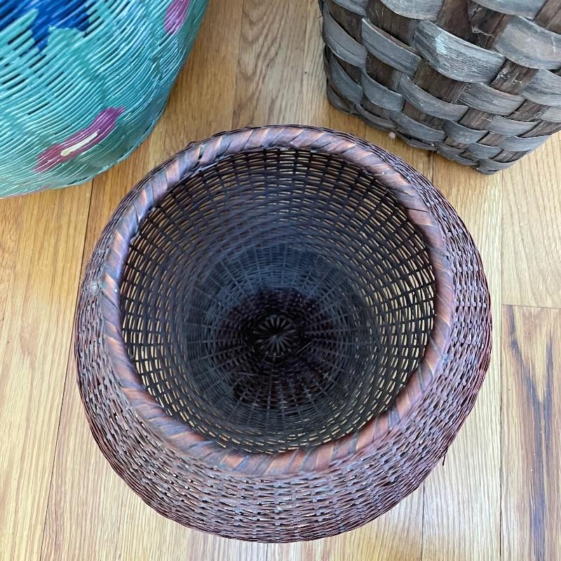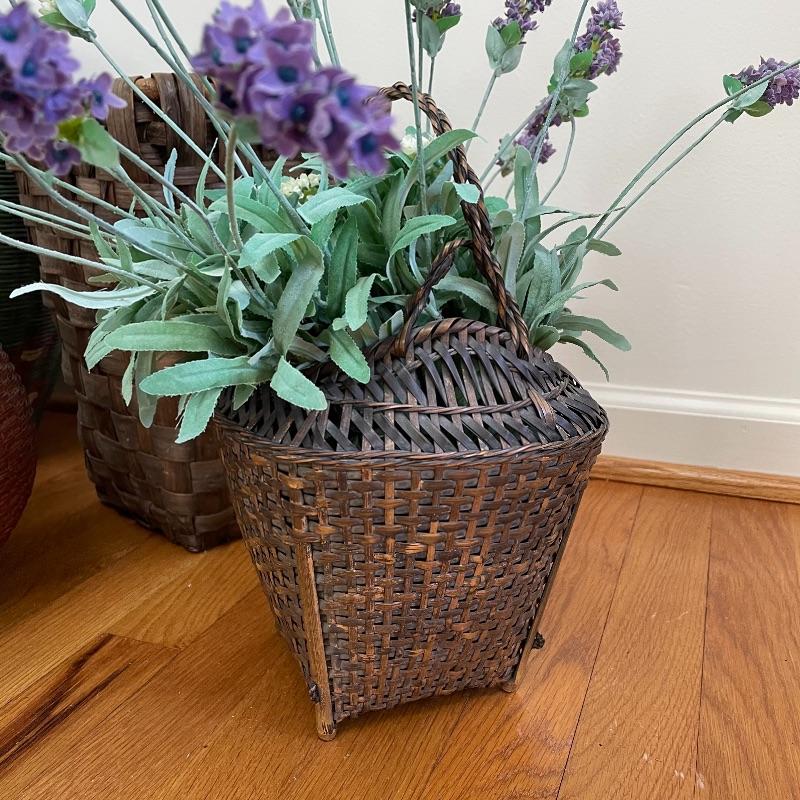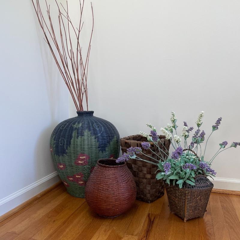 Stunning large floral painted woven basket with three smaller woven delights. The large urn shaped basket is painted 360° and comes with the decor you see in the photos. It appears to have a felt like material on its bottom, that will need to be replaced as the sticks fall through when basket is moved. Lot also features a lovely faux floral filled basket with handle and initials on the bottom. The other two baskets appear to be nice quality, although the rectangular basket was stored in the garage and needs some cleaning. Largest basket is approximately 16”d x 19”. See photos. Local pick up only.